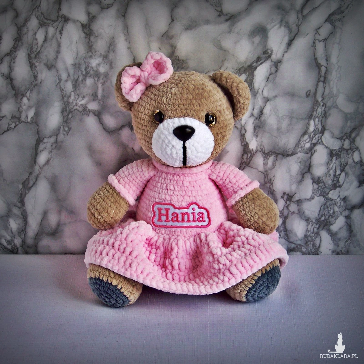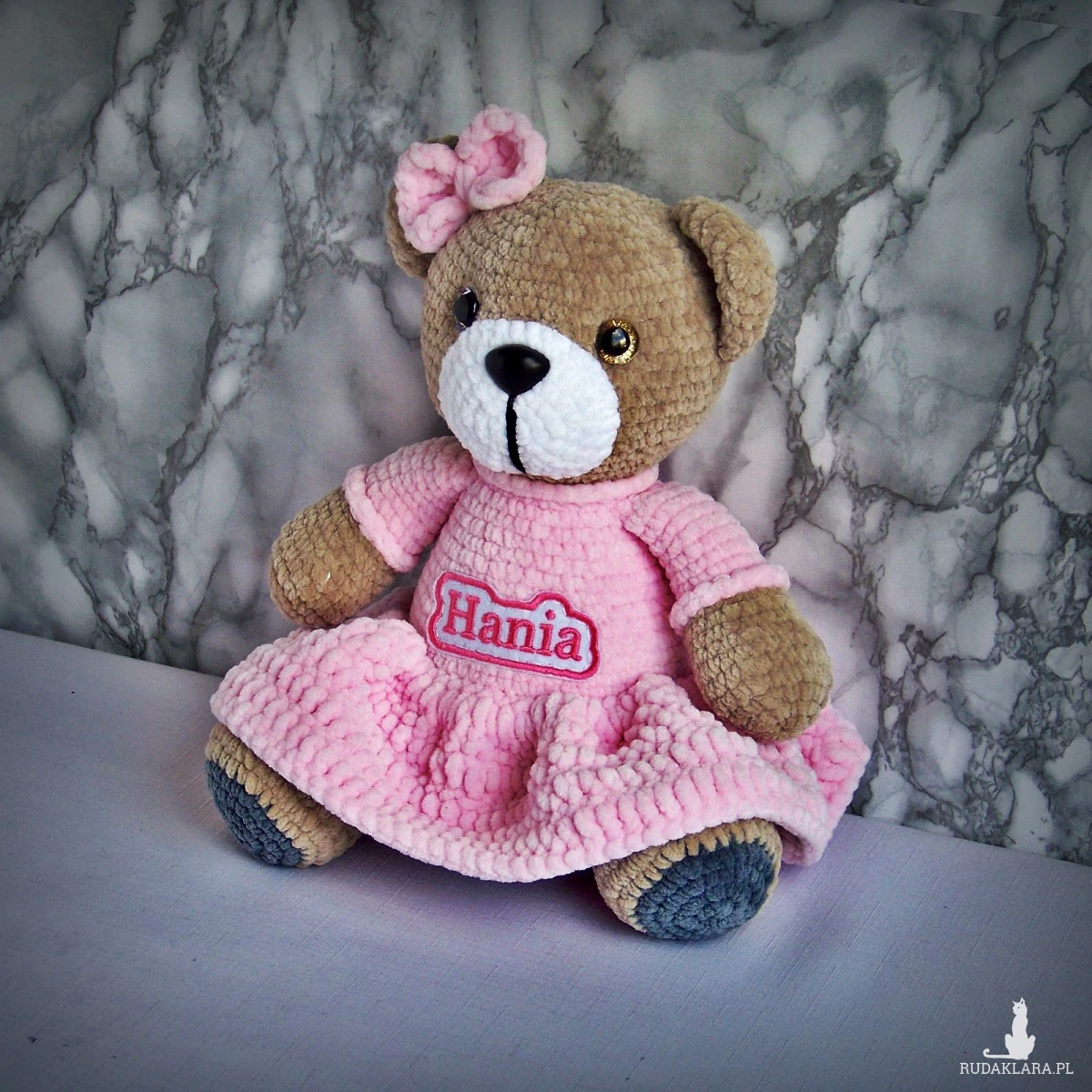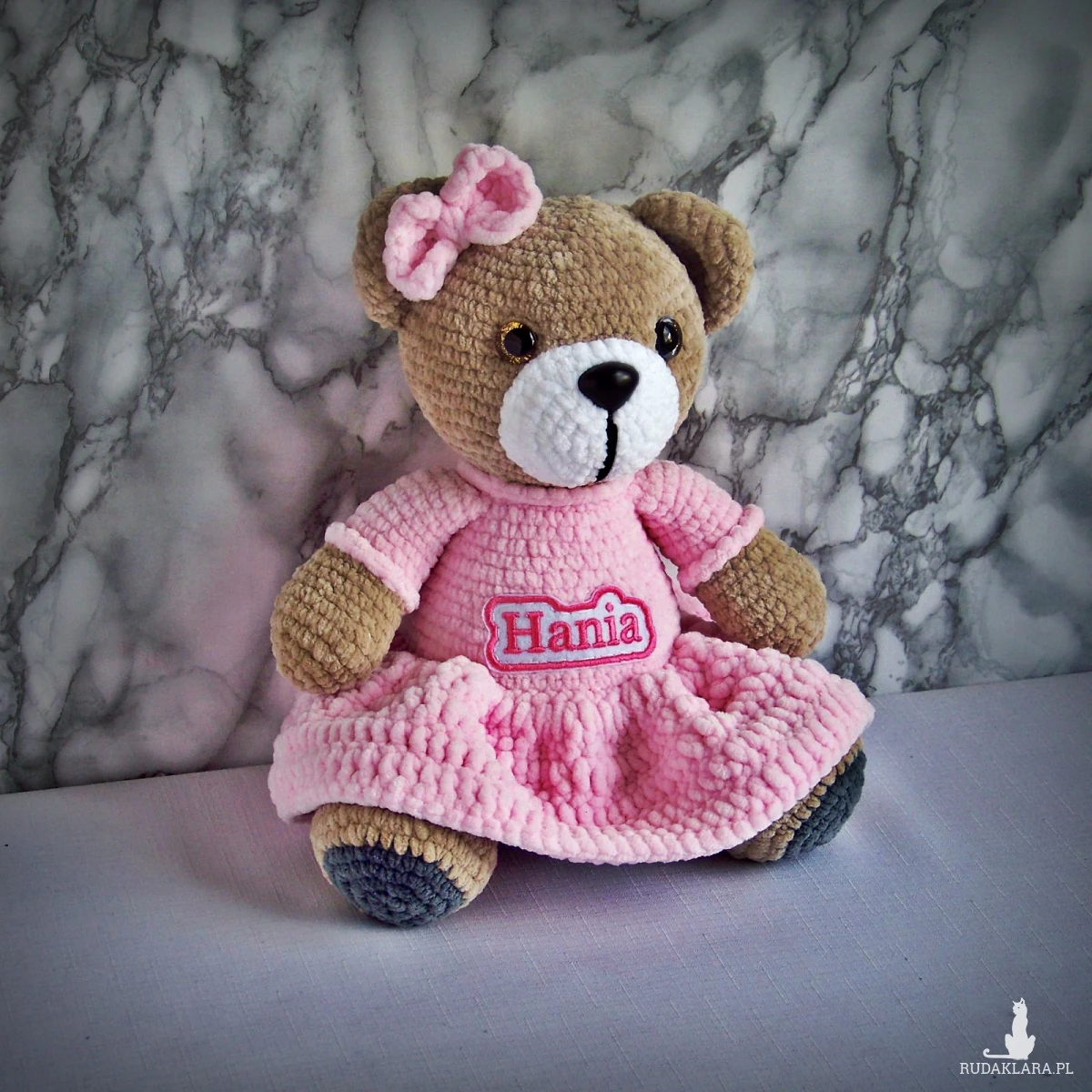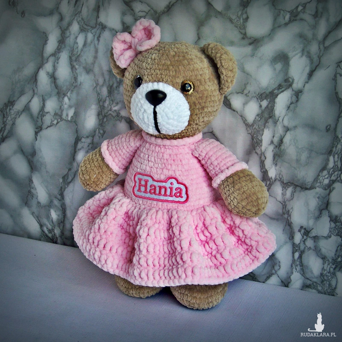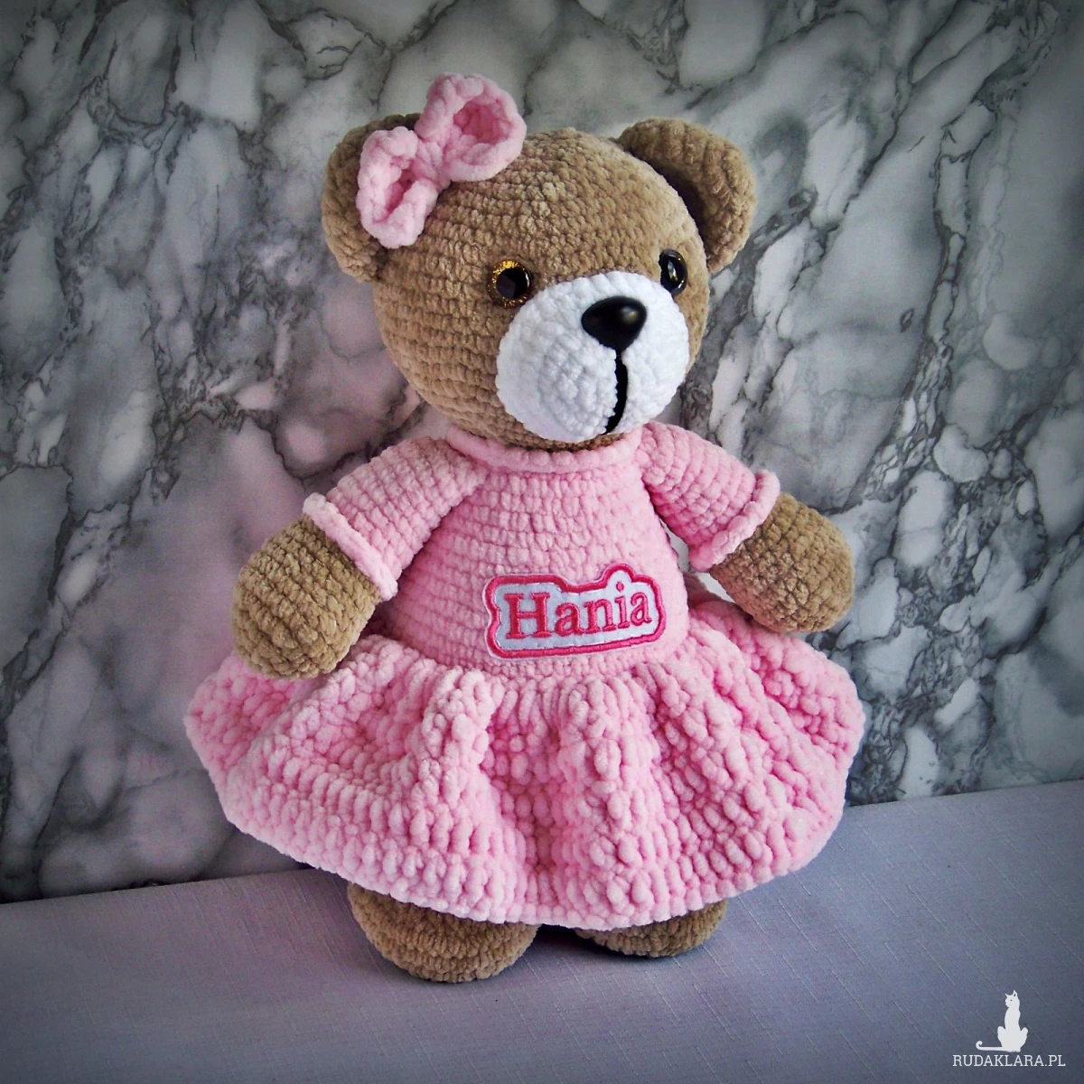 Szydełkowy miś Hania 32cm w jasnoróżowej sukience (na zamówienie)