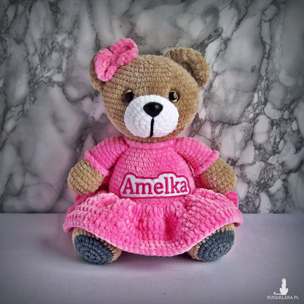 Szydełkowy miś Amelka 32cm w ciemnoróżowej sukience (na zamówienie)