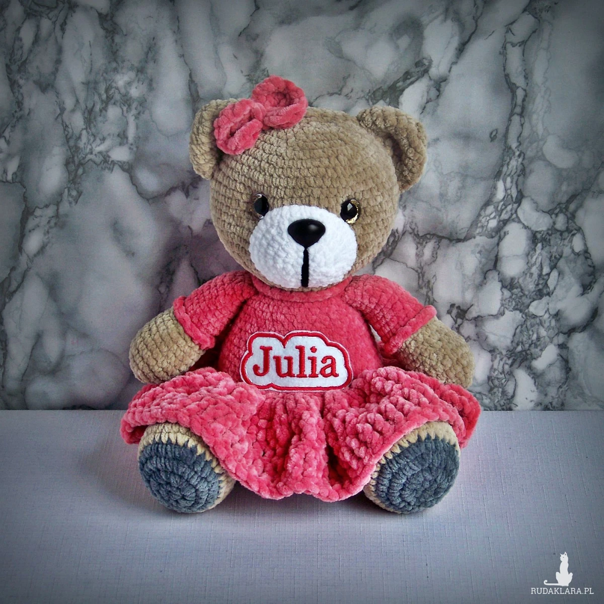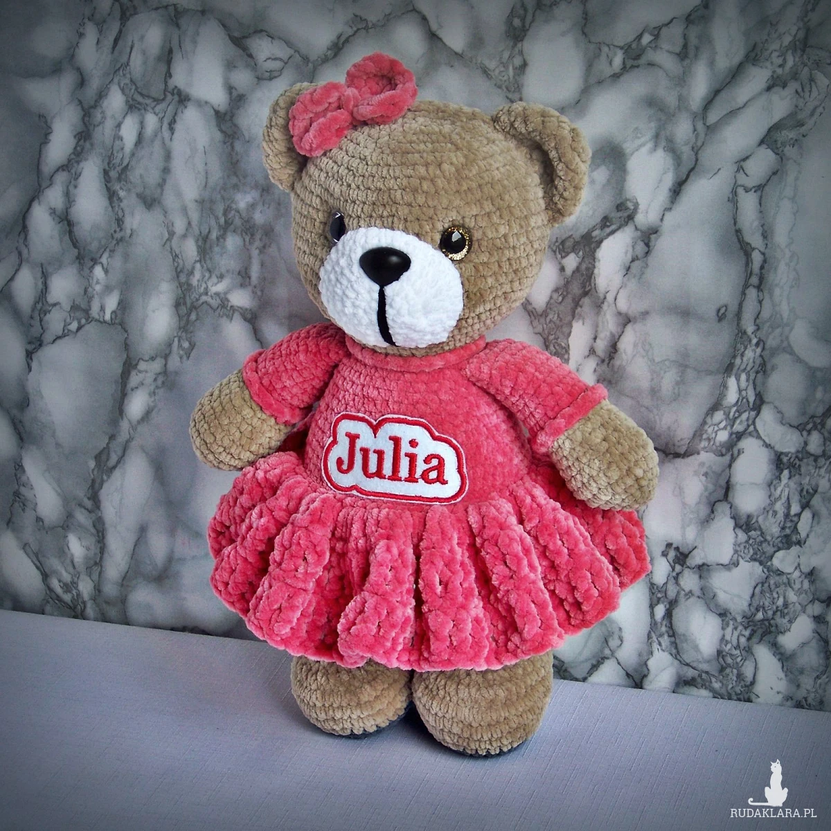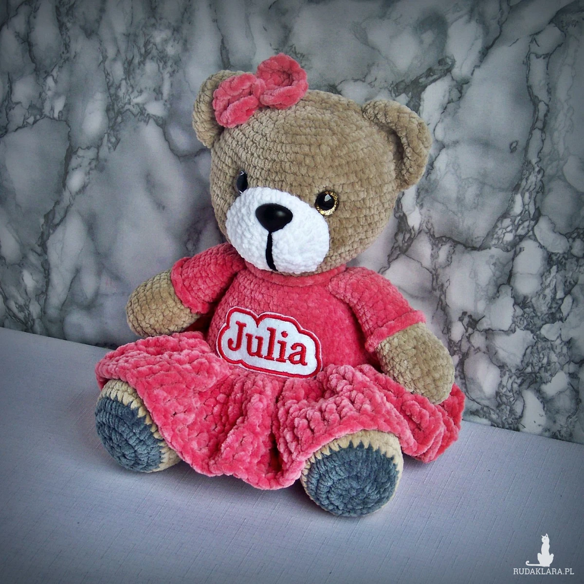 Szydełkowy miś Julia 32cm w amarantowej sukience (na zamówienie)