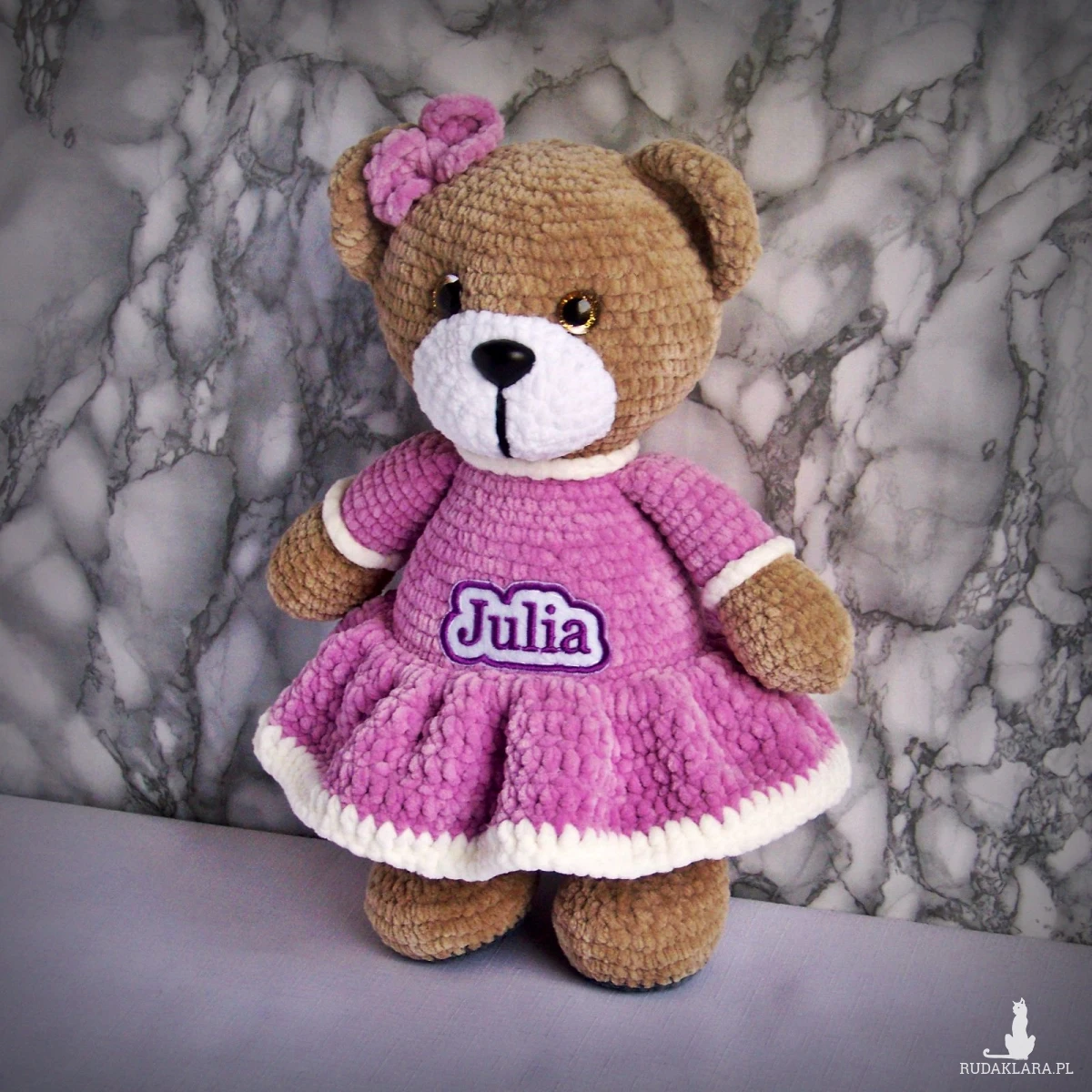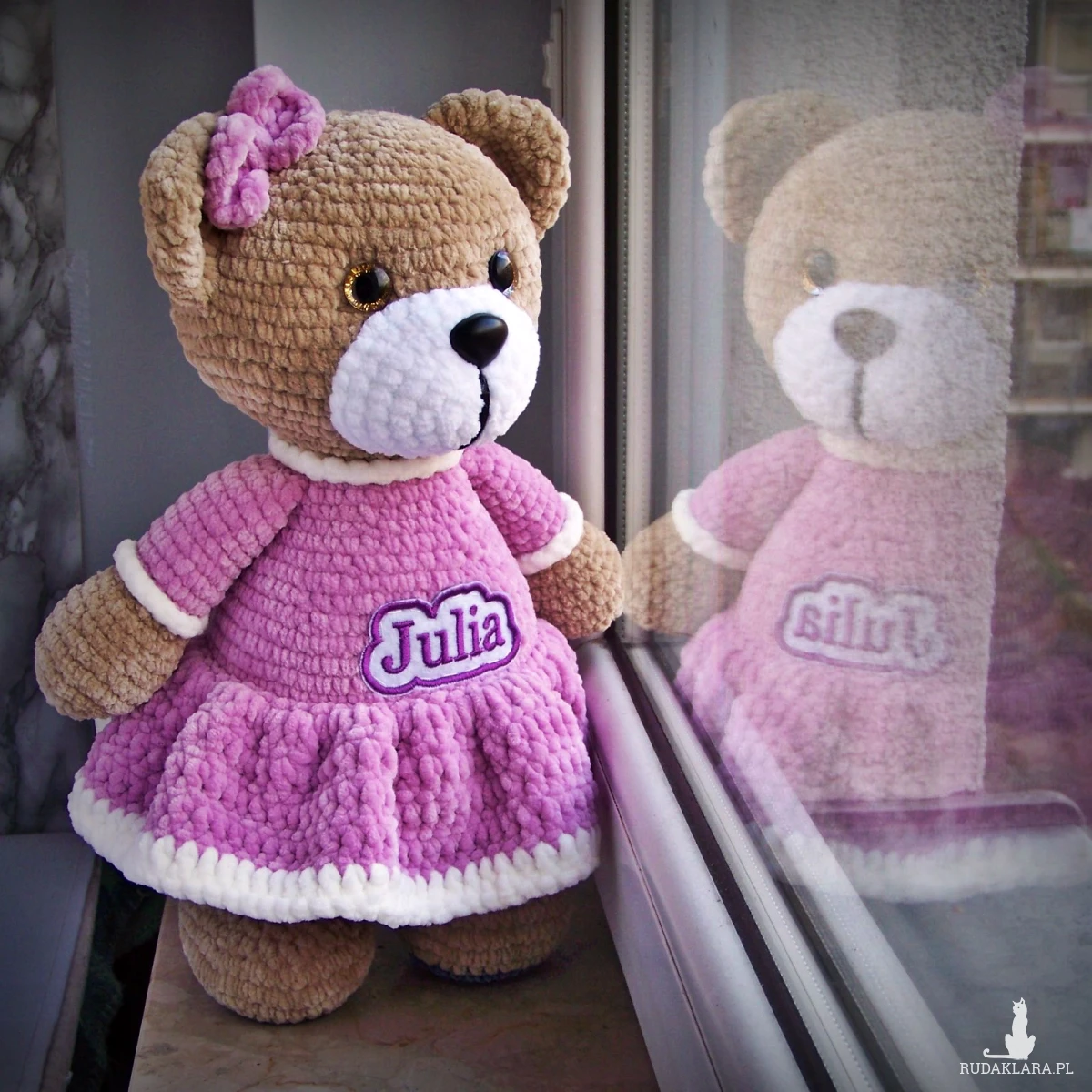 Szydełkowy miś Julia 32cm we wrzosowej sukience (na zamówienie)