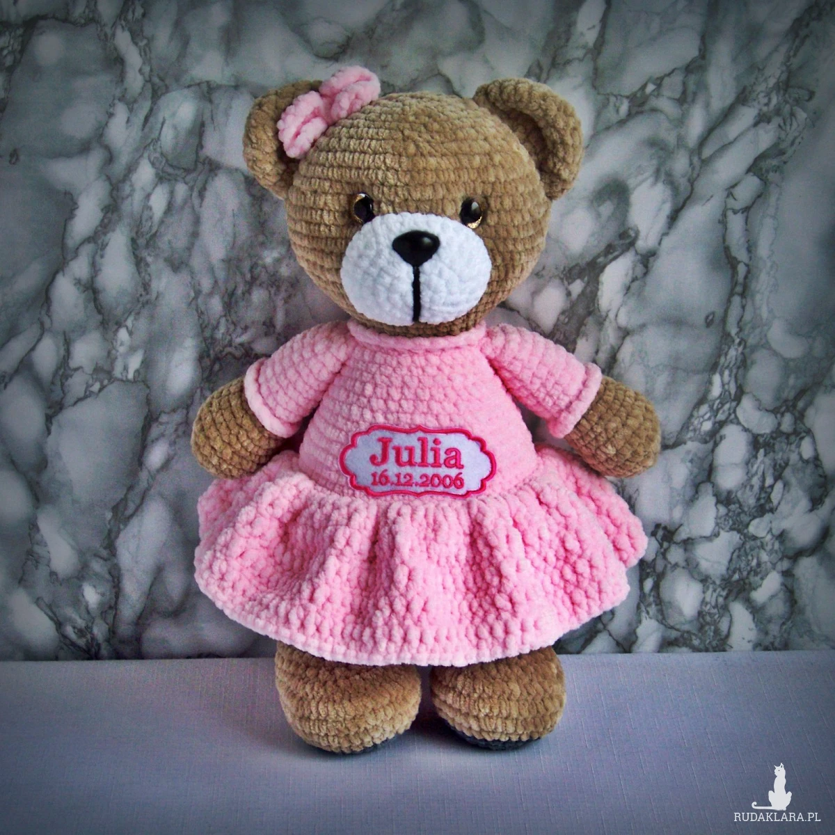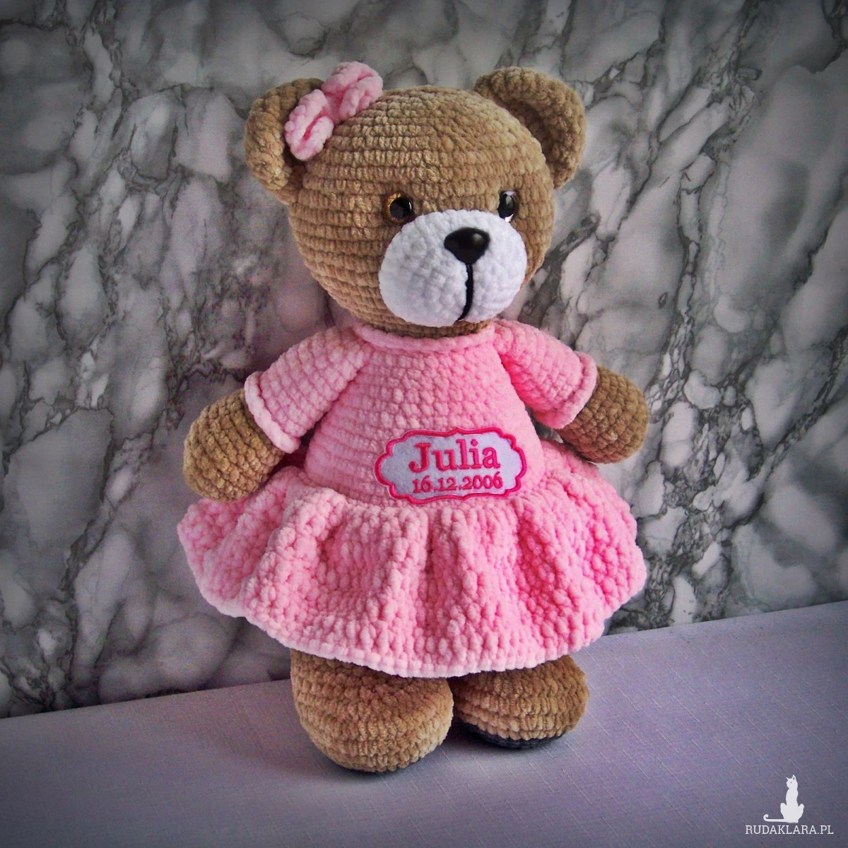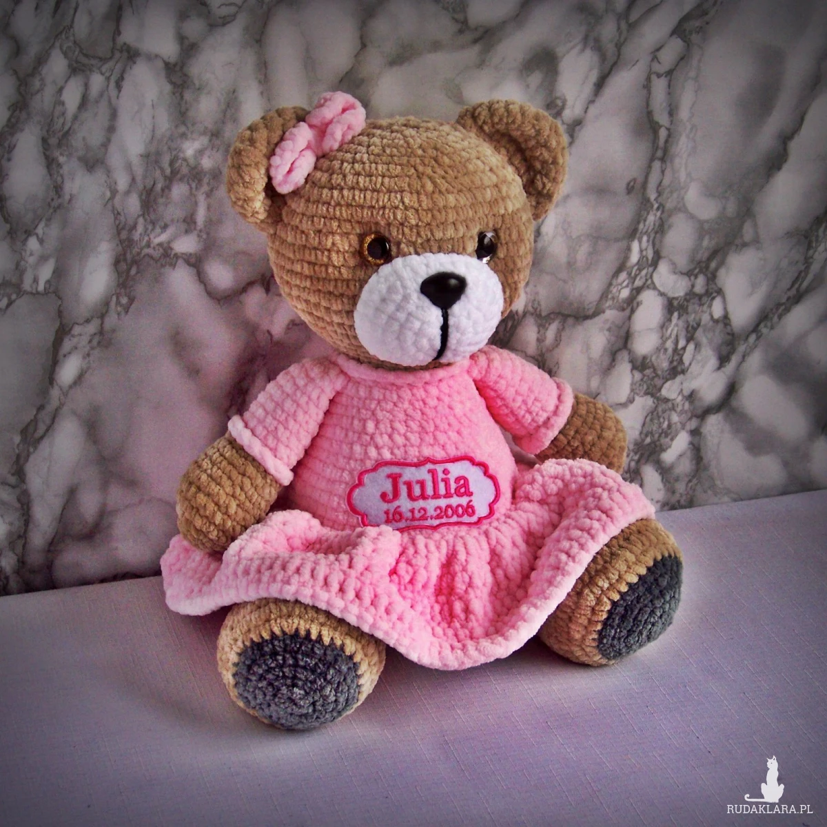 Szydełkowy miś Julia 32cm z datą urodzin w jasnoróżowej sukience (na zamówienie)