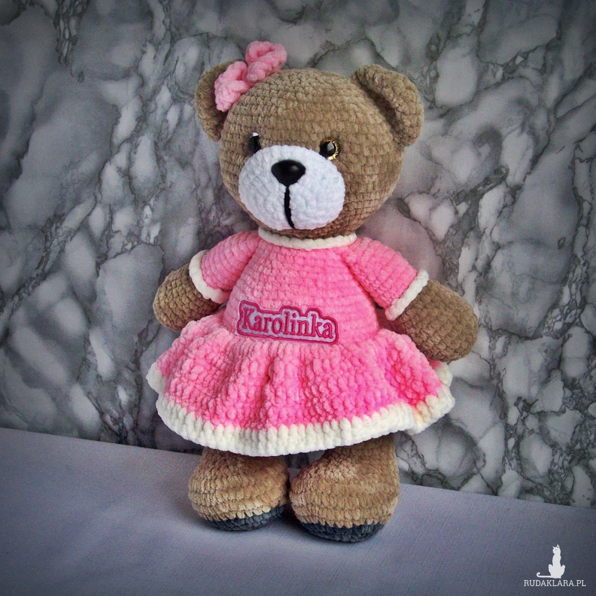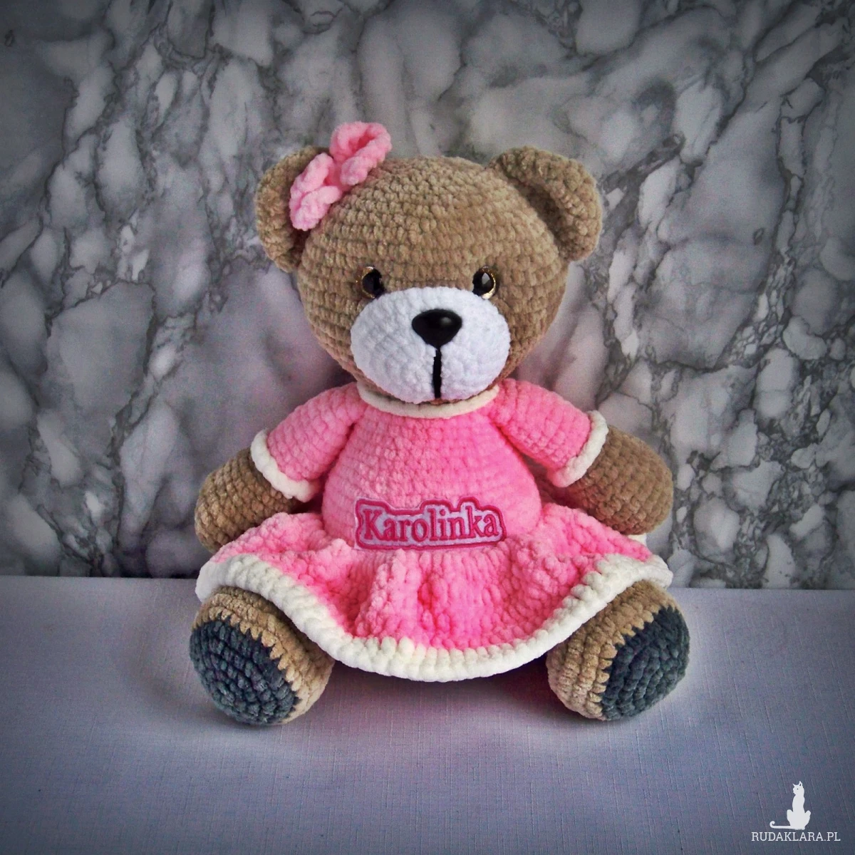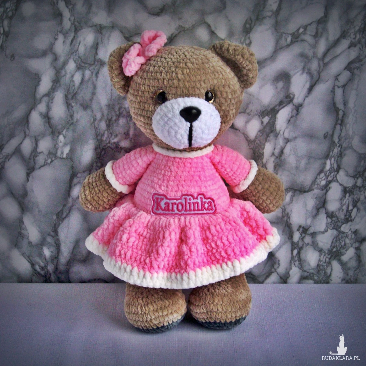 Szydełkowy miś Karolinka 32cm w różowej sukience (na zamówienie)
