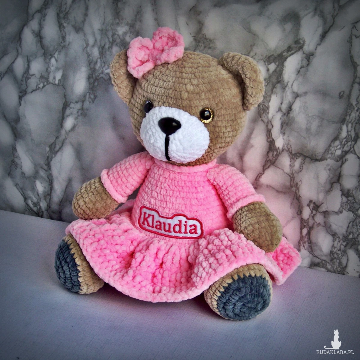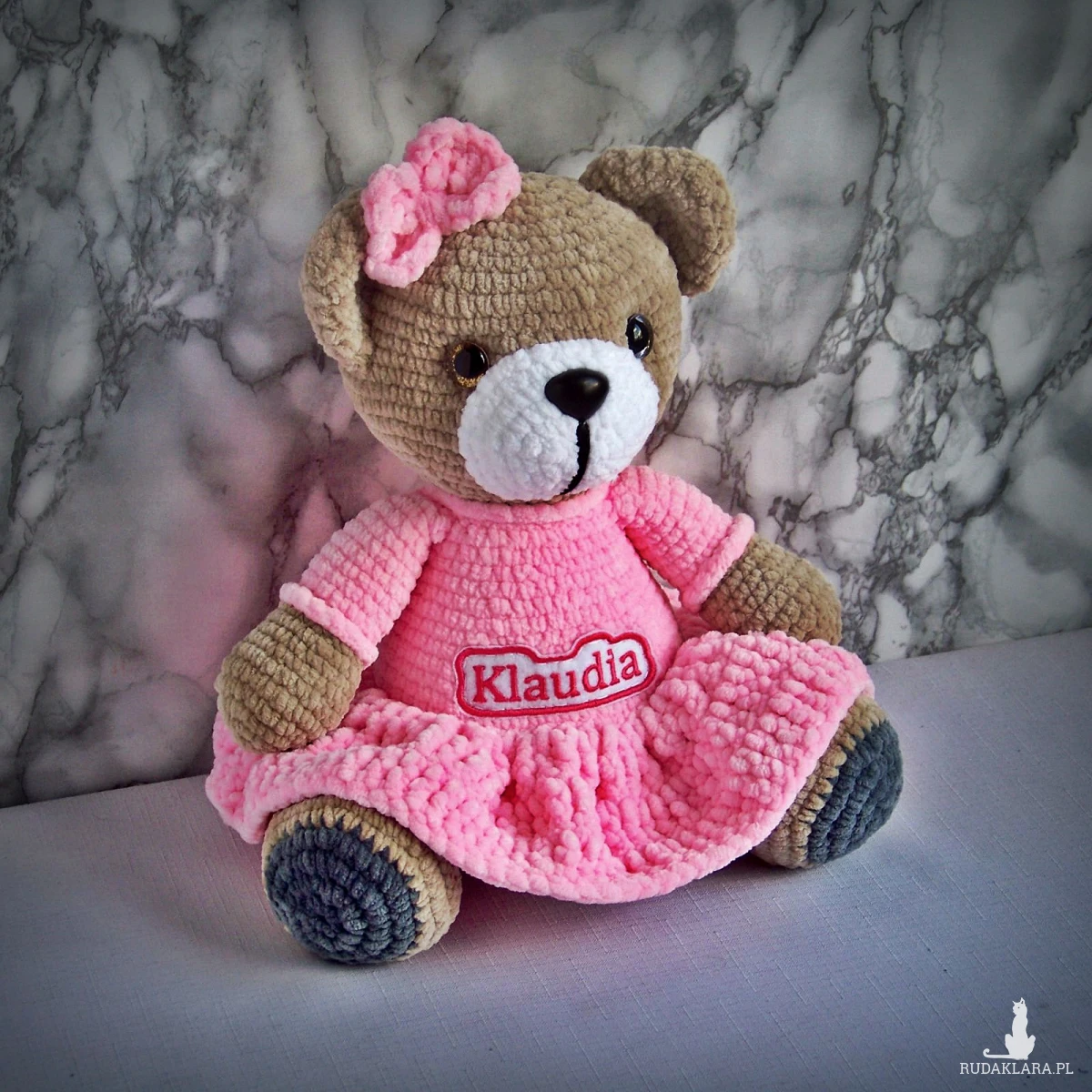 Szydełkowy miś Klaudia 32cm w różowej sukience (na zamówienie)