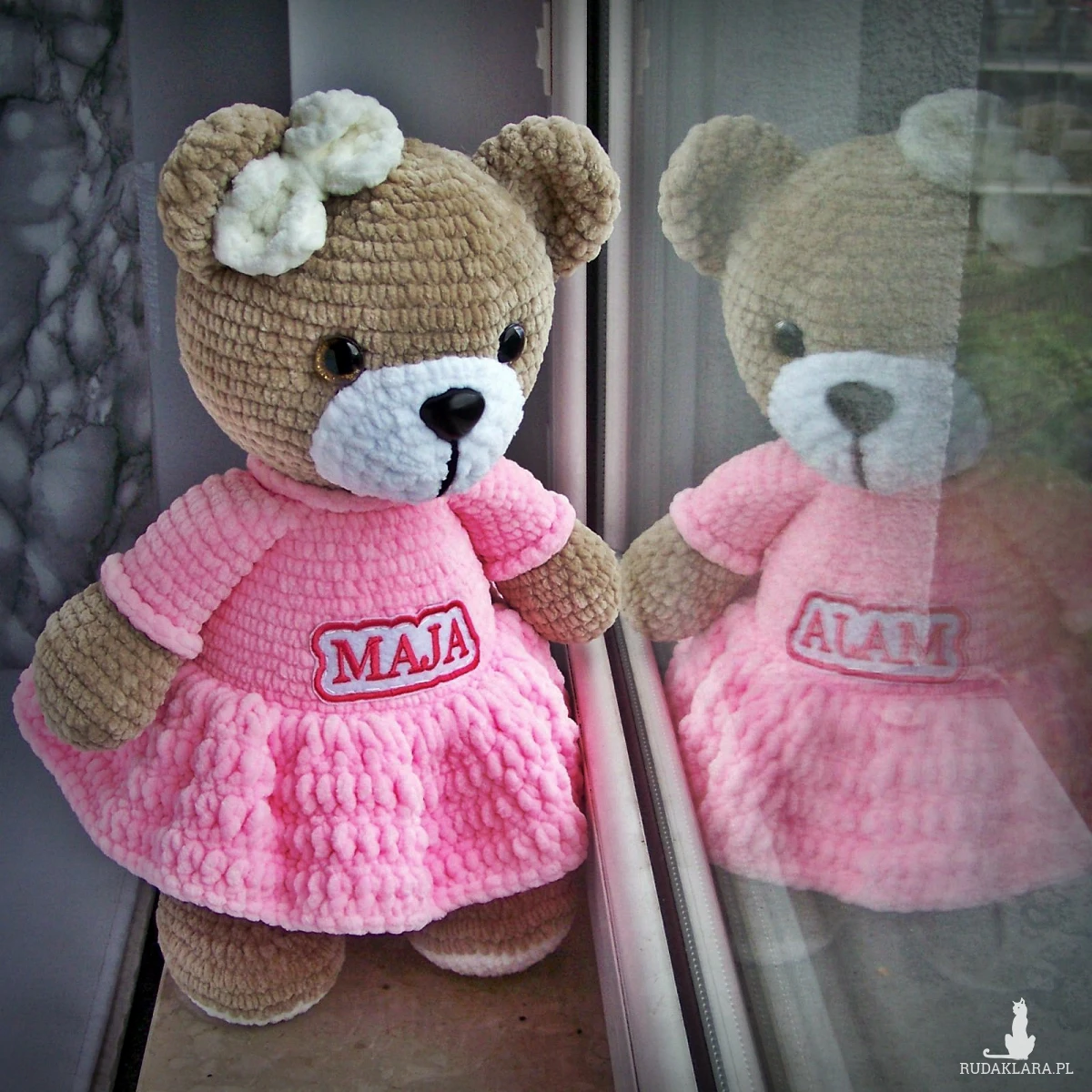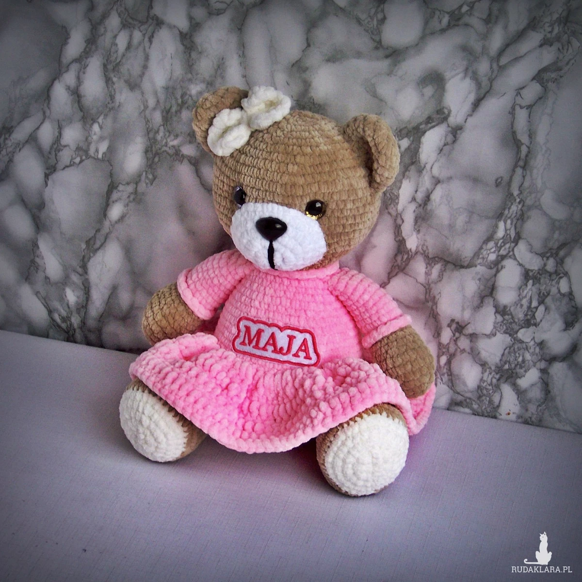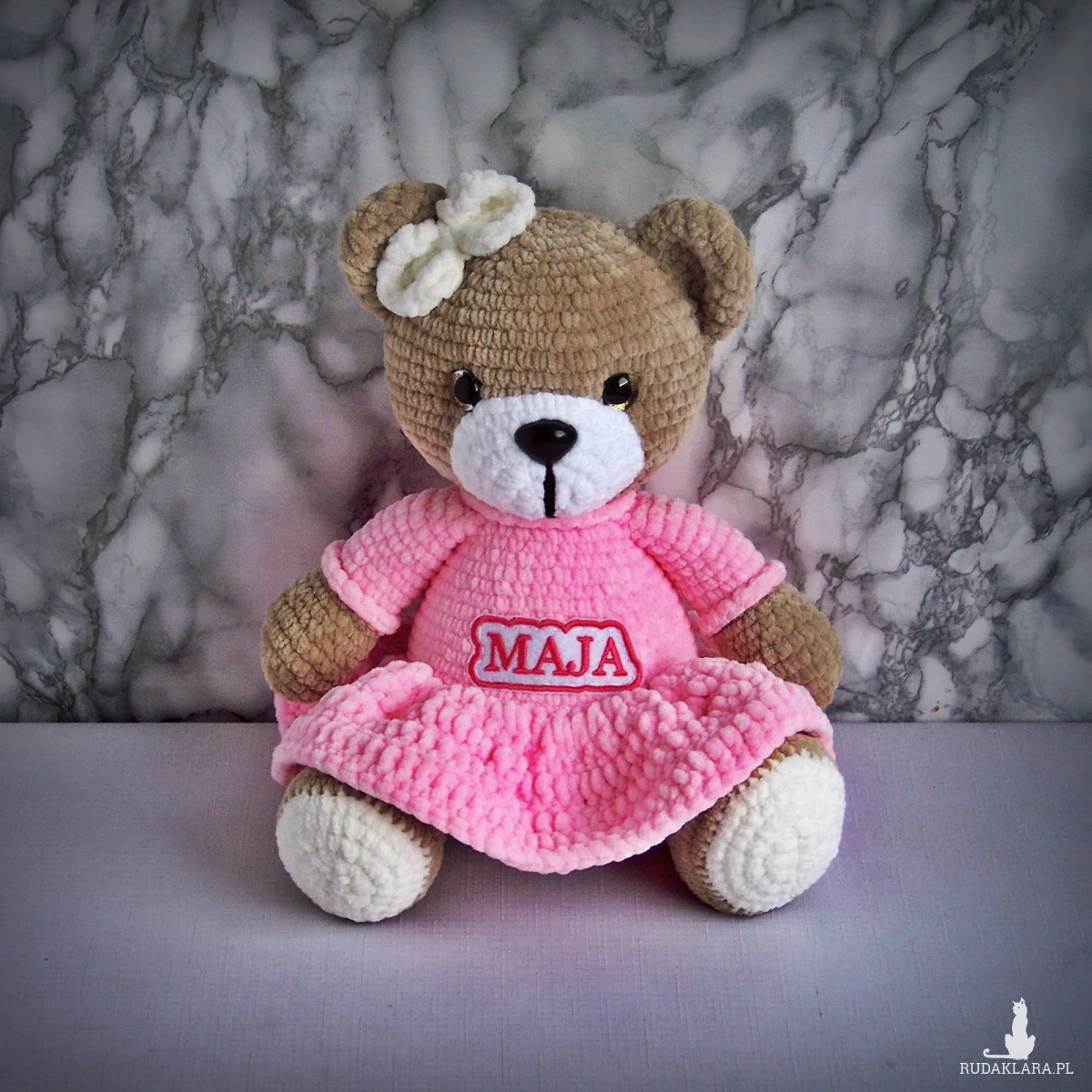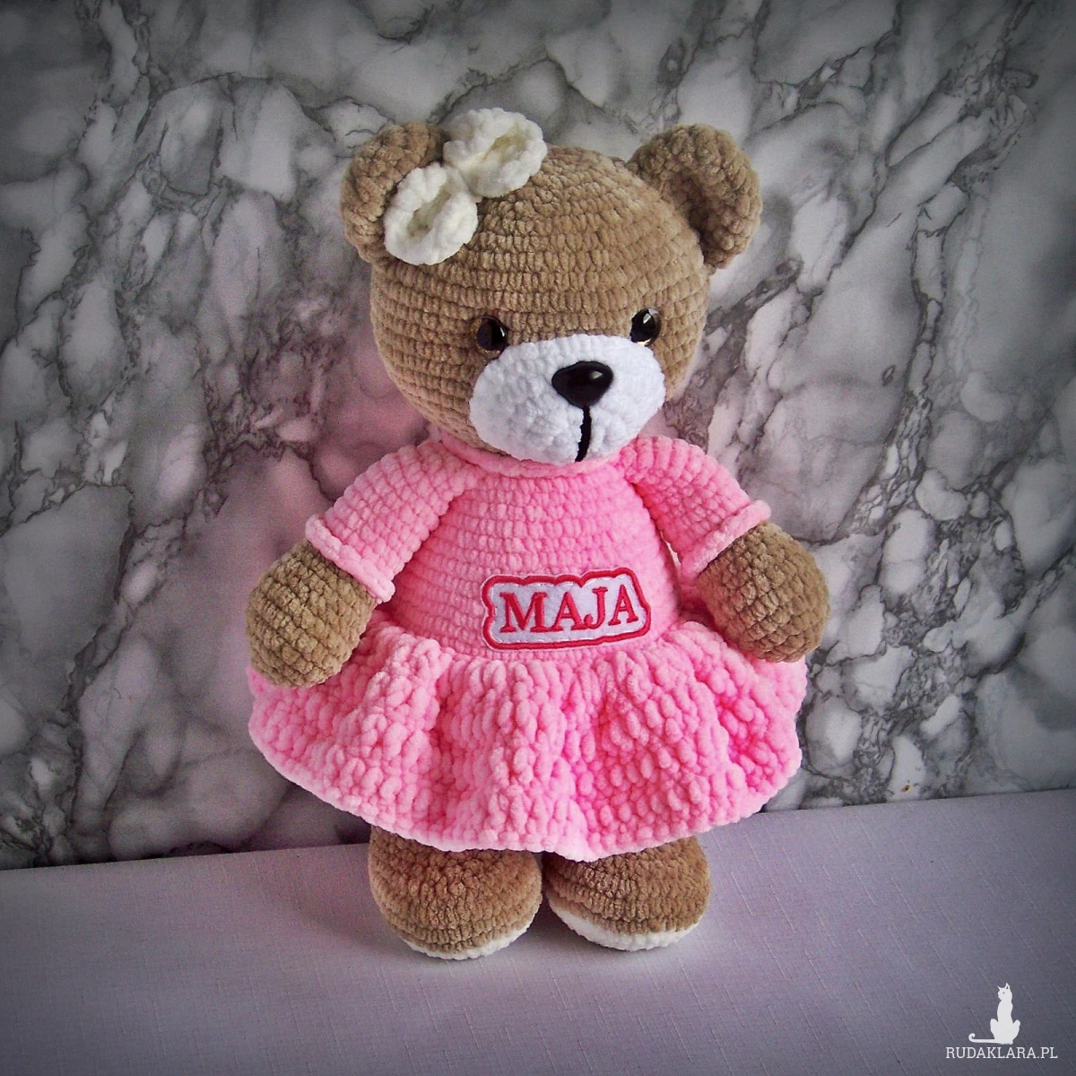 Szydełkowy miś Maja 32cm w różowej sukience (na zamówienie)