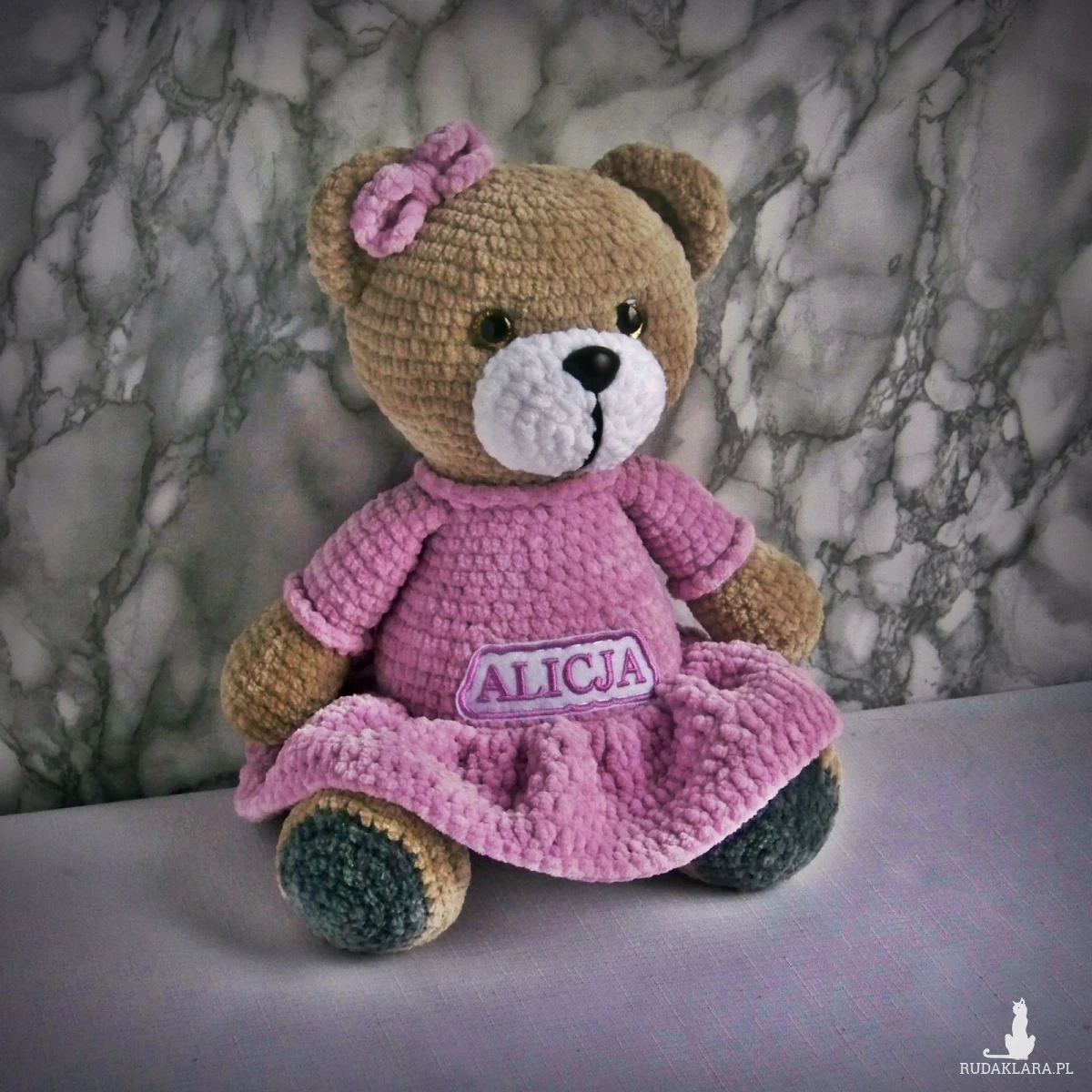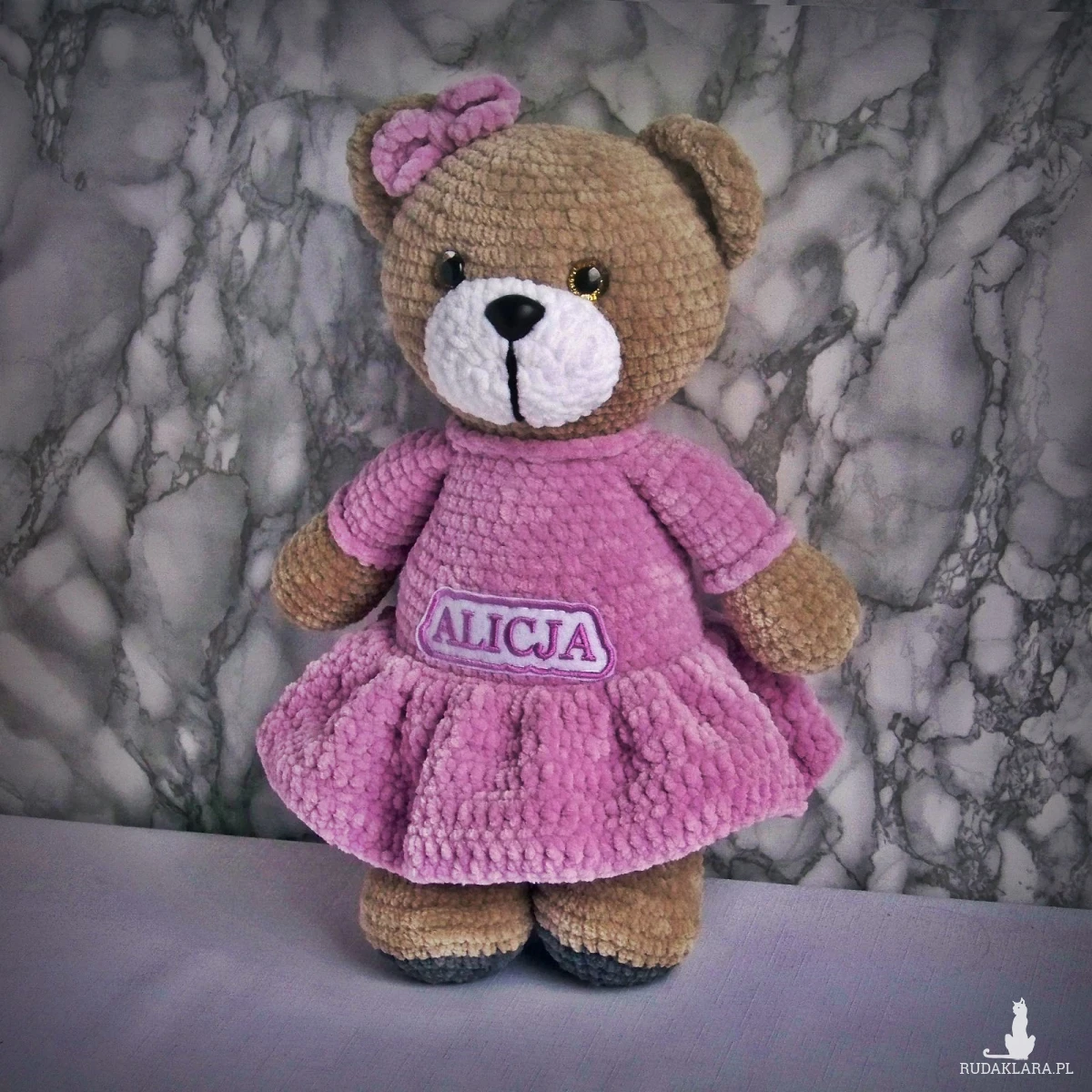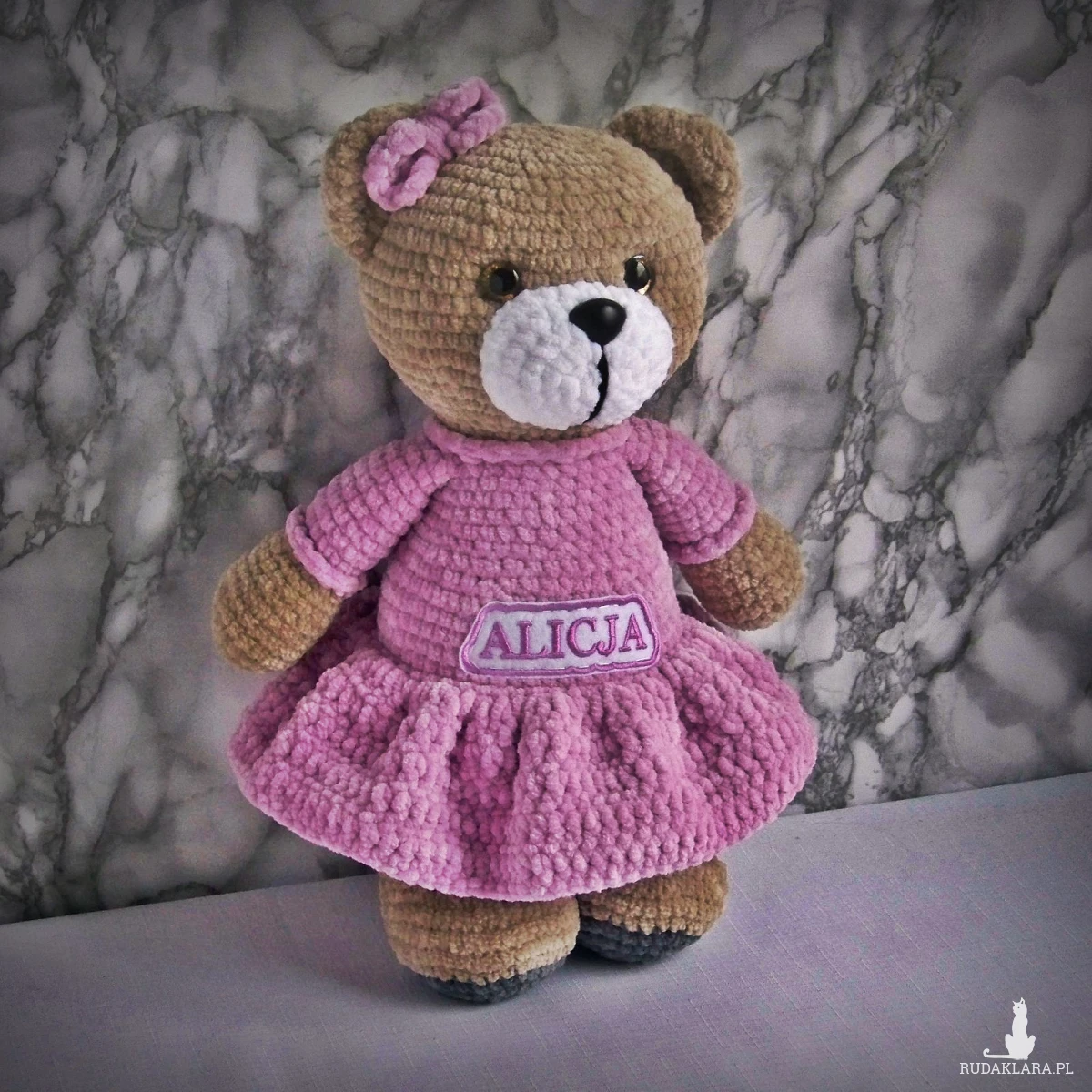Szydełkowy miś Alicja 32cm we wrzosowej sukience (na zamówienie)