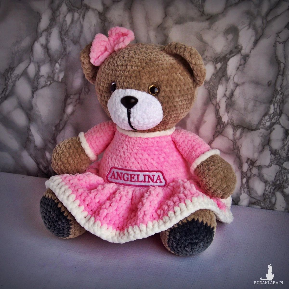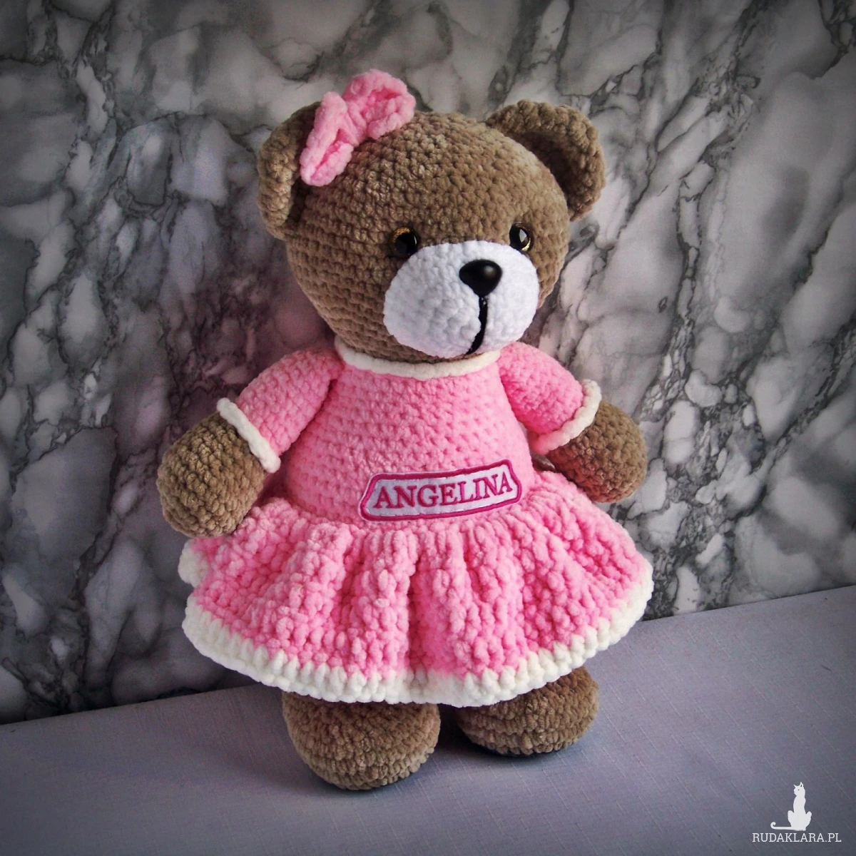 Szydełkowy miś Angelina 32cm w różowej sukience (na zamówienie)