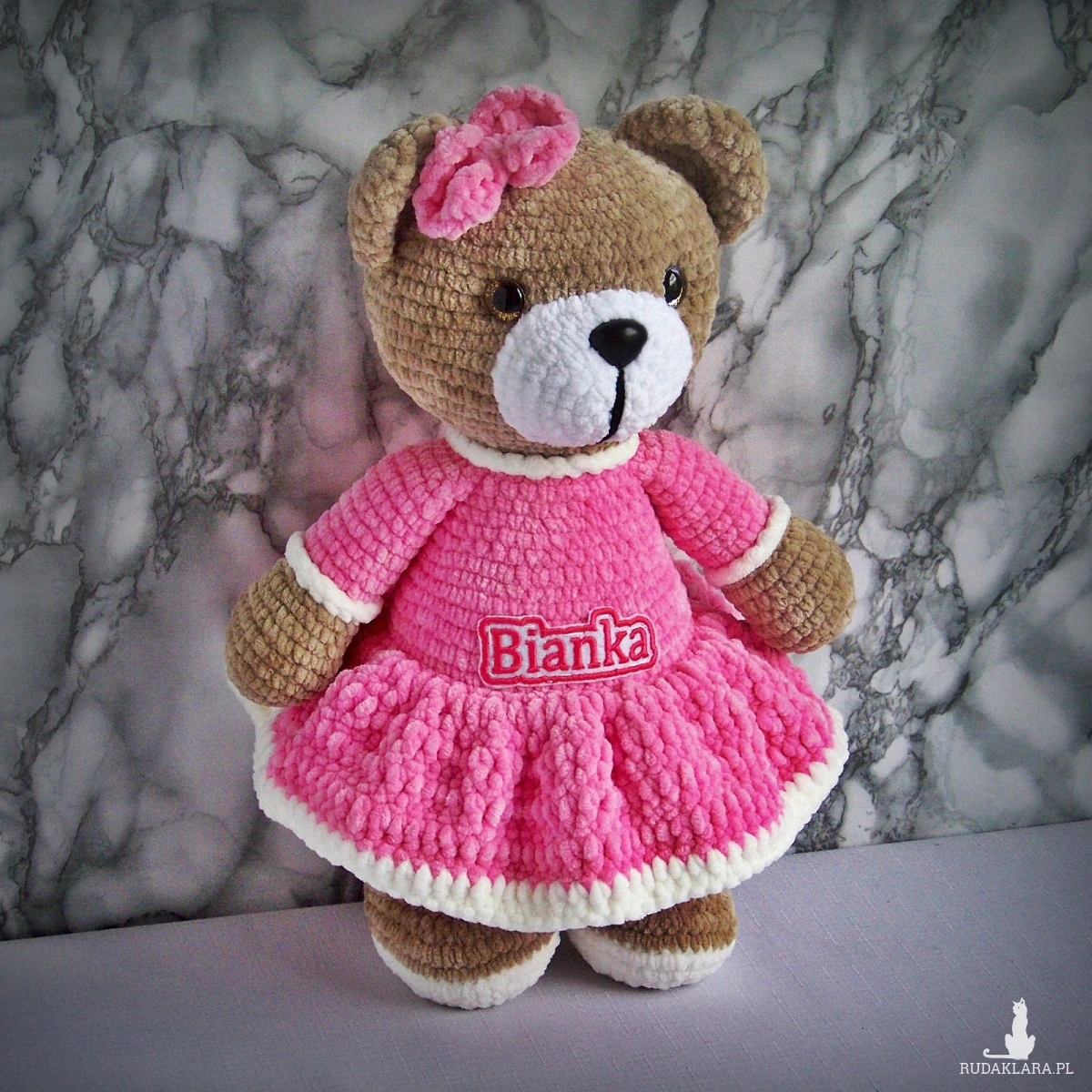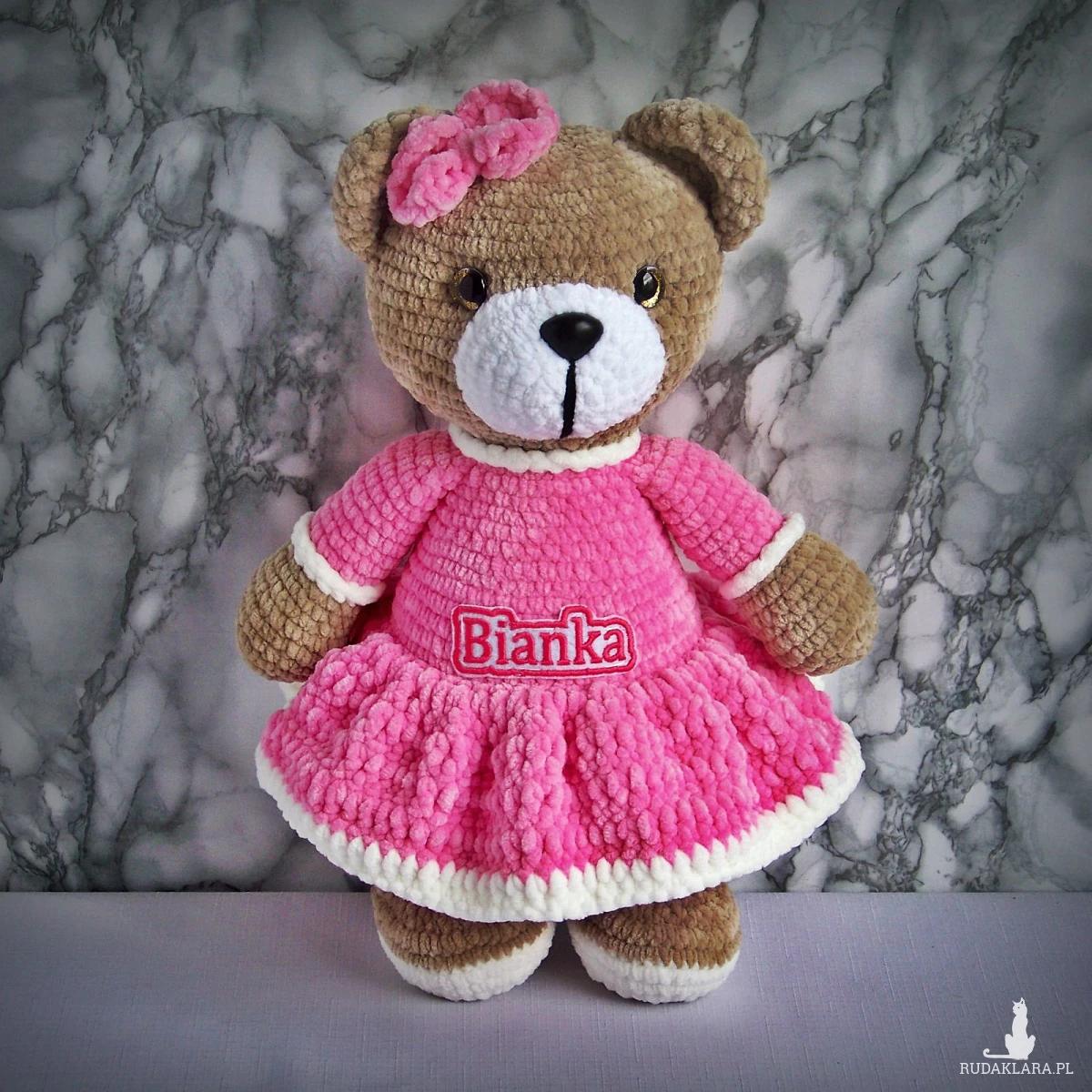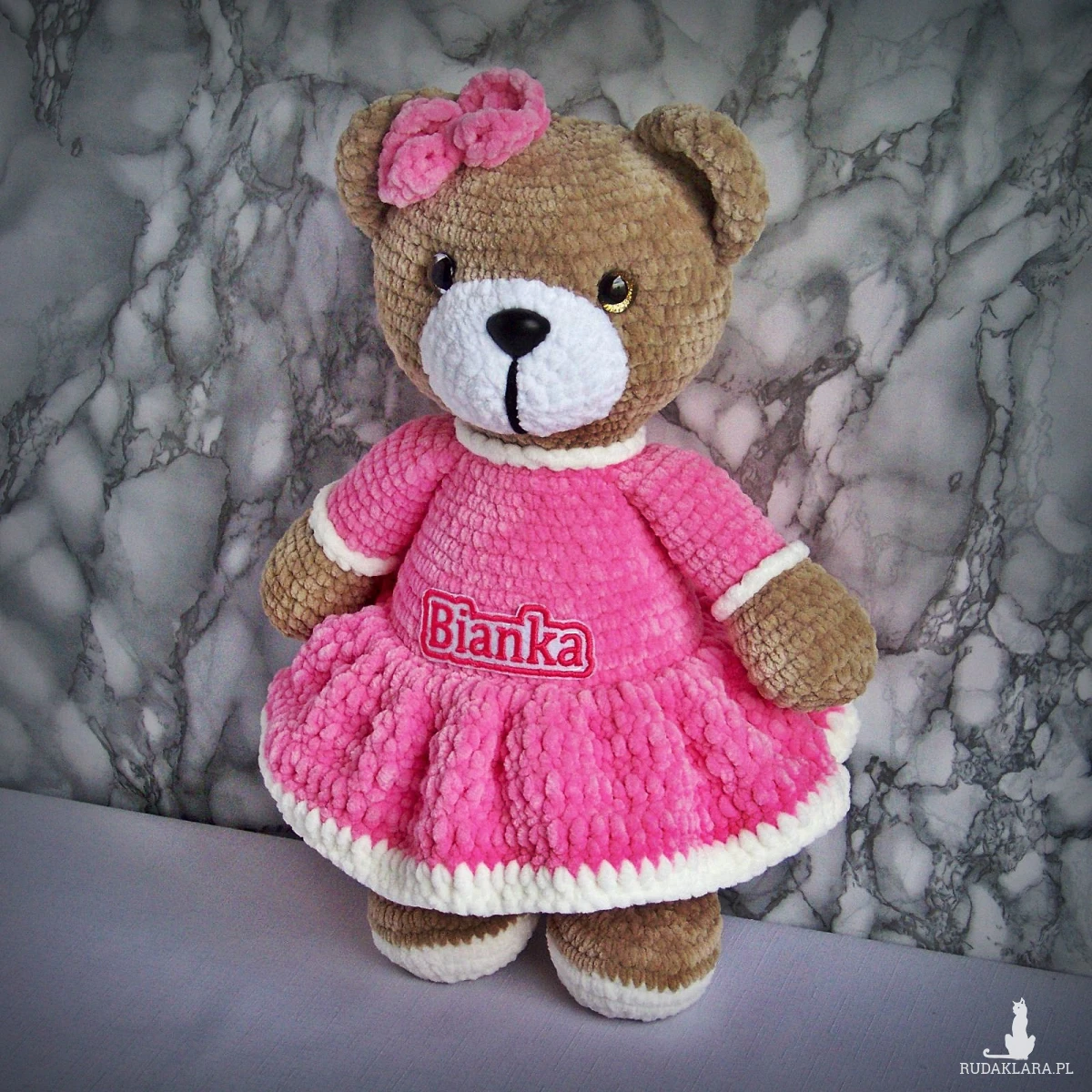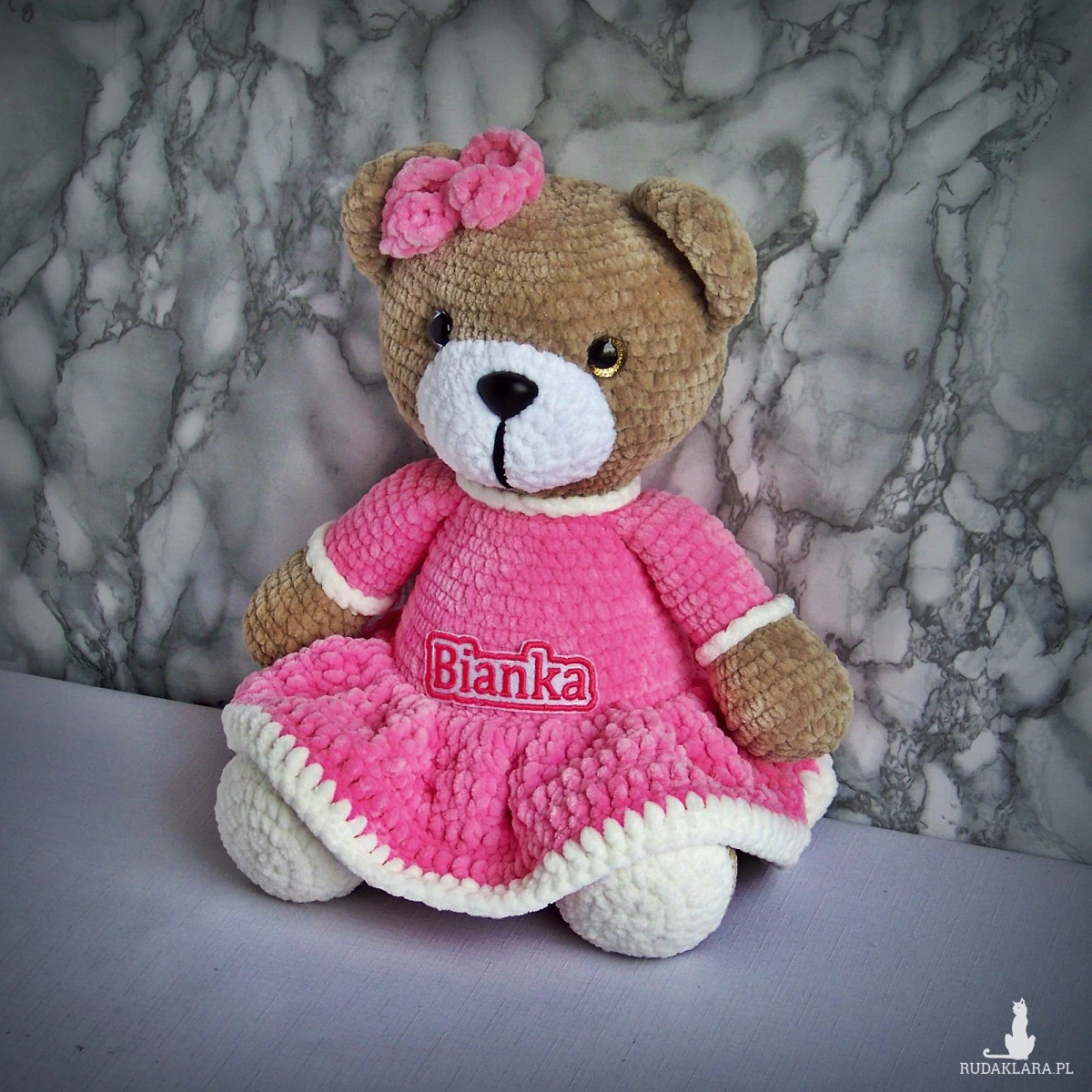 Szydełkowy miś Bianka 32cm w ciemnoróżowej sukience (na zamówienie)