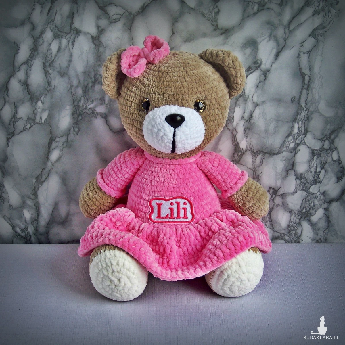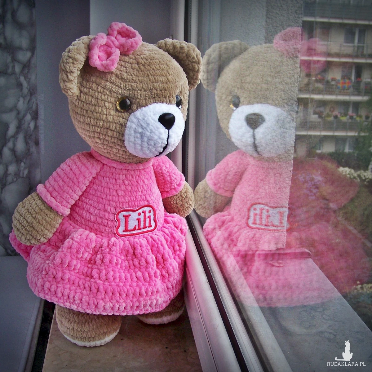 Szydełkowy miś Lili 32cm w ciemnoróżowej sukience (na zamówienie)