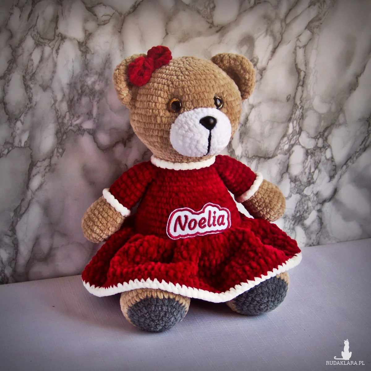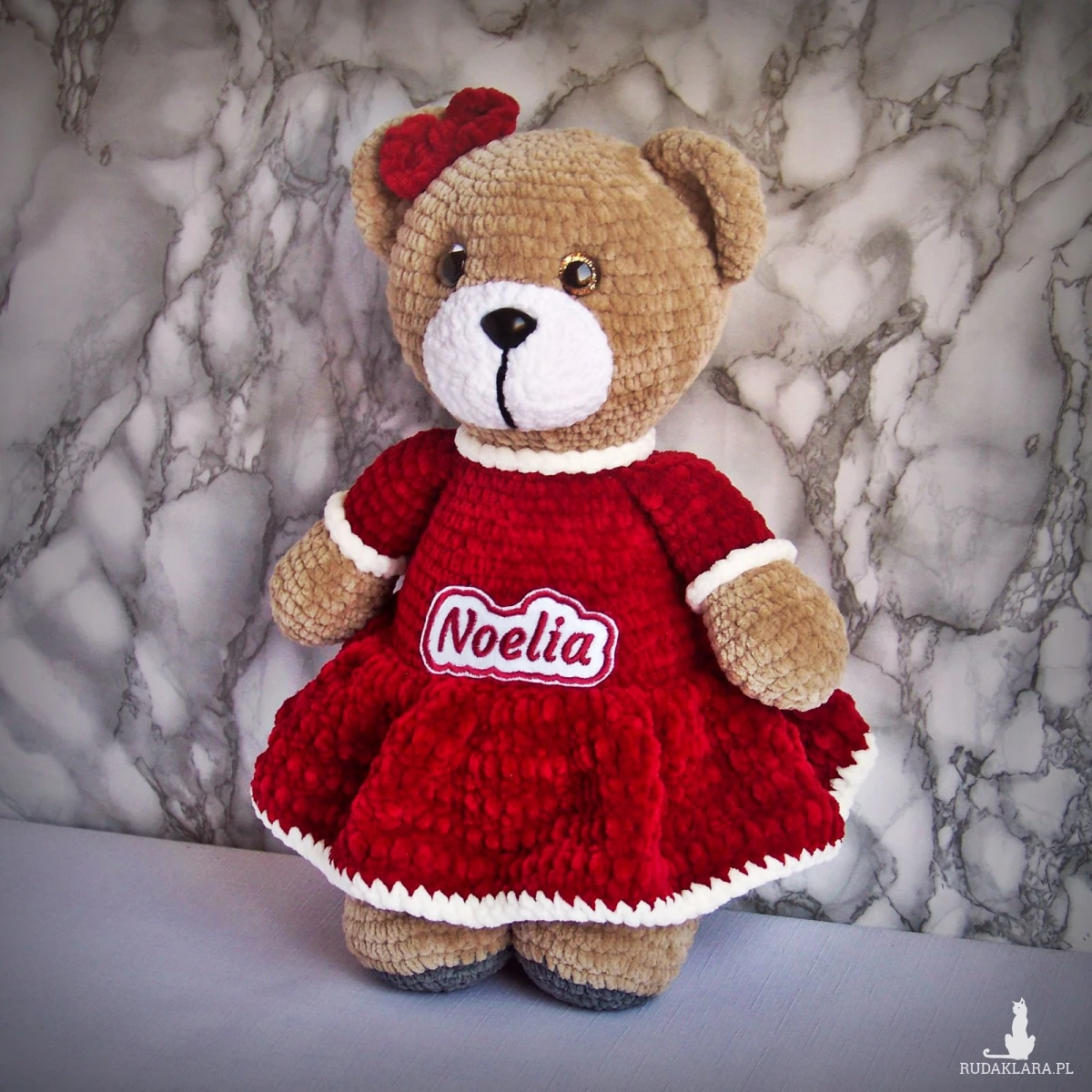 Szydełkowy miś Noelia 32cm w bordowej sukience (na zamówienie)