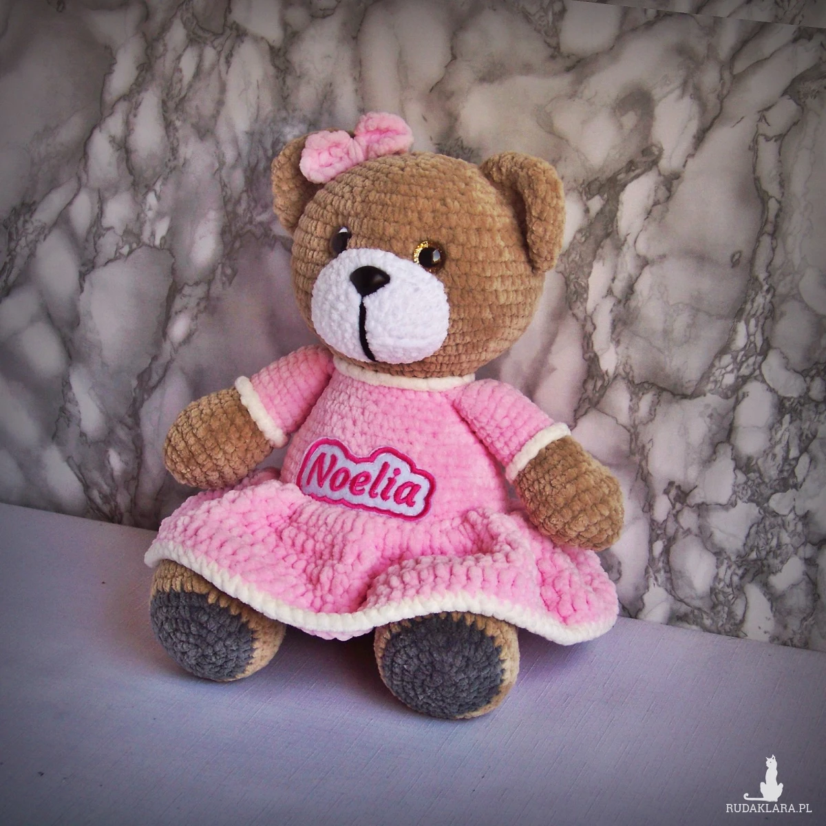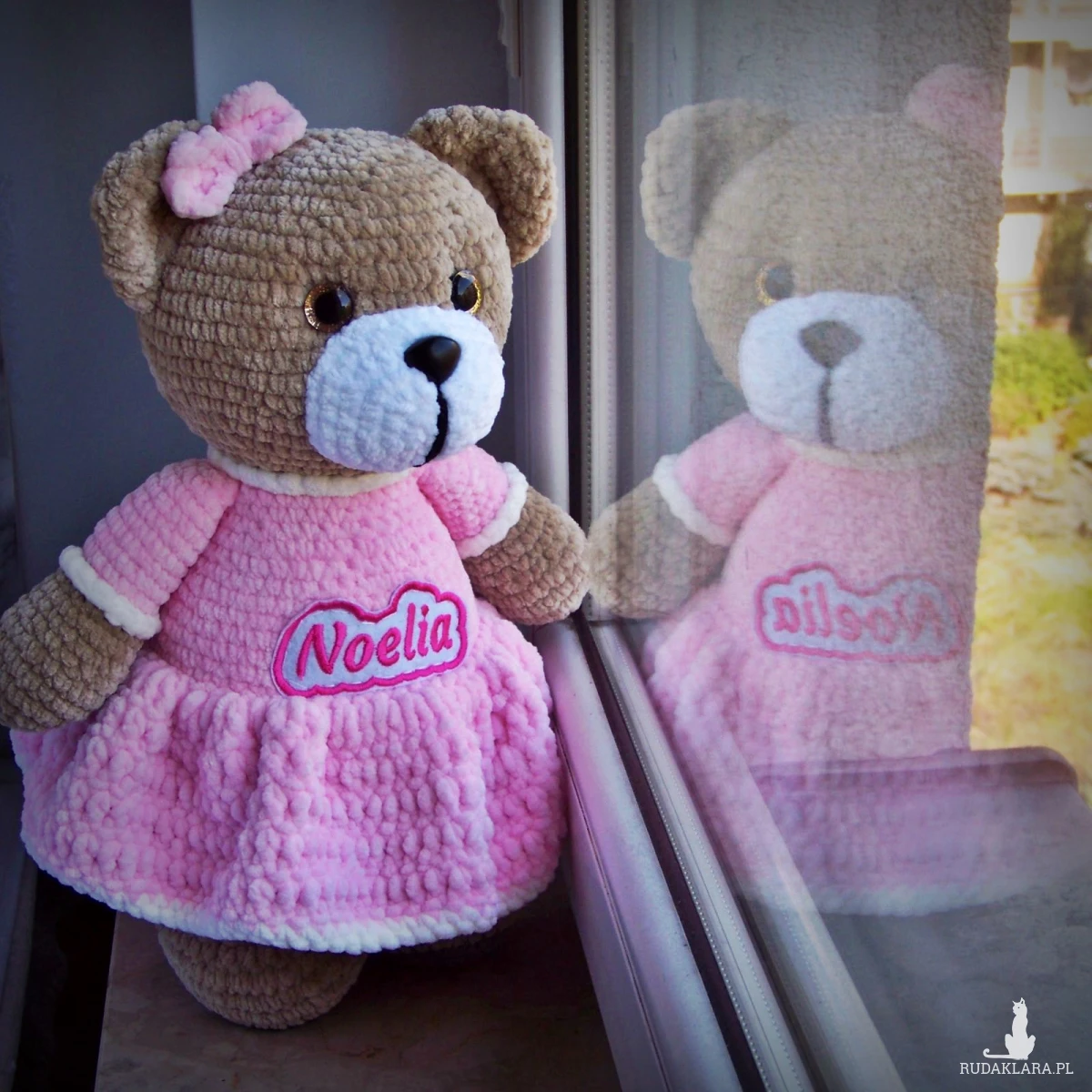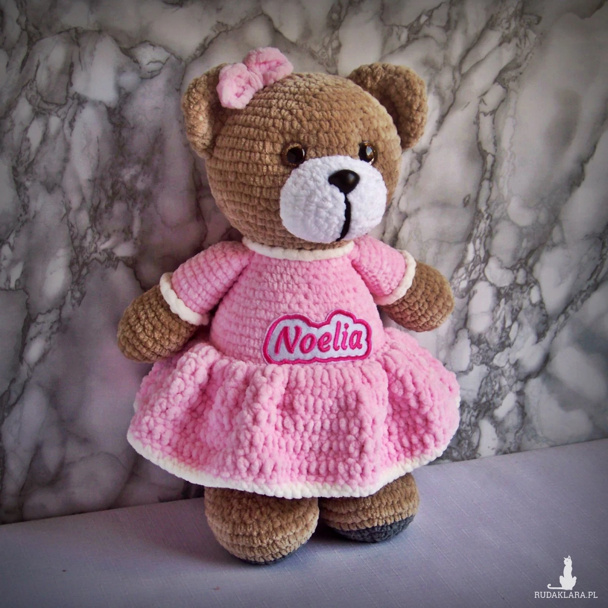Szydełkowy miś Noelia 32cm w jasnoróżowej sukience (na zamówienie)