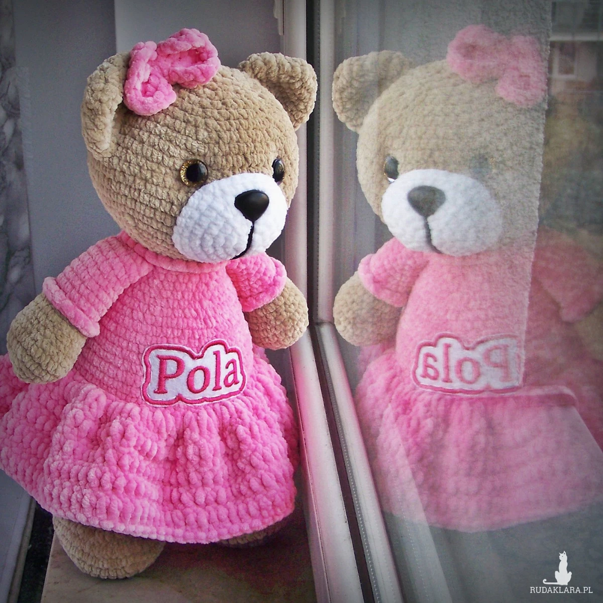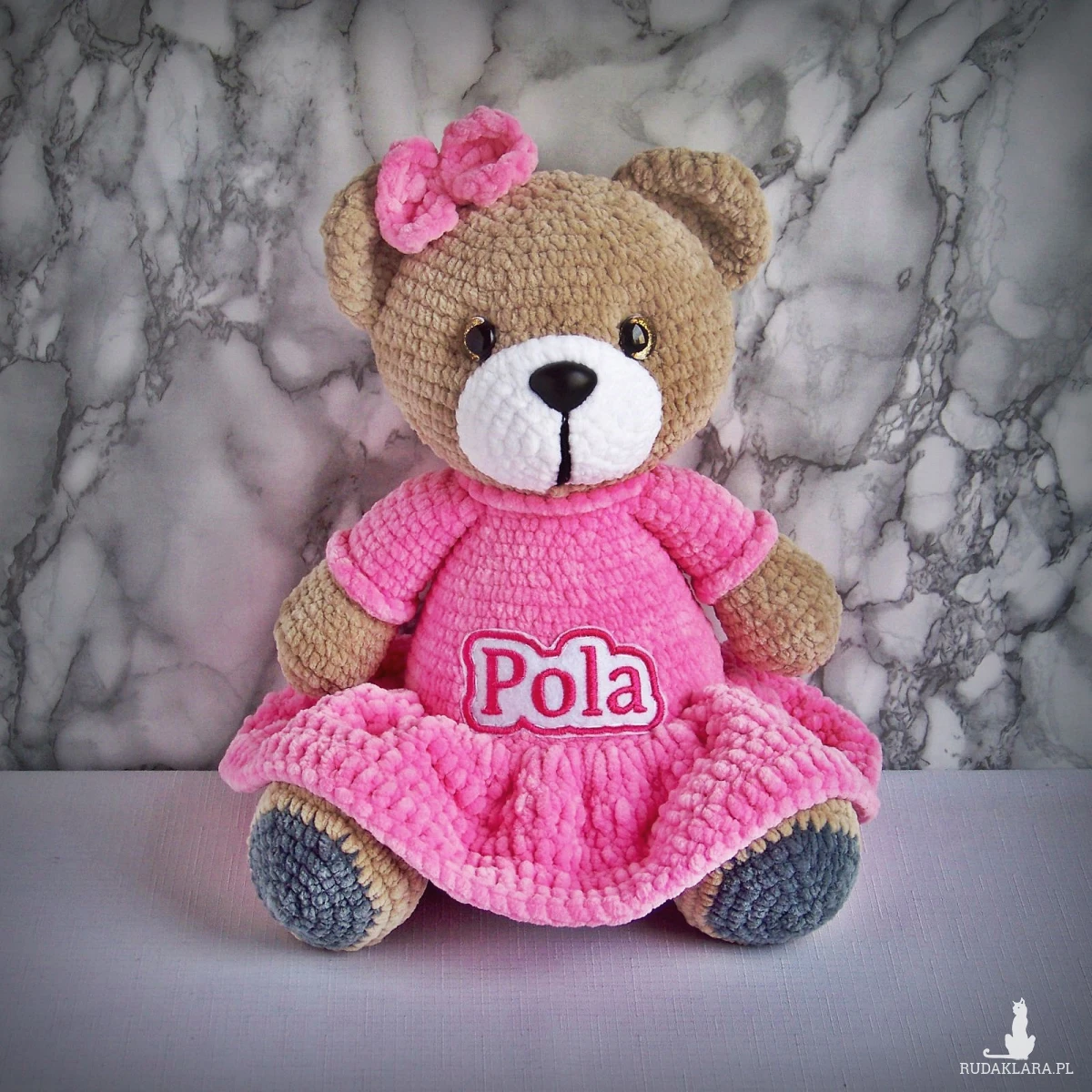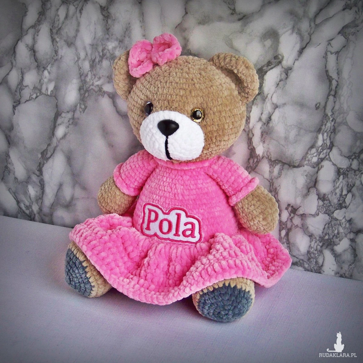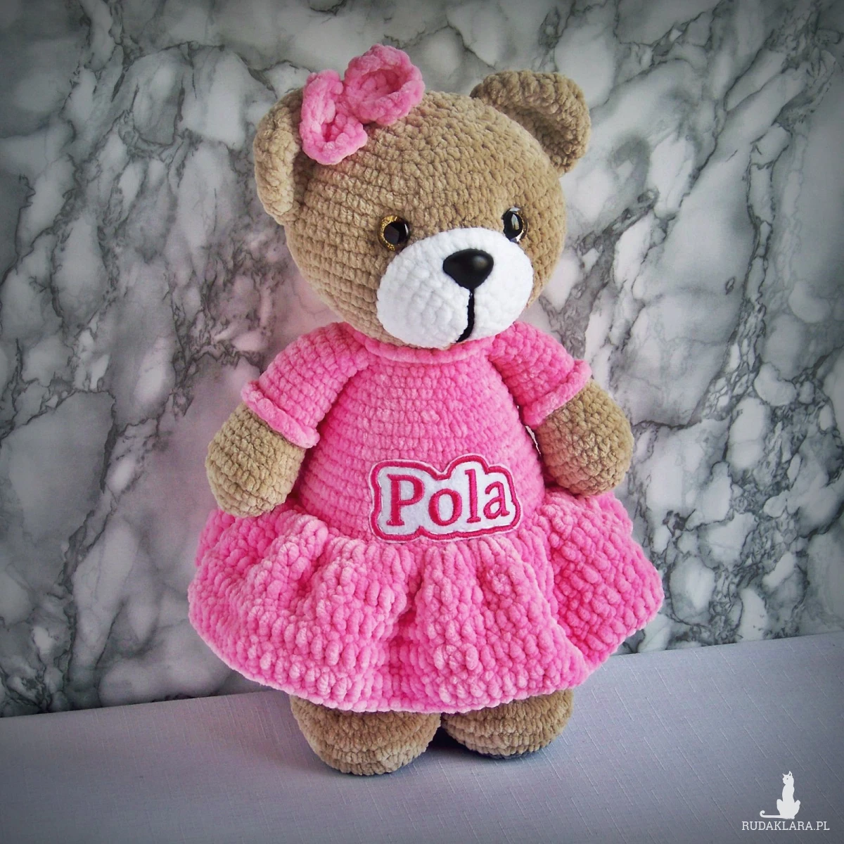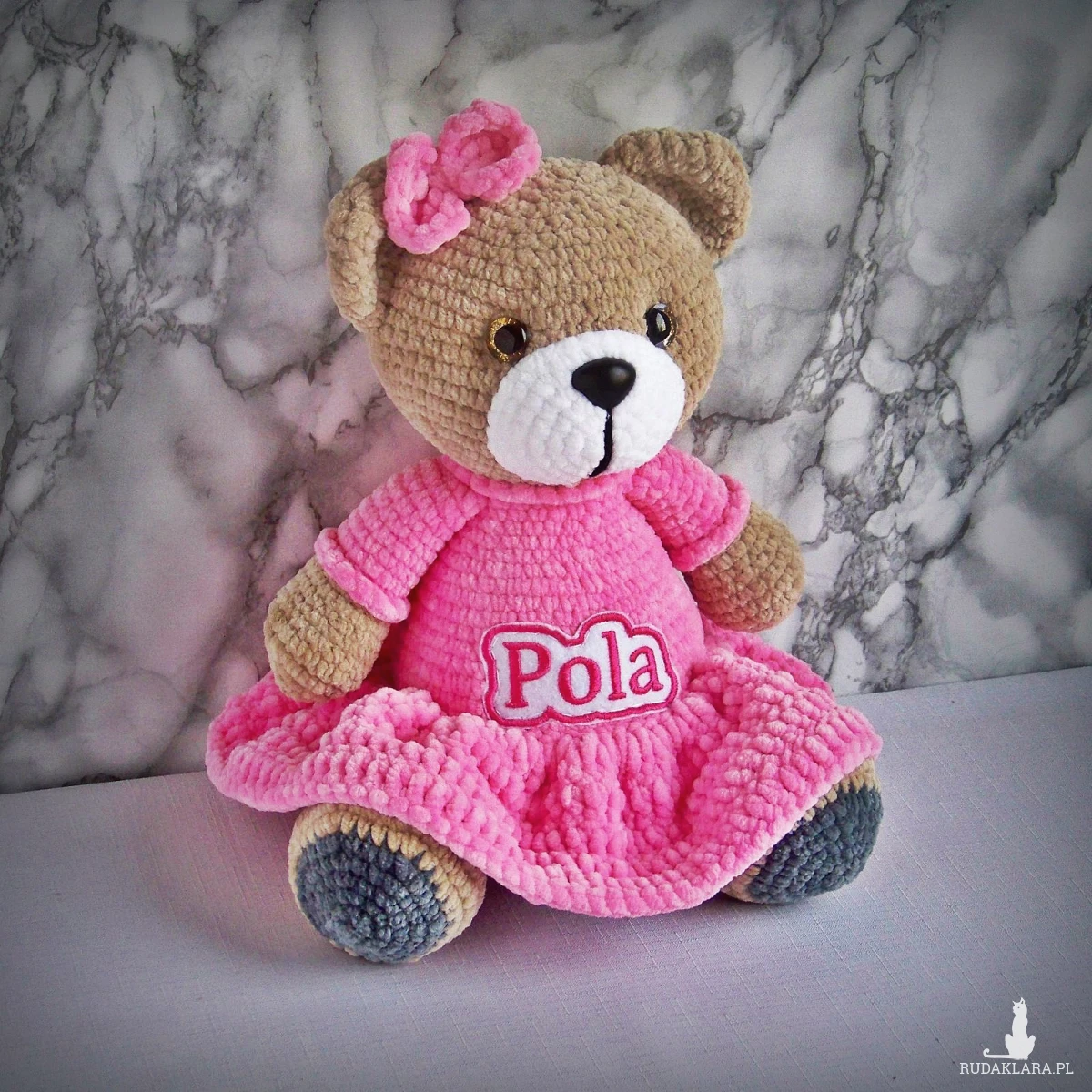 Szydełkowy miś Pola 32cm w ciemnoróżowej sukience (na zamówienie)