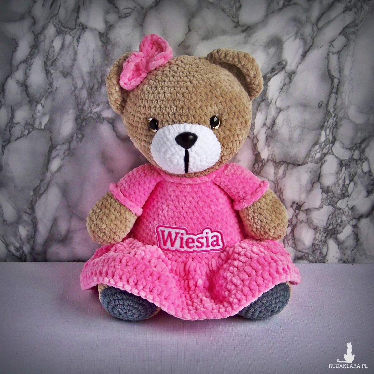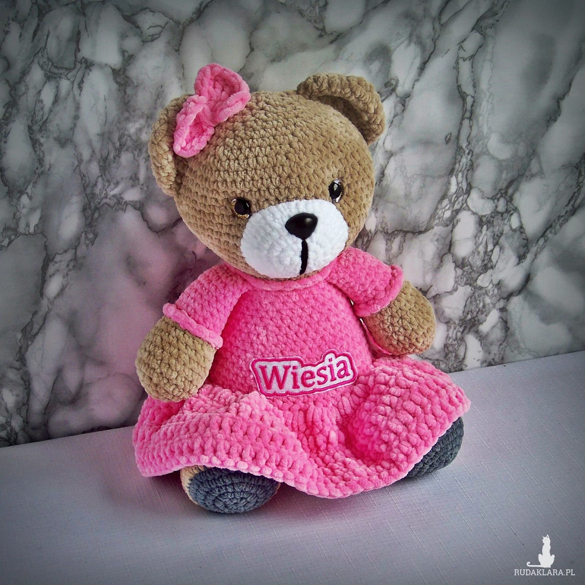 Szydełkowy miś Wiesia 32cm w ciemnoróżowej sukience (na zamówienie)