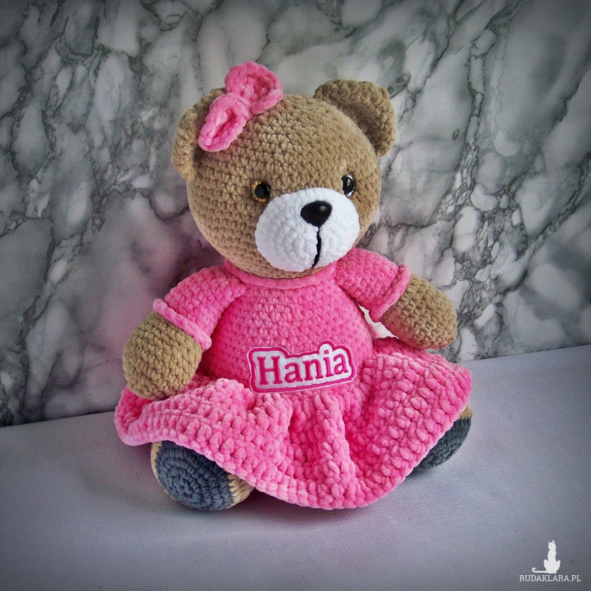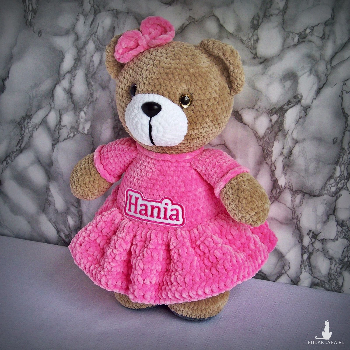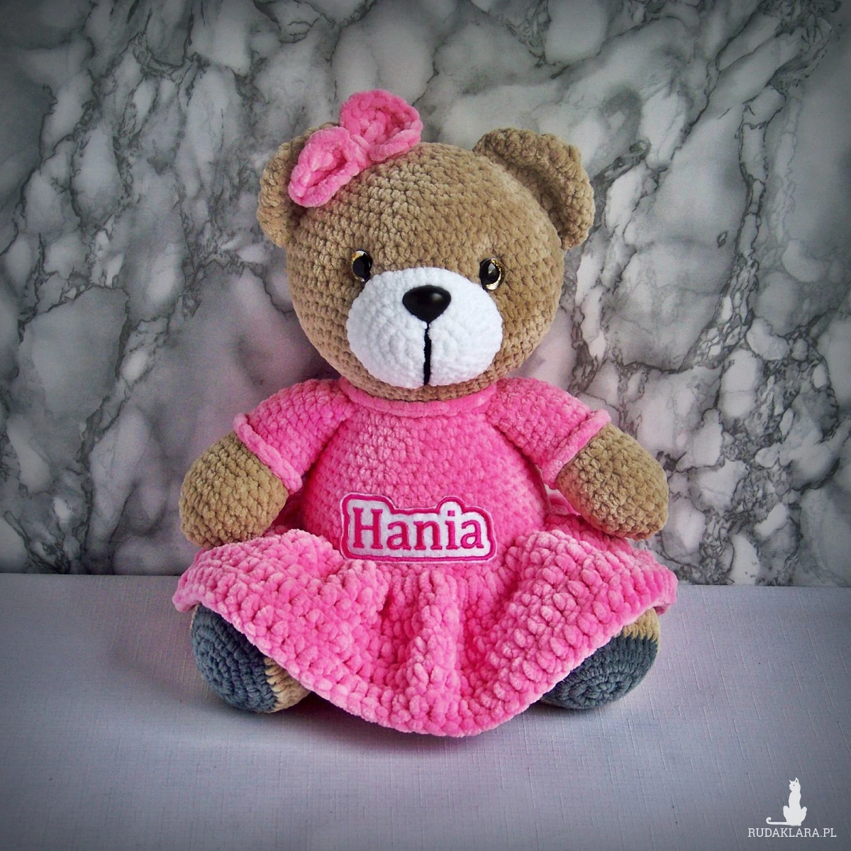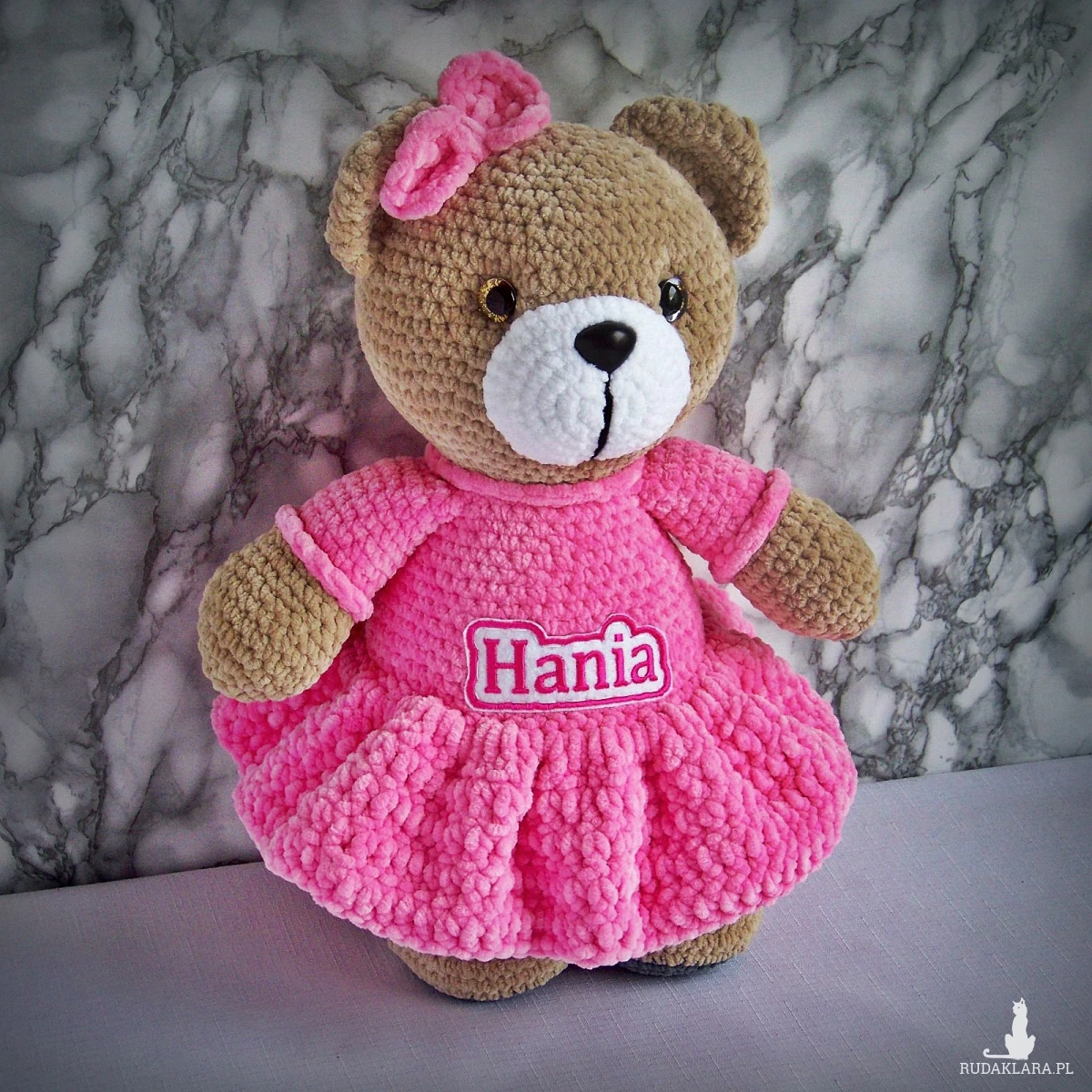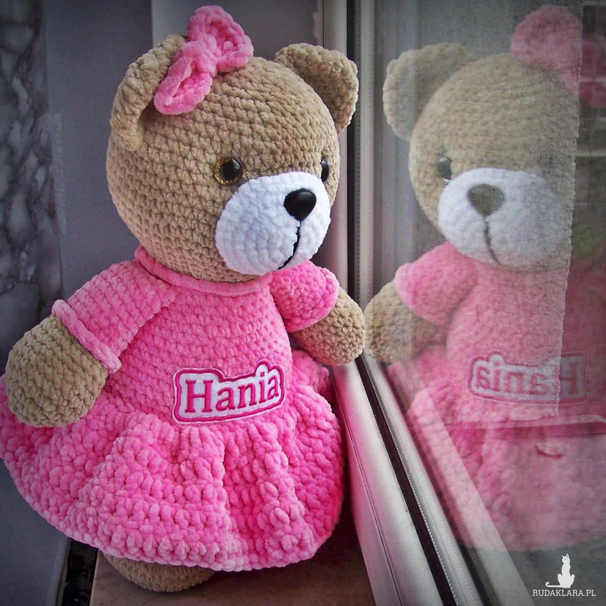 Szydełkowy miś Hania 32cm w ciemnoróżowej sukience (na zamówienie)