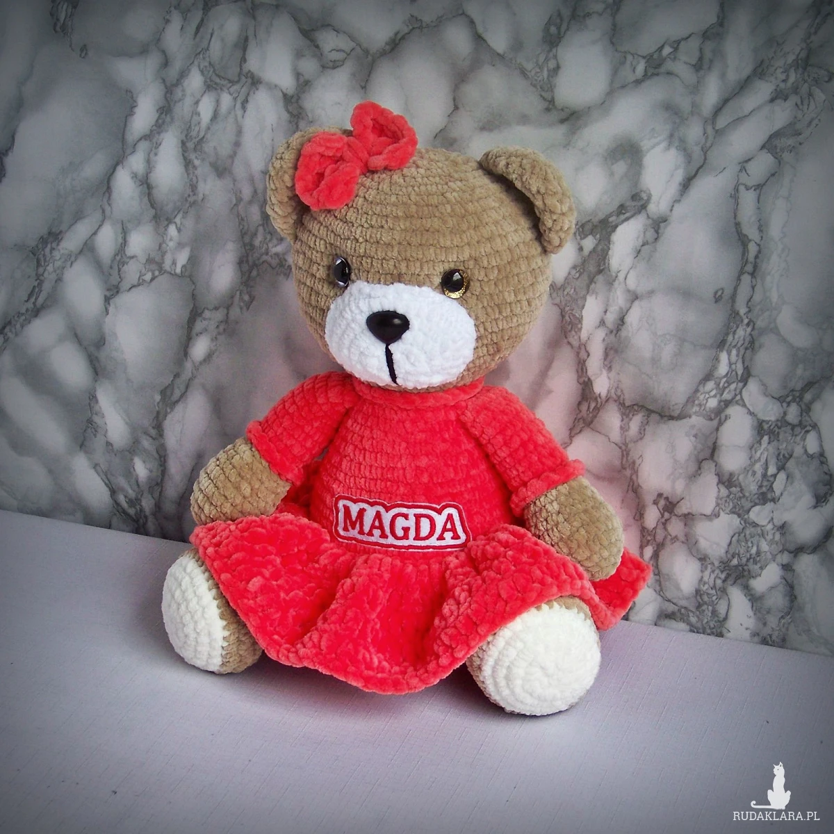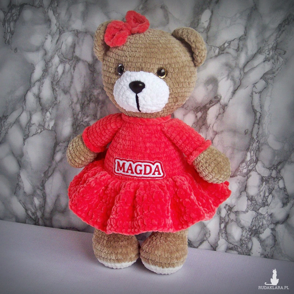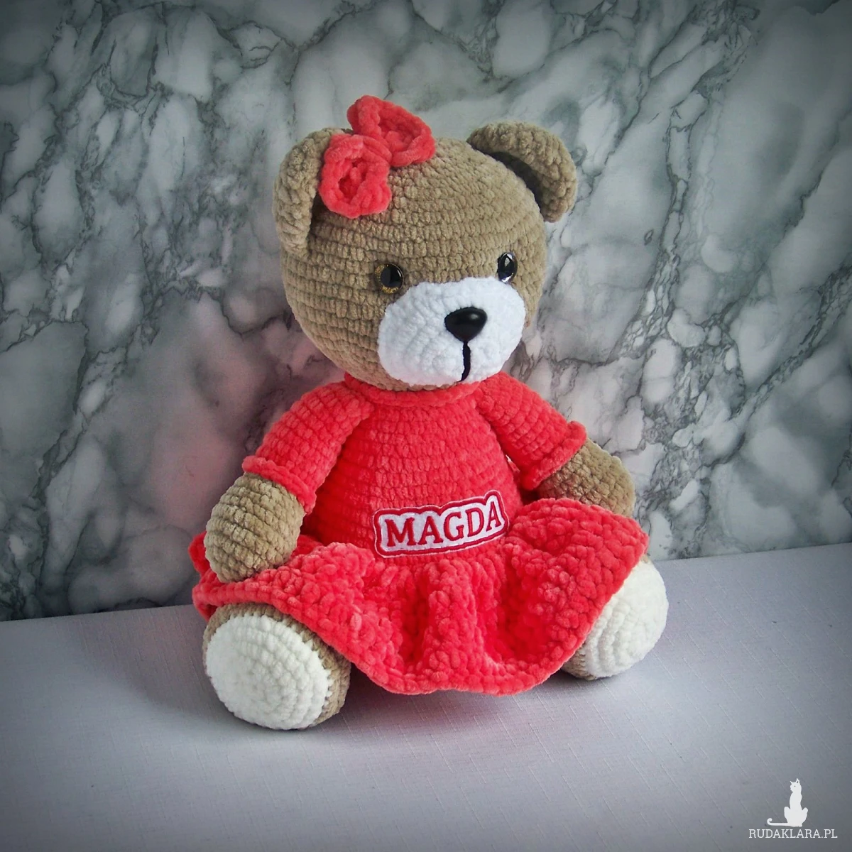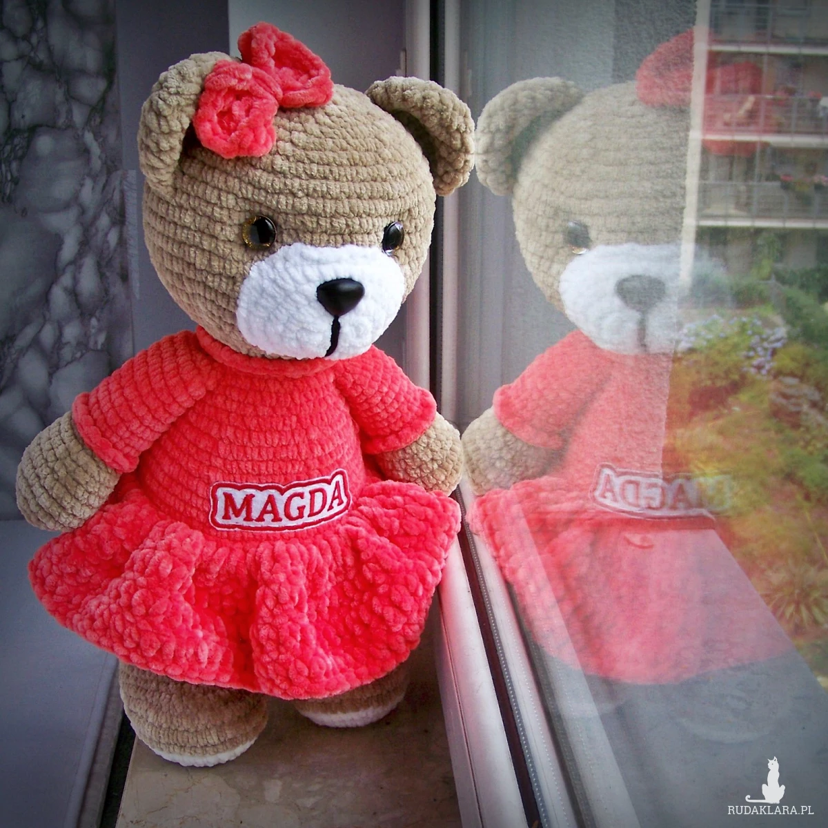 Szydełkowy miś Magda 32cm w koralowej sukience (na zamówienie)