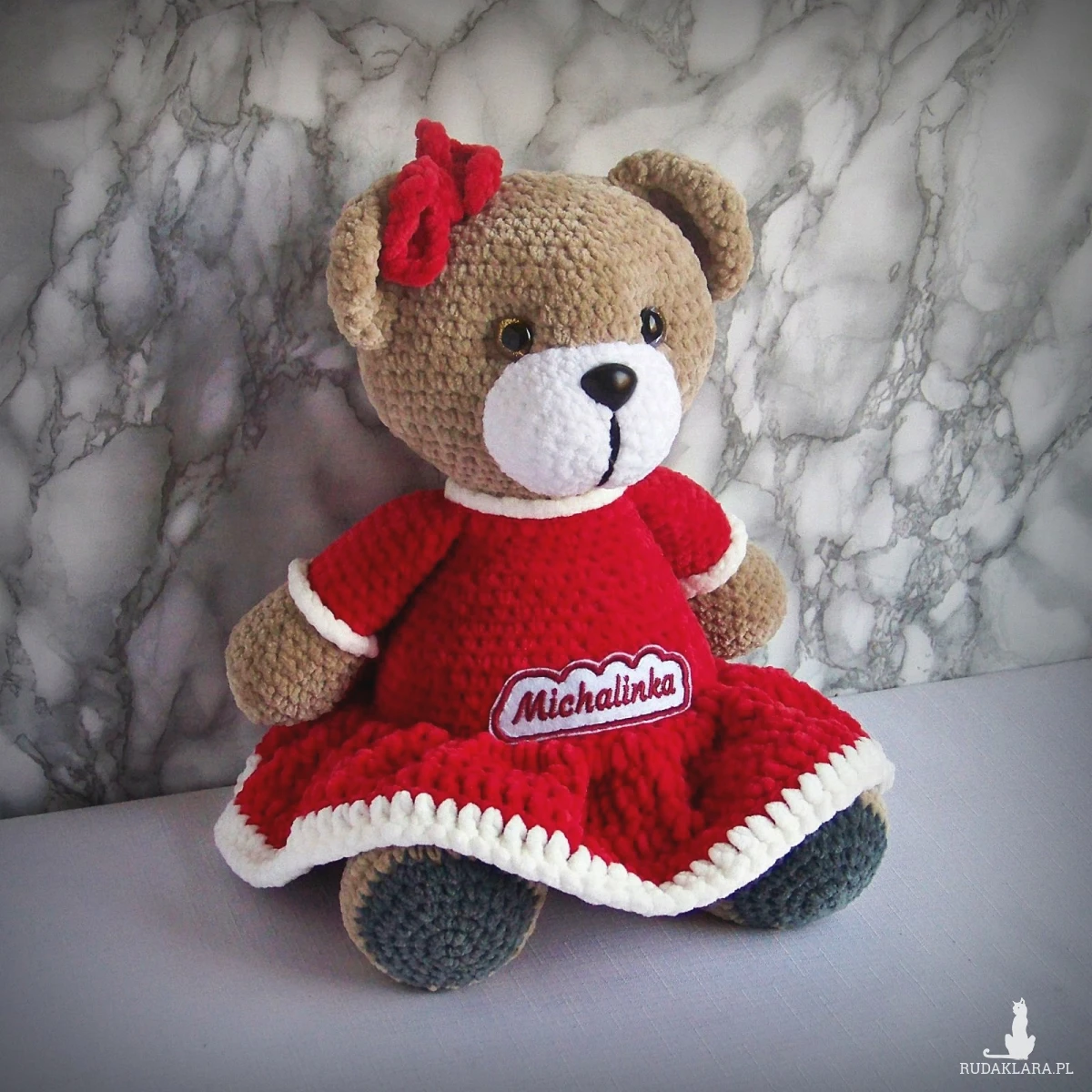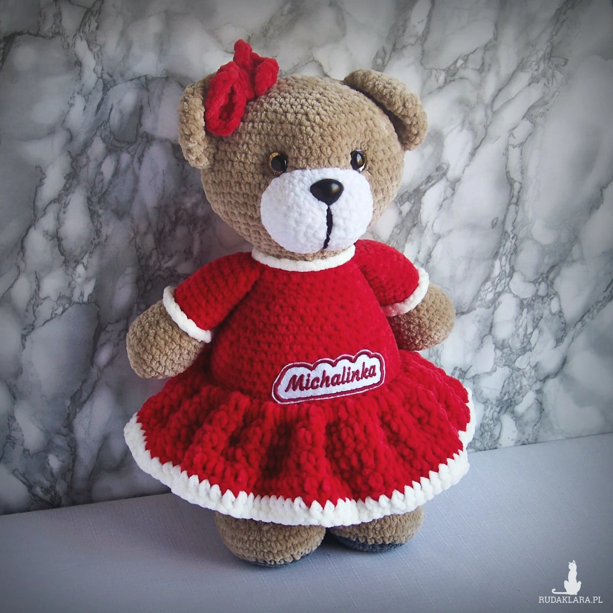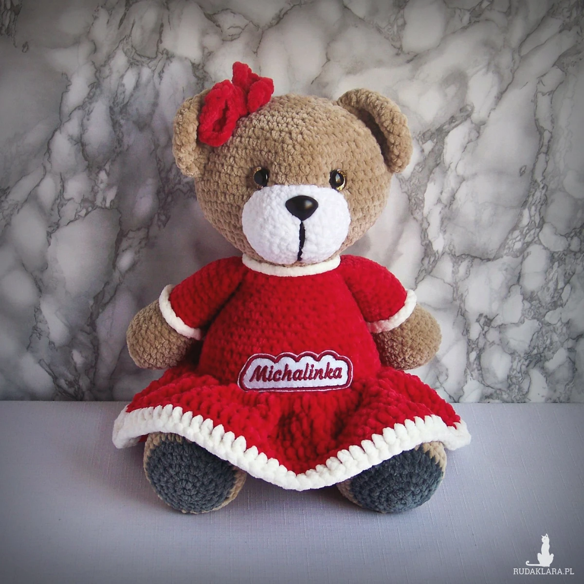 Szydełkowy miś Michalinka 32cm w czerwonej sukience (na zamówienie)