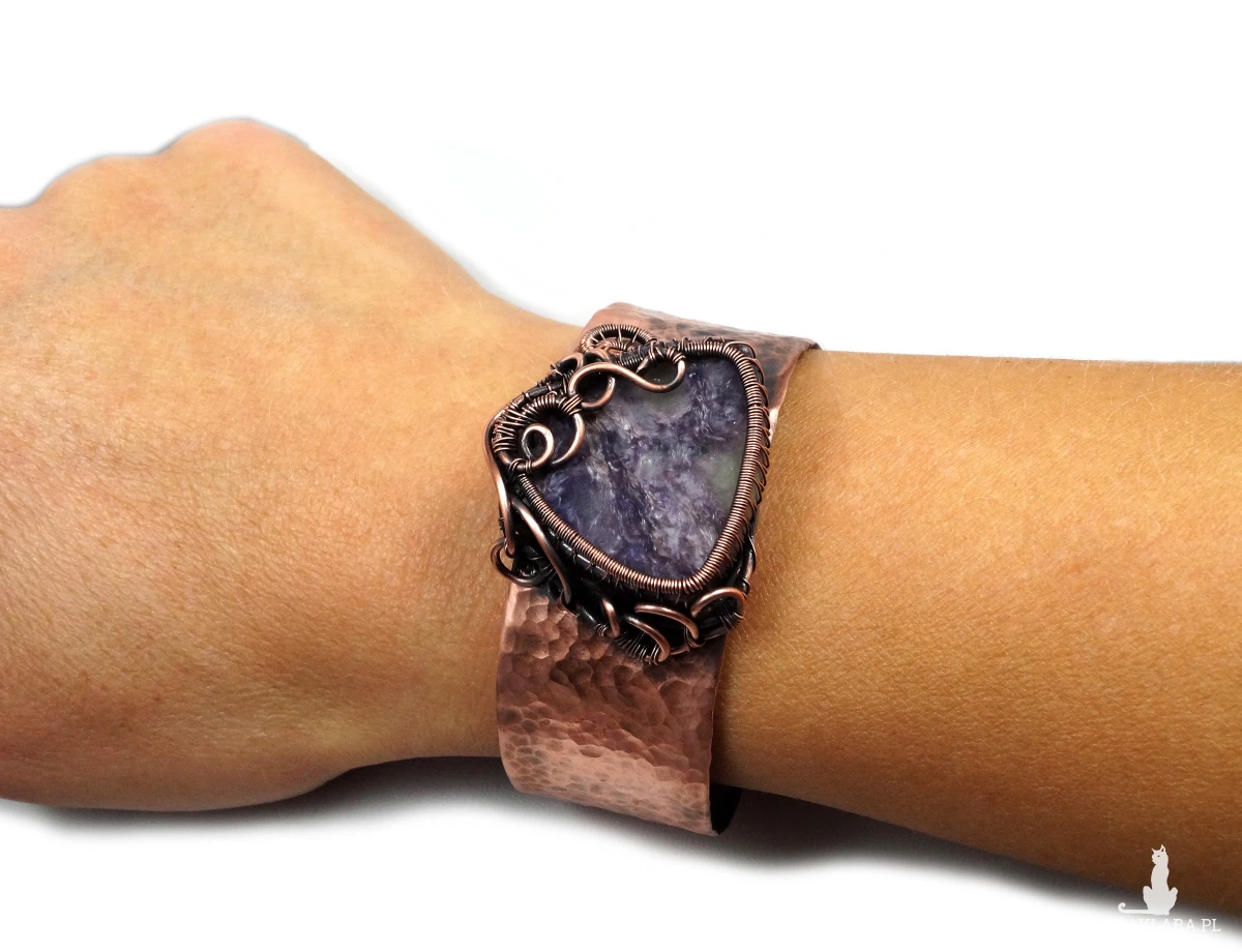 Bajeczna, misternie wykonana bransoletka z patynowanej miedzi z kaboszonem czaroitu. Bransoletka wykonana z młotkowanej miedzi i z kaboszonu czaroitu osadzonego w technice wire wrapping. Bransoletka regulowana. Miedz młotkowana, patynowana polerowana i przecierana.