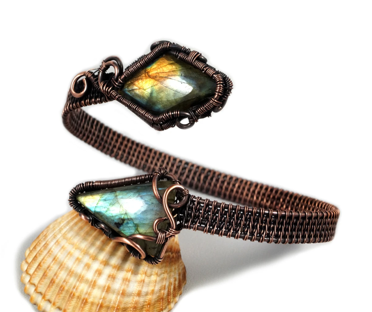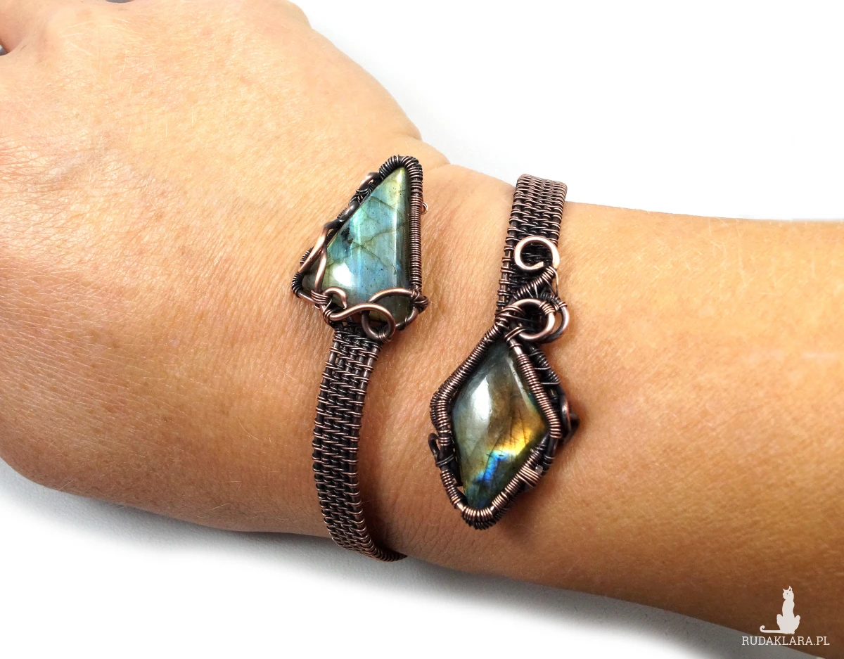 Bajeczna, misternie wykonana bransoletka z patynowanej miedzi z dwoma kaboszonami labradorytu w niebieskio pomarańczowym kolorze. Bransoletka wykonana w bardzo pracochłonnej technice wire wrapped. Bransoletka regulowana.