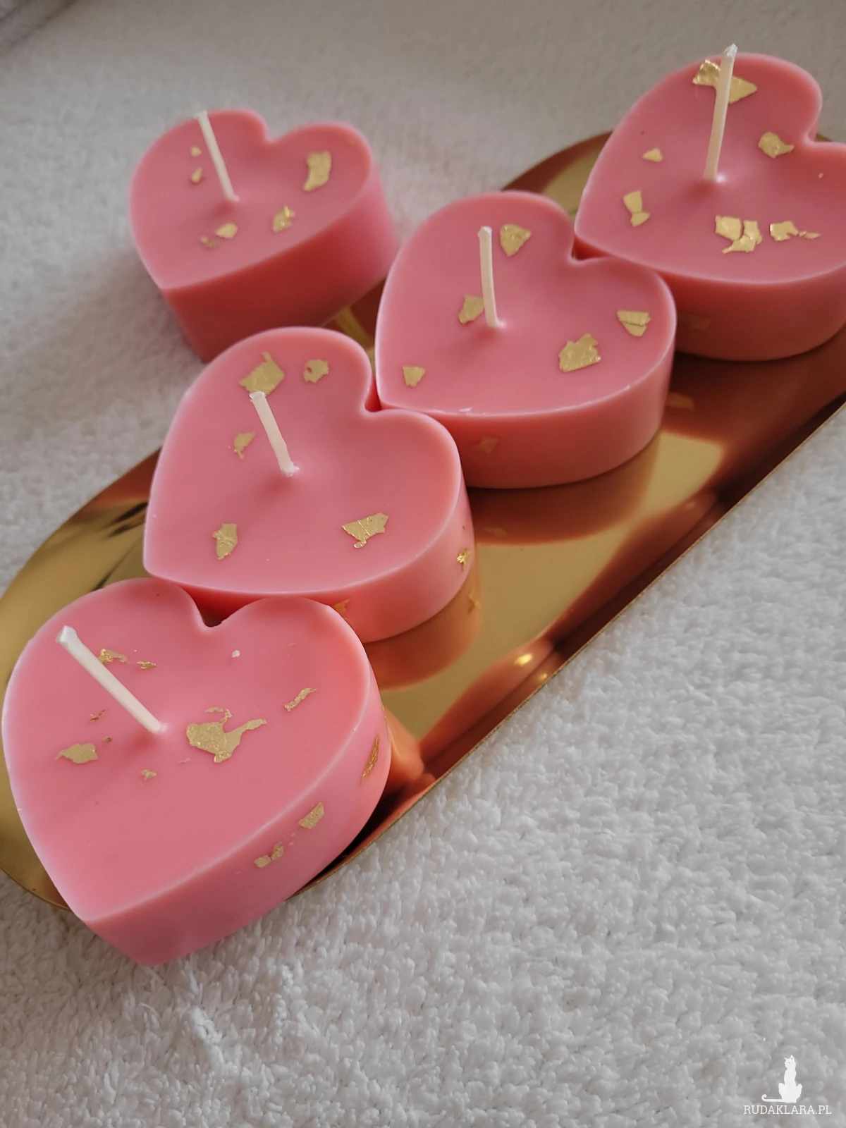 Zestaw świec sojowych handmade na zlotej tacce. Świece ozdobiłam płatkami złotej folii.