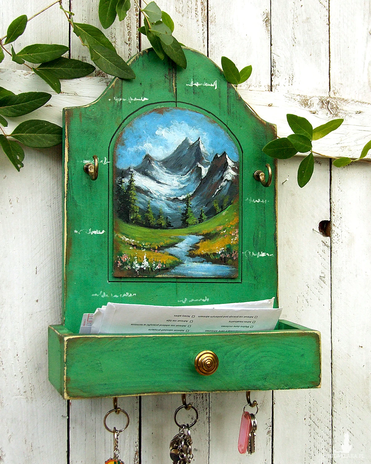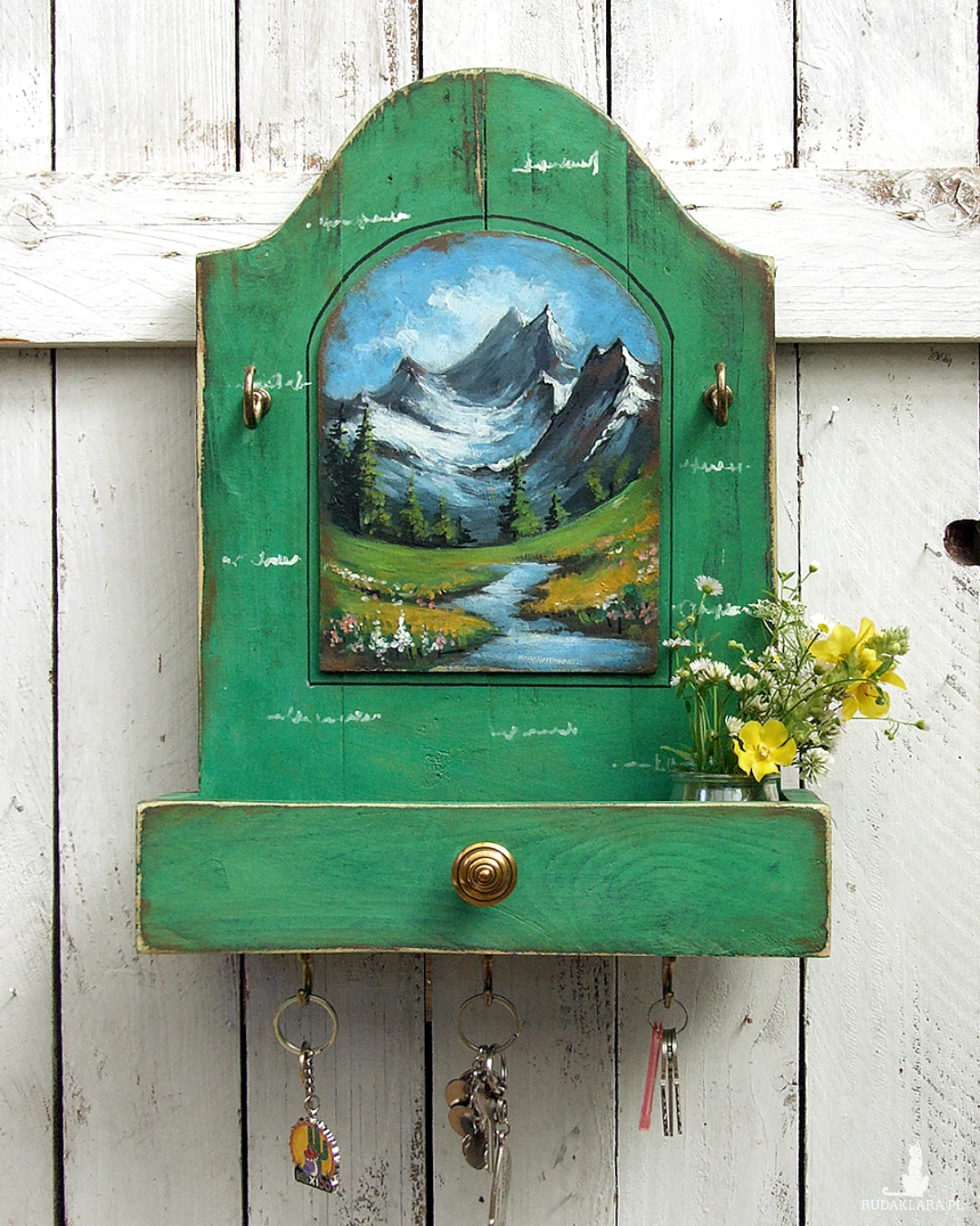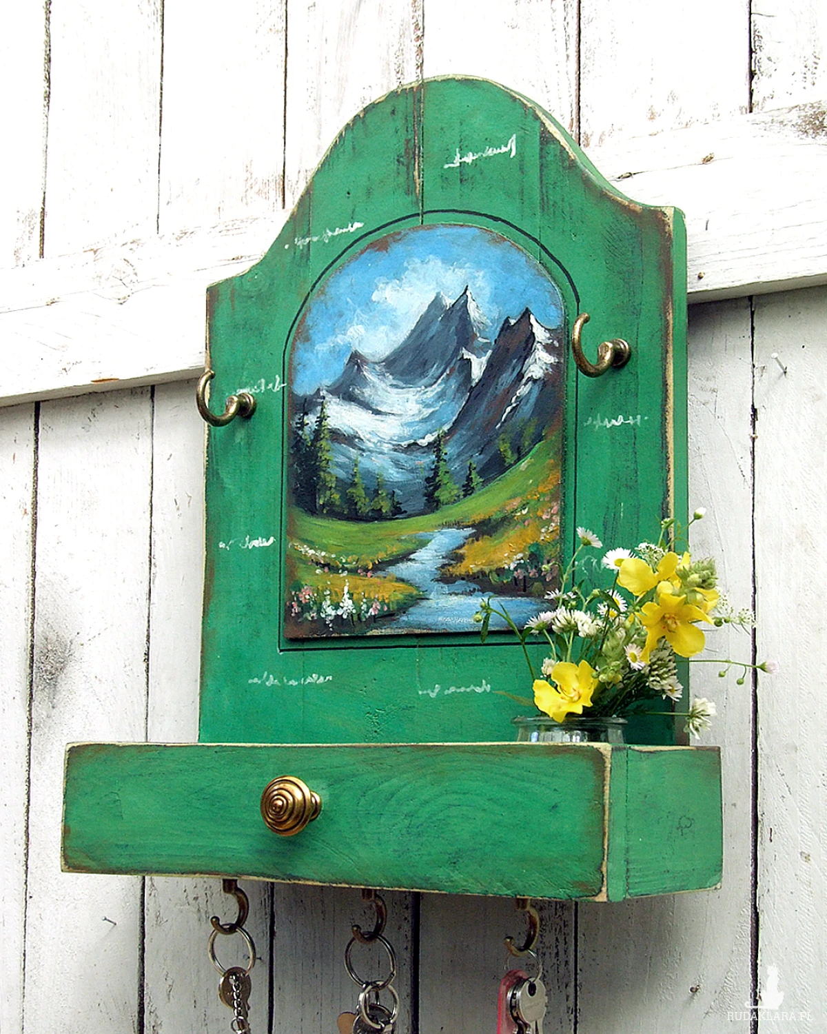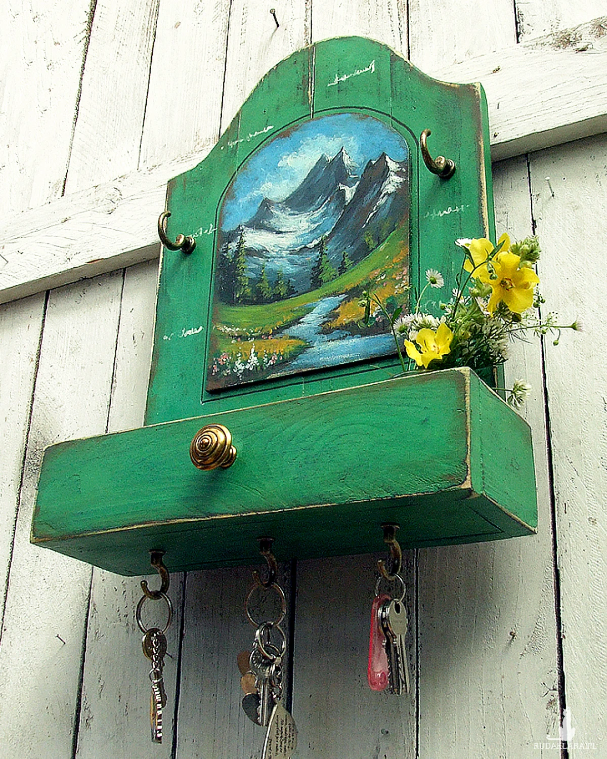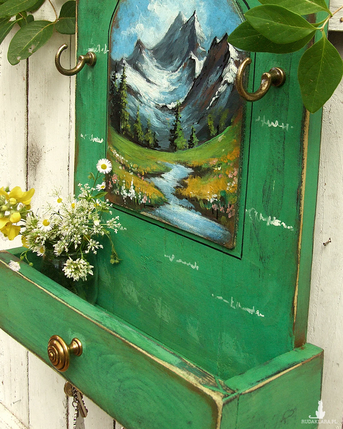 Drewniany wieszaczek, organizer, z półeczką przypominającą wysuniętą szufladkę i z malowanym pejzażem - funkcjonalna dekoracja do kuchni, przedpokoju lub łazienki.