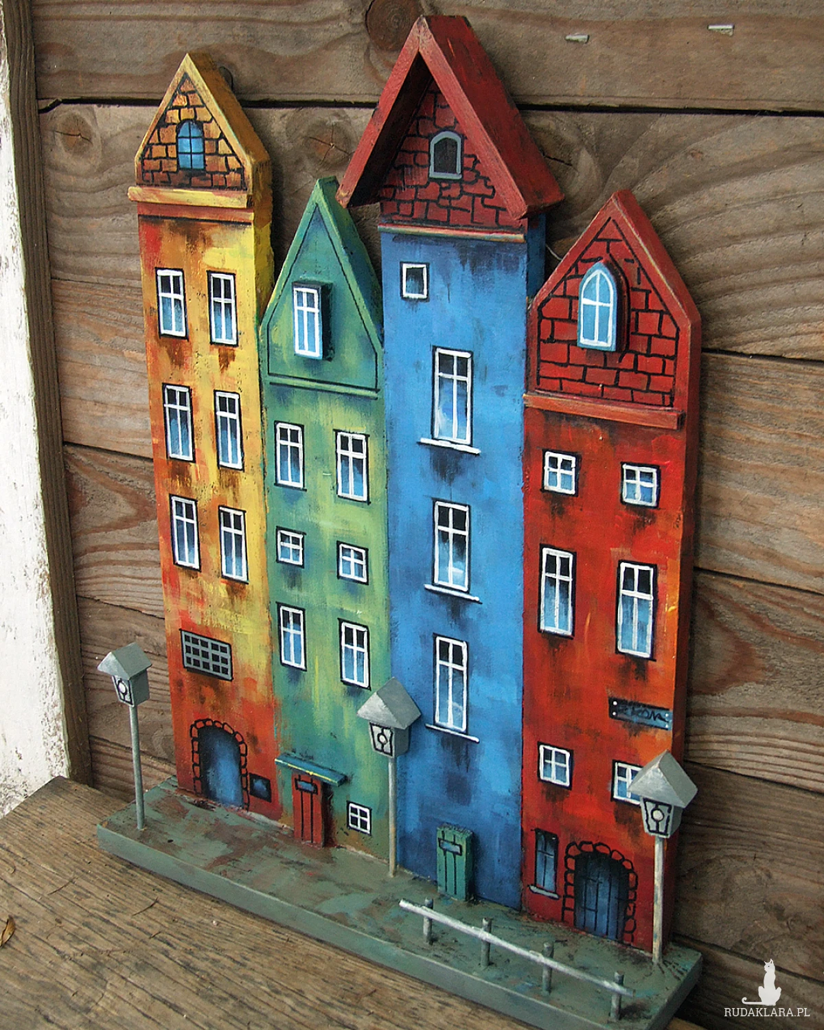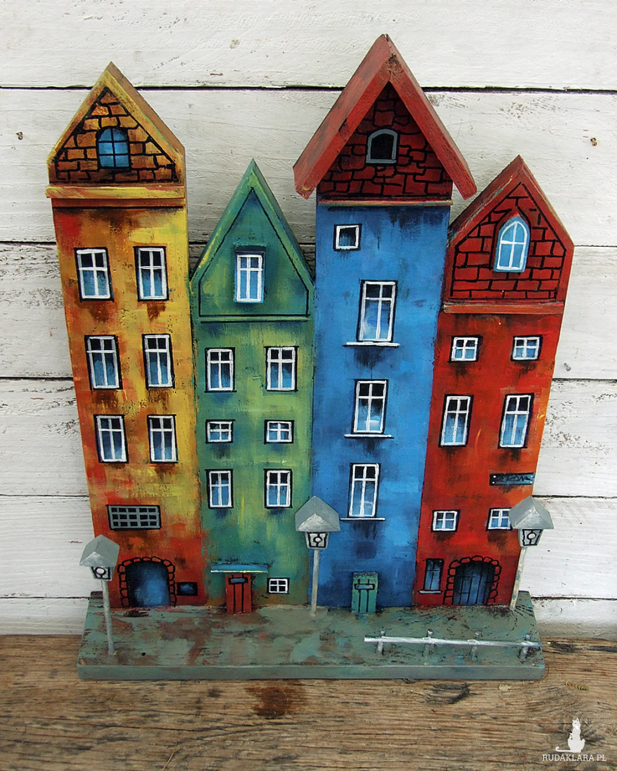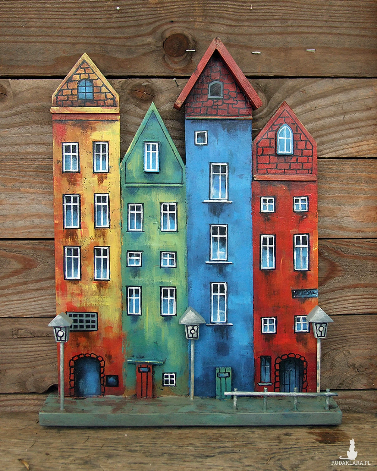 Klimatyczna dekoracja na ścianę lub do postawienia - kolorowe kamieniczki, ręcznie malowane.