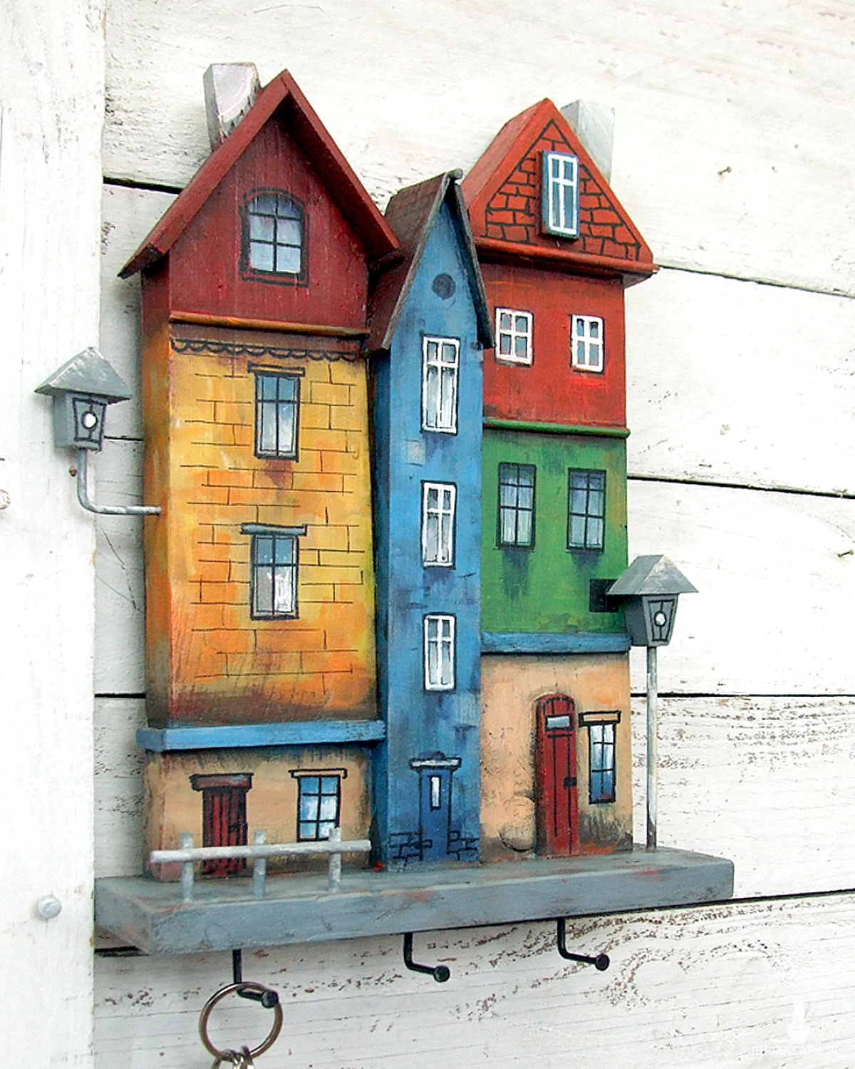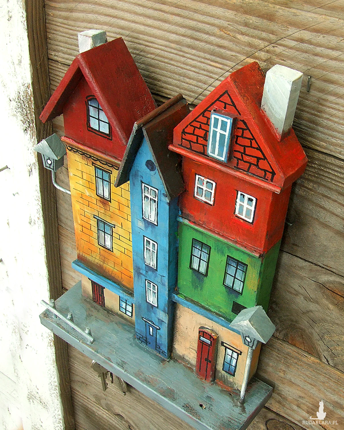 Domki mają proste kształty, całość konstrukcji nie jest więc skomplikowana, a cały efekt to bardzo dokładne i szczegółowe malowanie kamieniczek: ogromna ilość okienek, drzwi ze szczegółami, dobranie i cieniowanie koloru - to tworzy wyjątkowy klimat tej dekoracji. Całość jest zabezpieczona matowym lakierem akrylowym.