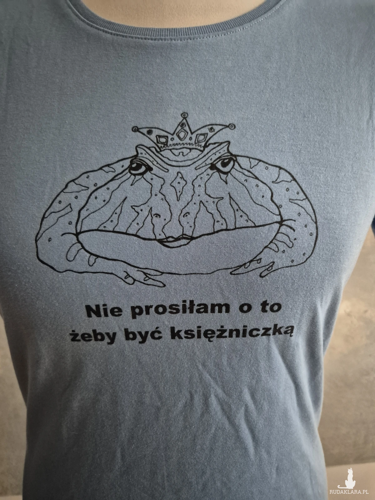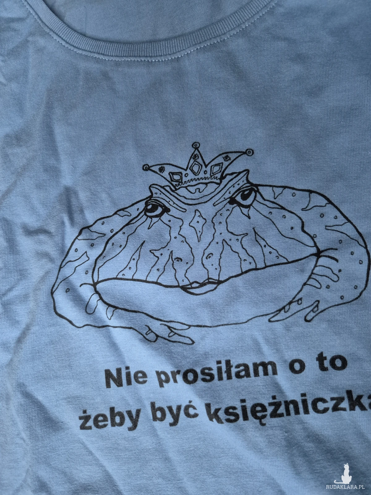Bawełniana niebieska koszulka damska z autorskim nadrukiem Nie prosiłam o to żeby być księżniczką nadruk zrobione metodą sitodruku polecam rozmiar 38/ 40