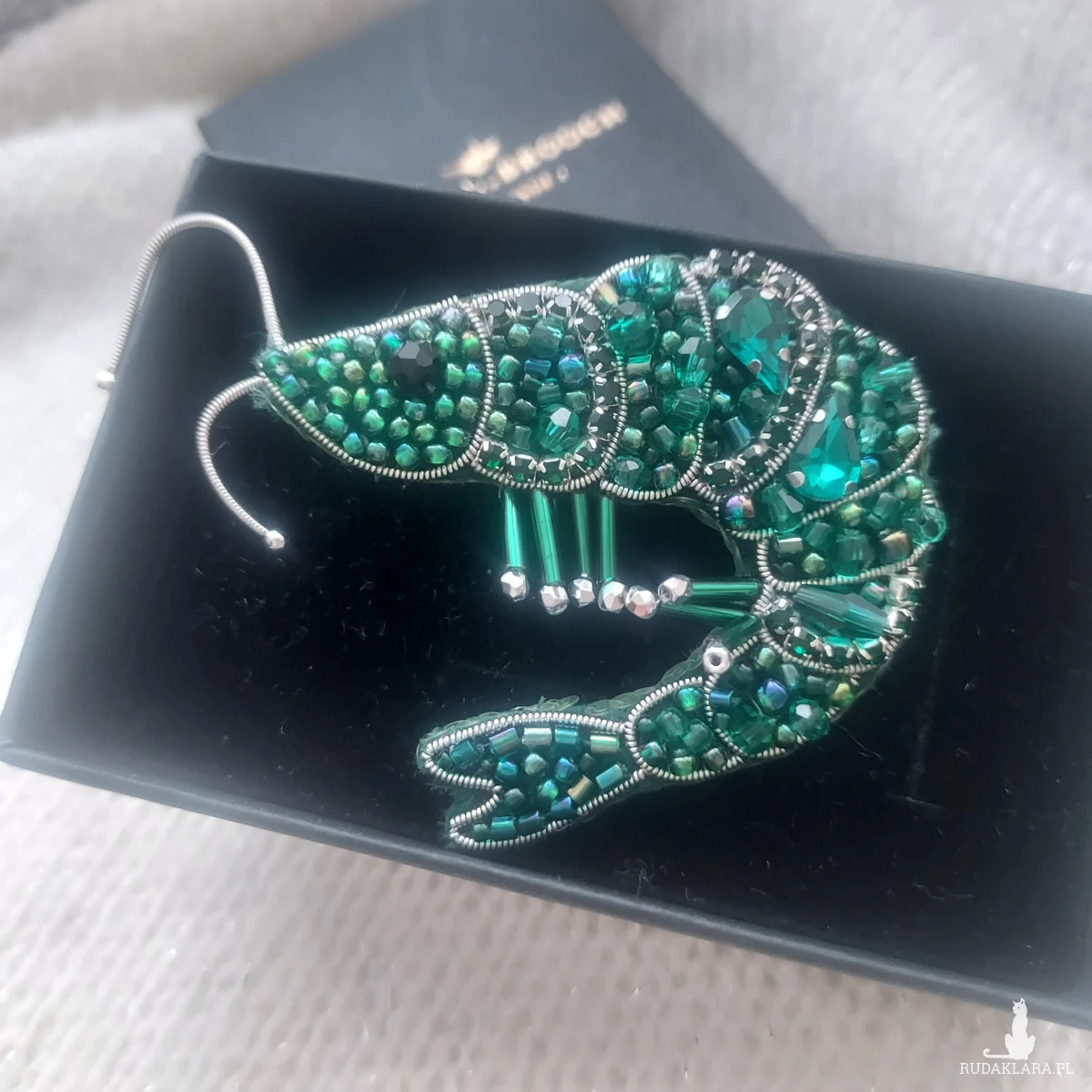Poznaj świat morskich głębin z wyjątkową broszką KREWETKĄ kolorze szmaragdowym, która powstała w pracowni techniką haftu koralikowego.