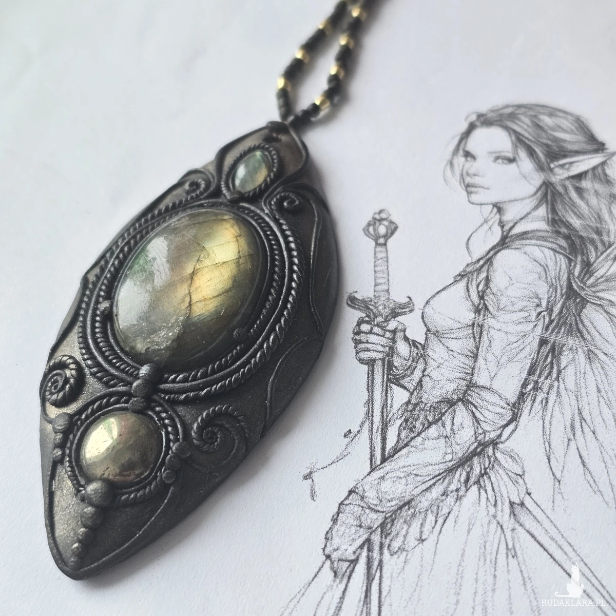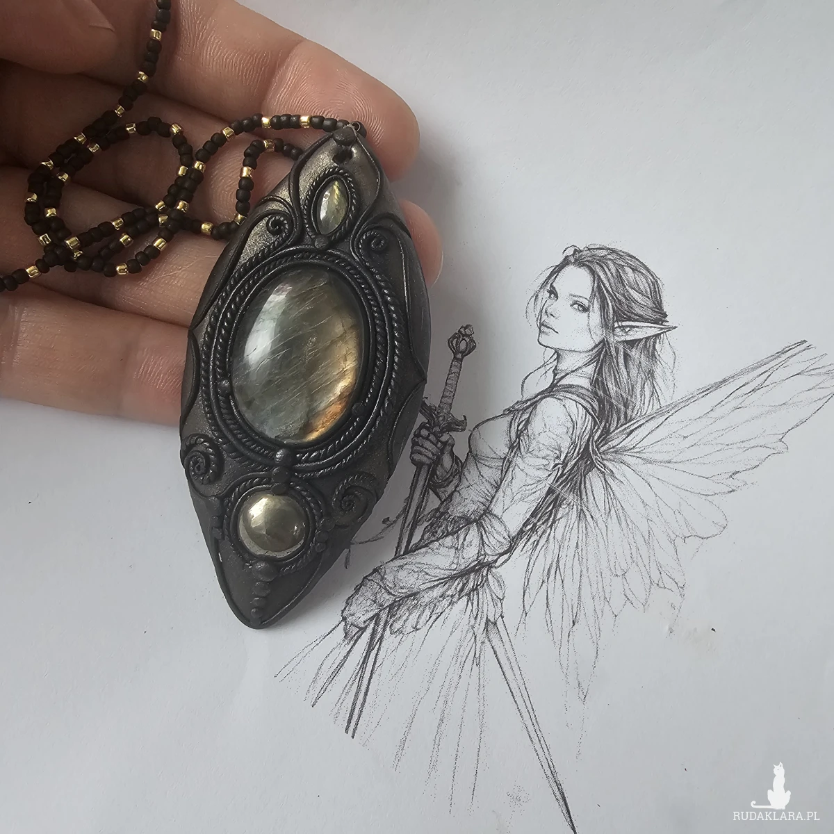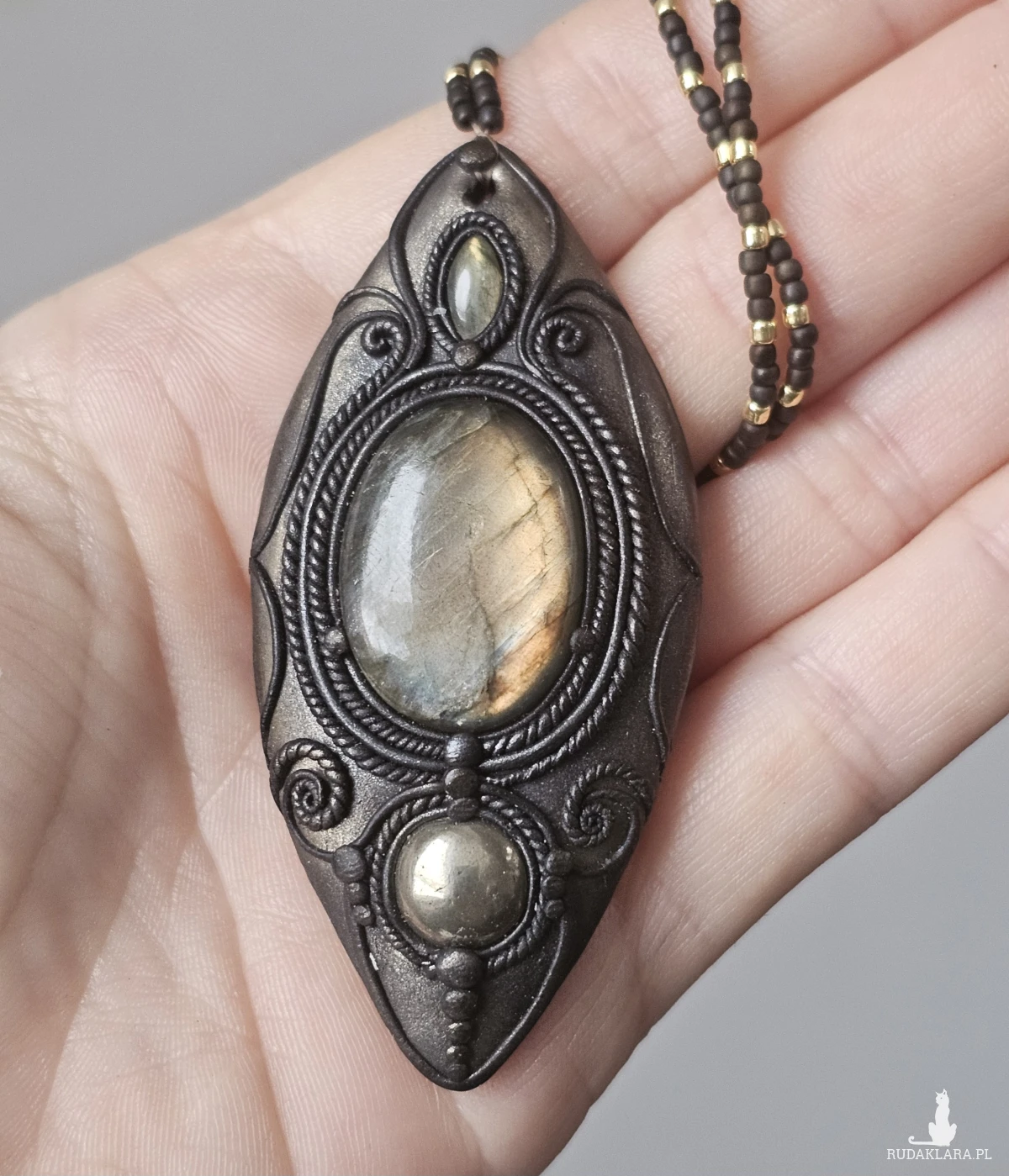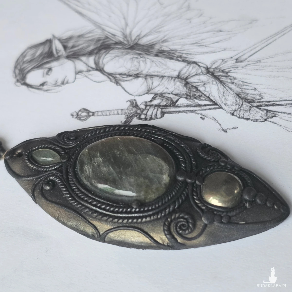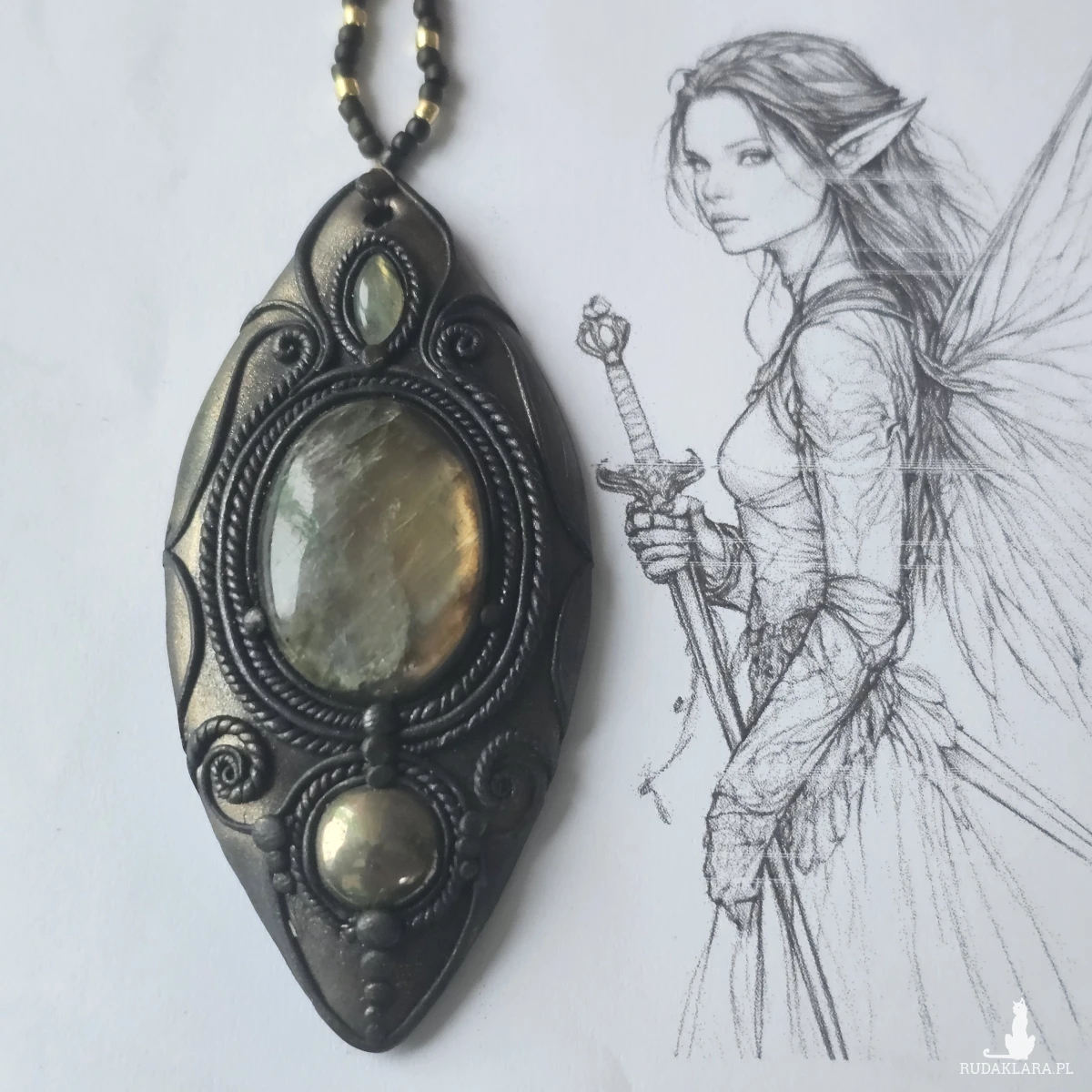 Wisior/naszyjnik/amulet/talizman wykonany misternie z gliny polimerowej. Ozdobiony filigranami, wzorami nawiązującymi do roślinnych pnączy, elfów czy do wzorów orientalnych.
