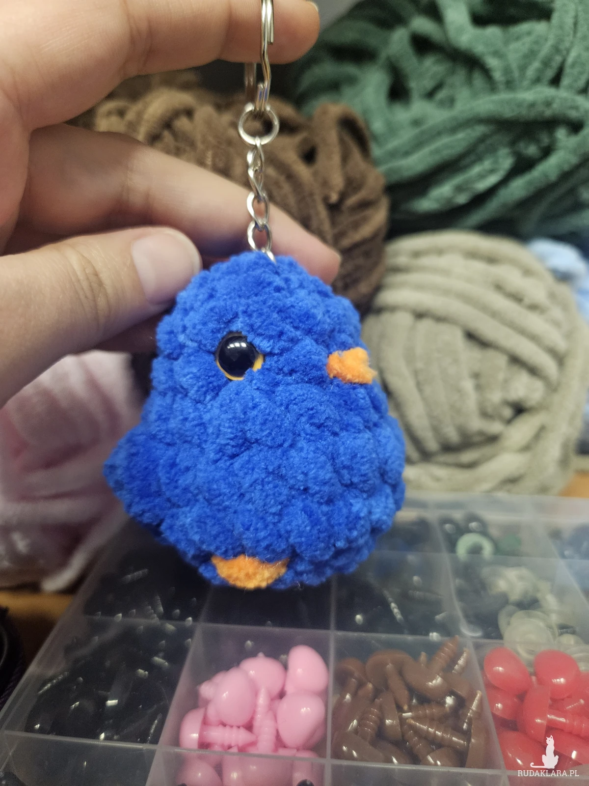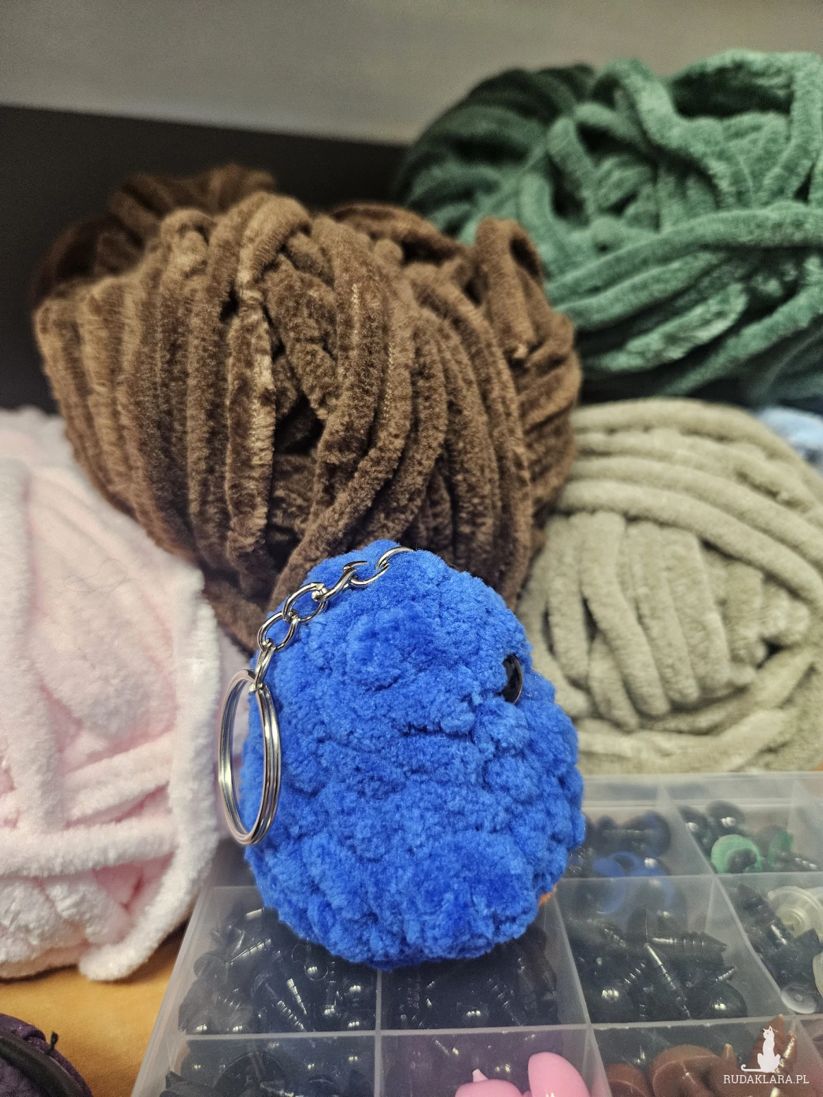 Ręcznie robione pluszaki z włóczki 100% mikropoliester i wypełniacz 100% biały silikon. Do tego guziczki na noski i oczka. Małe, nie dawać dzieciom gryść.