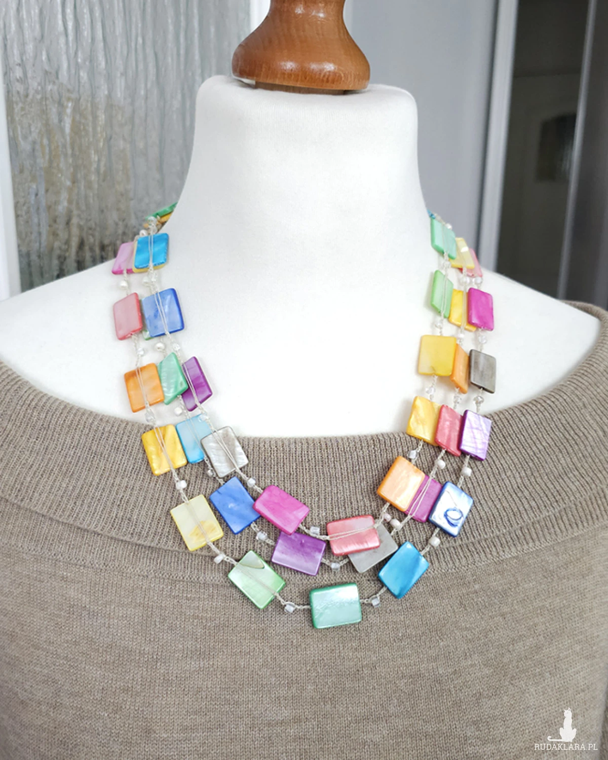 Trzy sznurki złożone z prostokątnych, mieniących się w słońcu elementów z masy perłowej tworzą efektowną, kaskadową formę. Każdy z płatków mieni się w delikatnych, pastelowych barwach, tworząc harmonijny, tęczowy wzór.