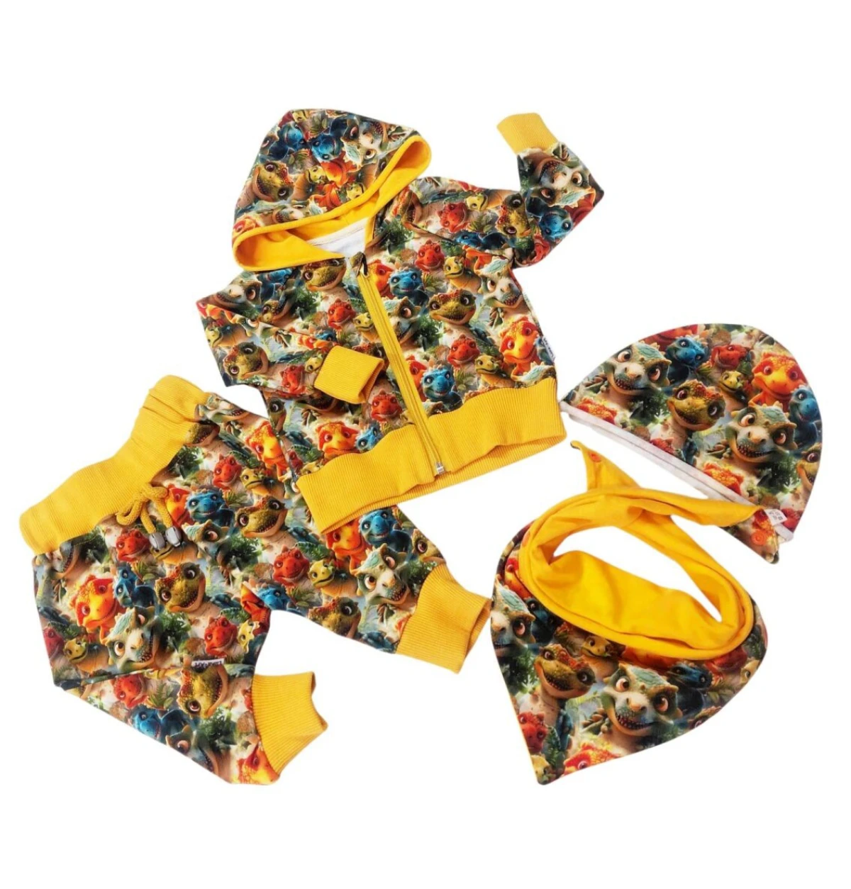 Komplet cłopięcy, 4-częściowy, uszyty z dresówki pętelki wzór cyfrowy. Dostępny rozmiar 68/74. Bluza rozpinana z kapturem. Spodnie baggy, w pasie gumka. Czapka pojedyncza. Chustka dwustronna, duża, zapinana na napy.