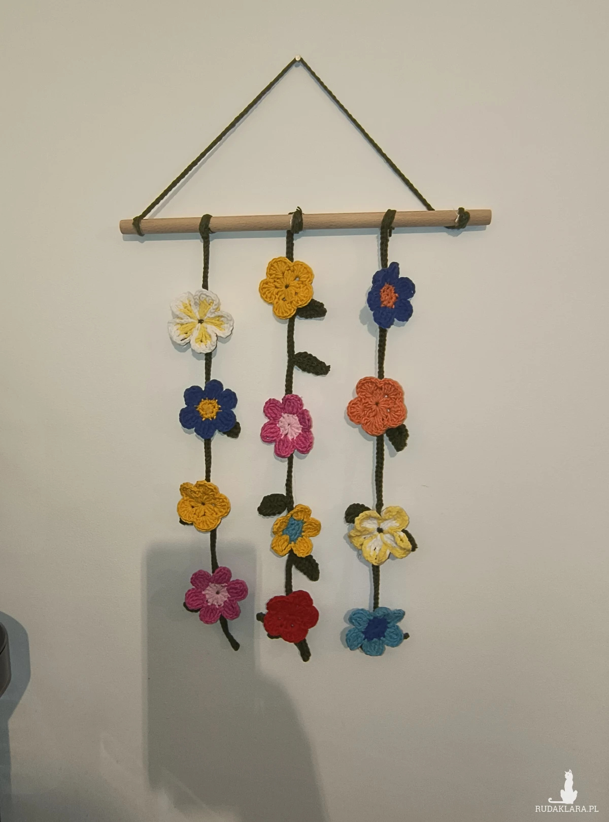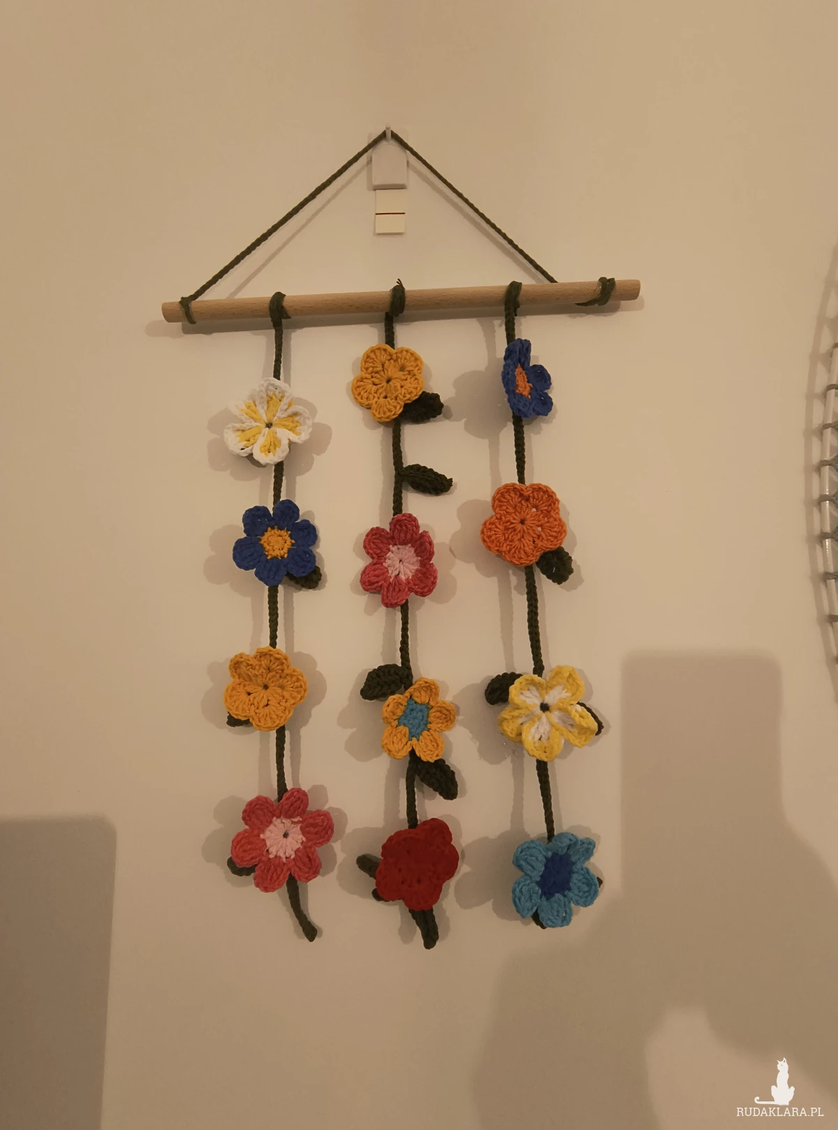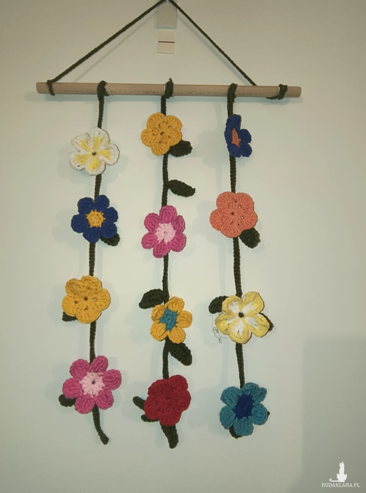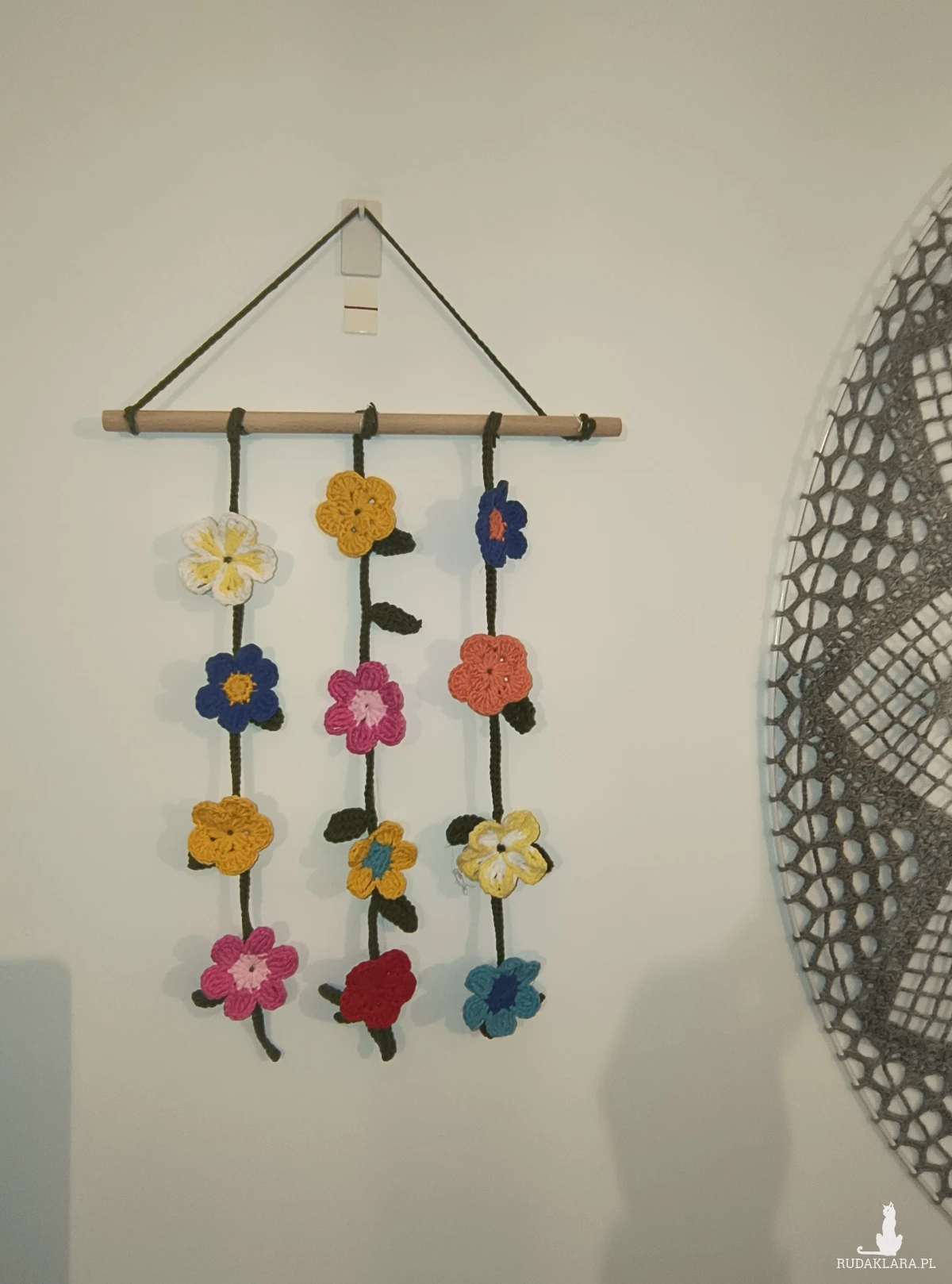Zawieszka kwiaty wykonana na szydełku. Szerokość 31 cm, długość całkowita 50. Wprowadź wiosnę do domu.