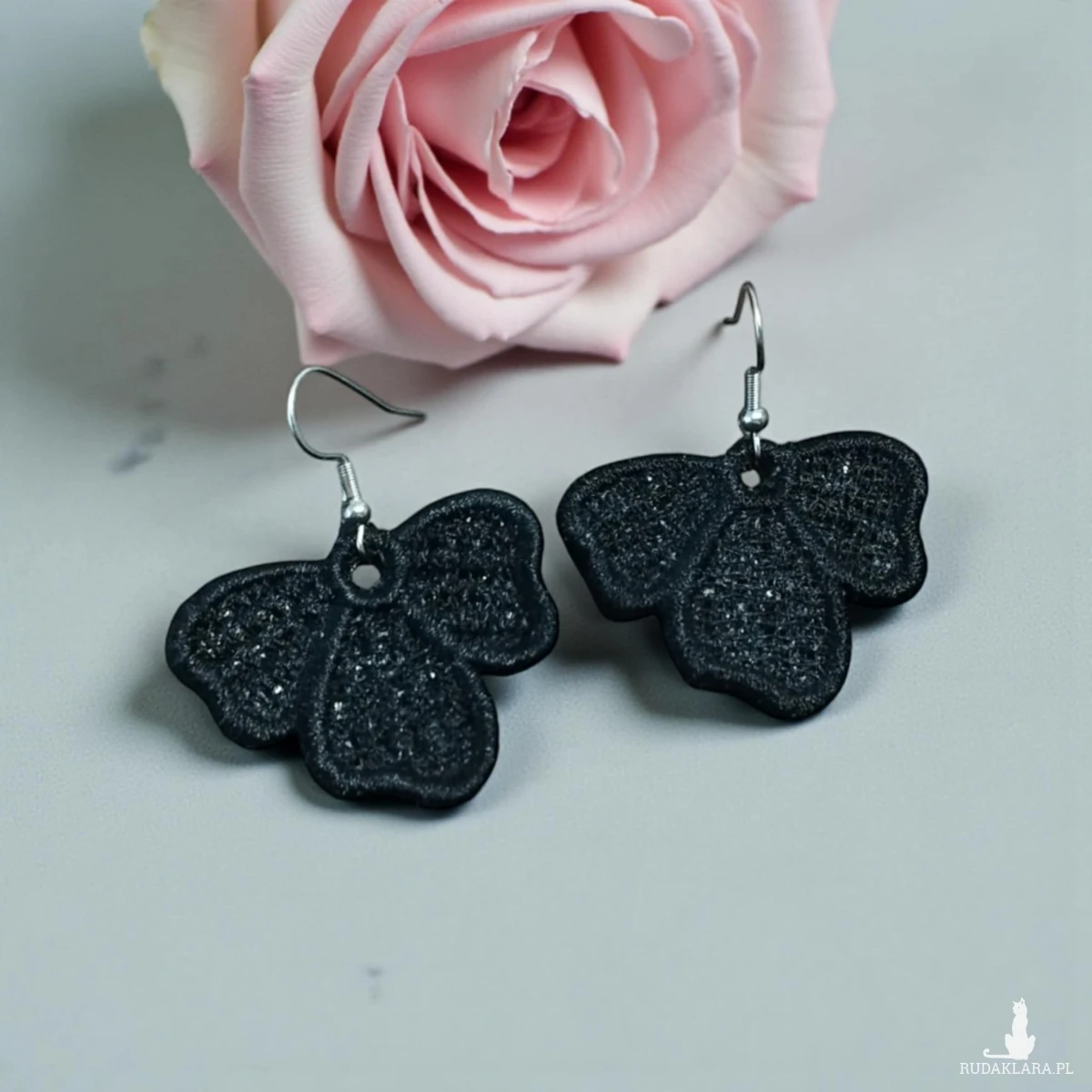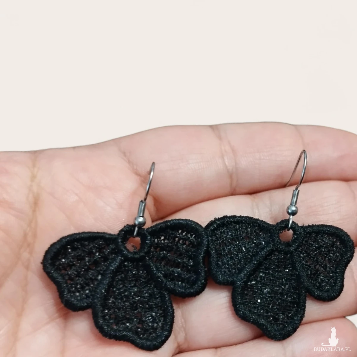 Kolczyki są haftowane (haft maszynowy). Kolczyki są sztywne w chwycie, ich kształt oraz wygląd nie zmieniają się. Haftowane kolczyki też są lekkie - to ich kolejny atut.