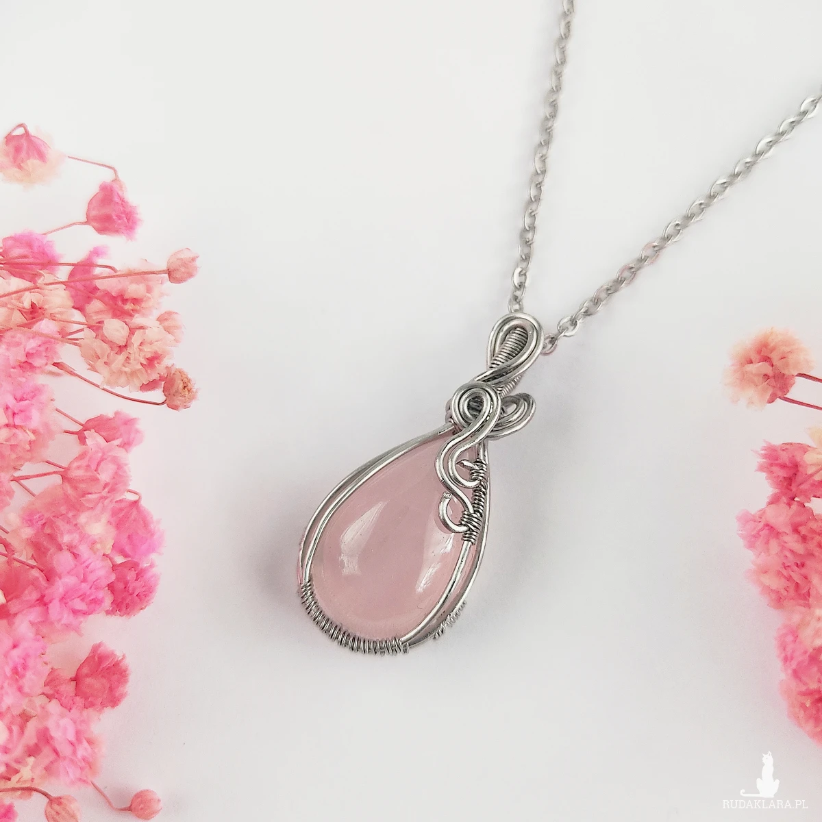 Naszyjnik Kwarc Różowy ręcznie robiony. Wykonany techniką wire wrapping z drutów ze stali chirurgicznej.