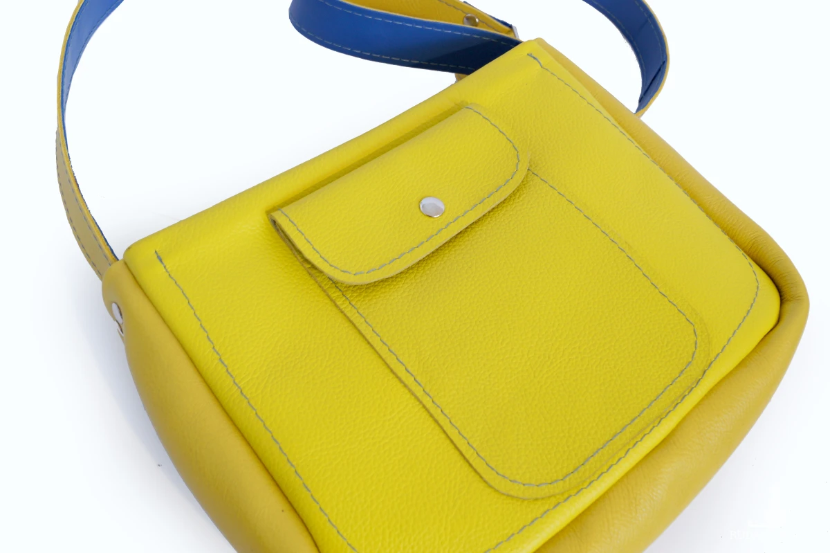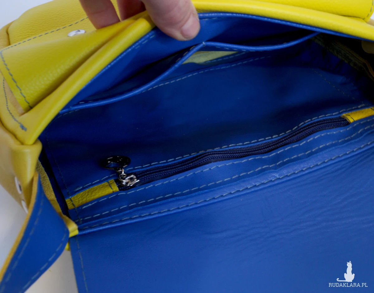 Niewielka, elegancka torebka o kroju klasycznej teczki. Uszyta ze świetnej jakości, mięsistej skóry naturalnej w kolorze żółtym (cytrynowym). Posiada dużą główną komorę, w której znajdują się kieszeń na zamek i dwie kieszenie otwarte. Z tyłu kieszeń na telefon. Wysokość – 20cm, szerokość – ok.28cm, głębokość głównej komory – ok 6cm, długość paska – max.130cm.