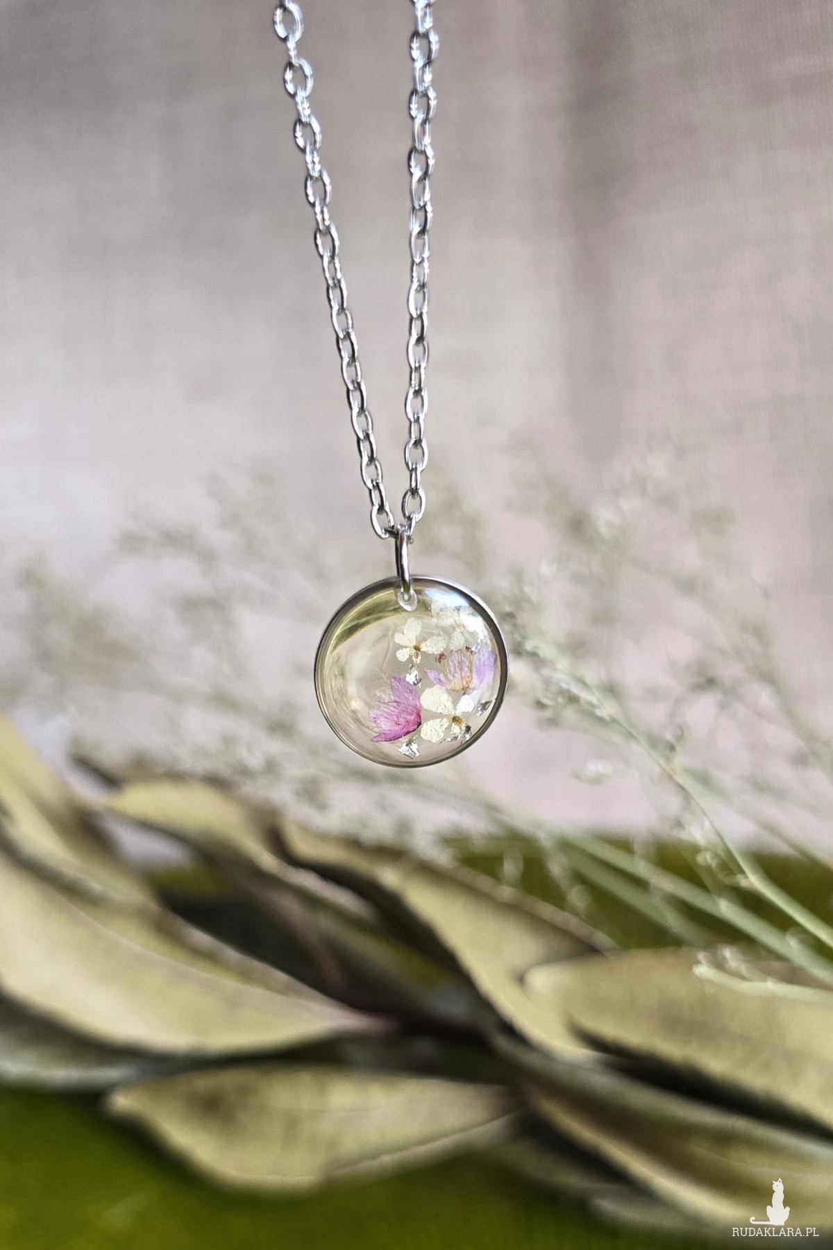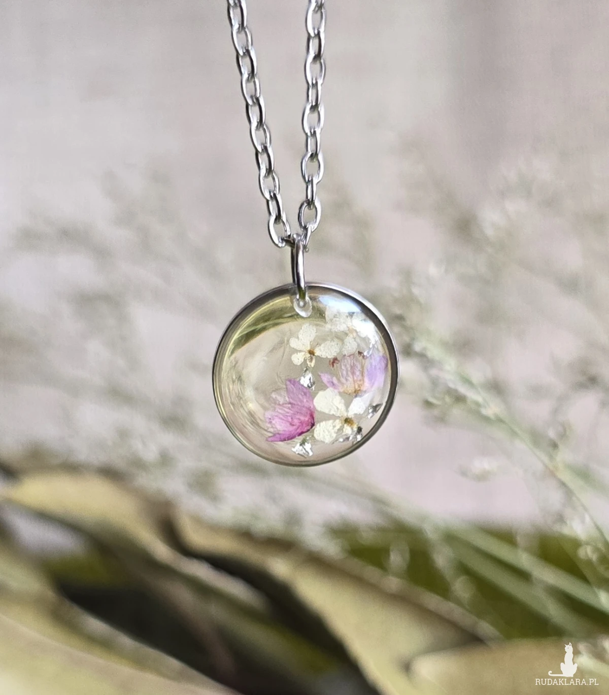 Oferuję Państwu unikalną biżuterię. Zawieszka jest wykonana z suszonych kwiatów i żywicy epoksydowej. Biżuteria jest wspaniałym i oryginalnym prezentem na lata.
