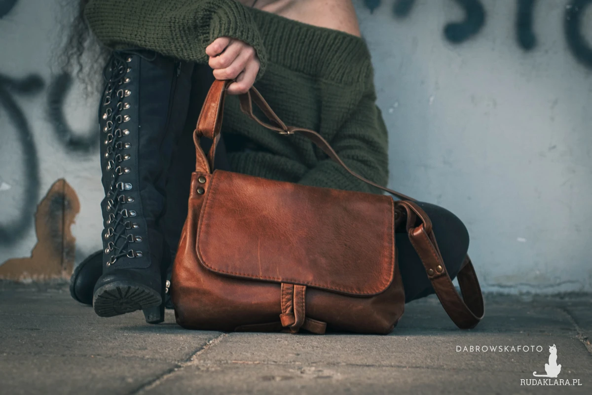 Średniej wielkości, funkcjonalna i wygodna torebka. Uszyta ze świetnej jakości, skóry bydlęcej, licowej, o nieregularnej, pięknej fakturze i delikatnym połysku . Prosty, autorski krój. Zapinana na zamek oraz na skórzany troczek. Wewnątrz podszewka, kieszeń na zamek i dwie kieszenie otwarte. Z tyłu kieszeń na zamek. Wysokość – 24, szerokość – 30, szerokość – 82cm, regulowany pasek długi na max. 130 cm.