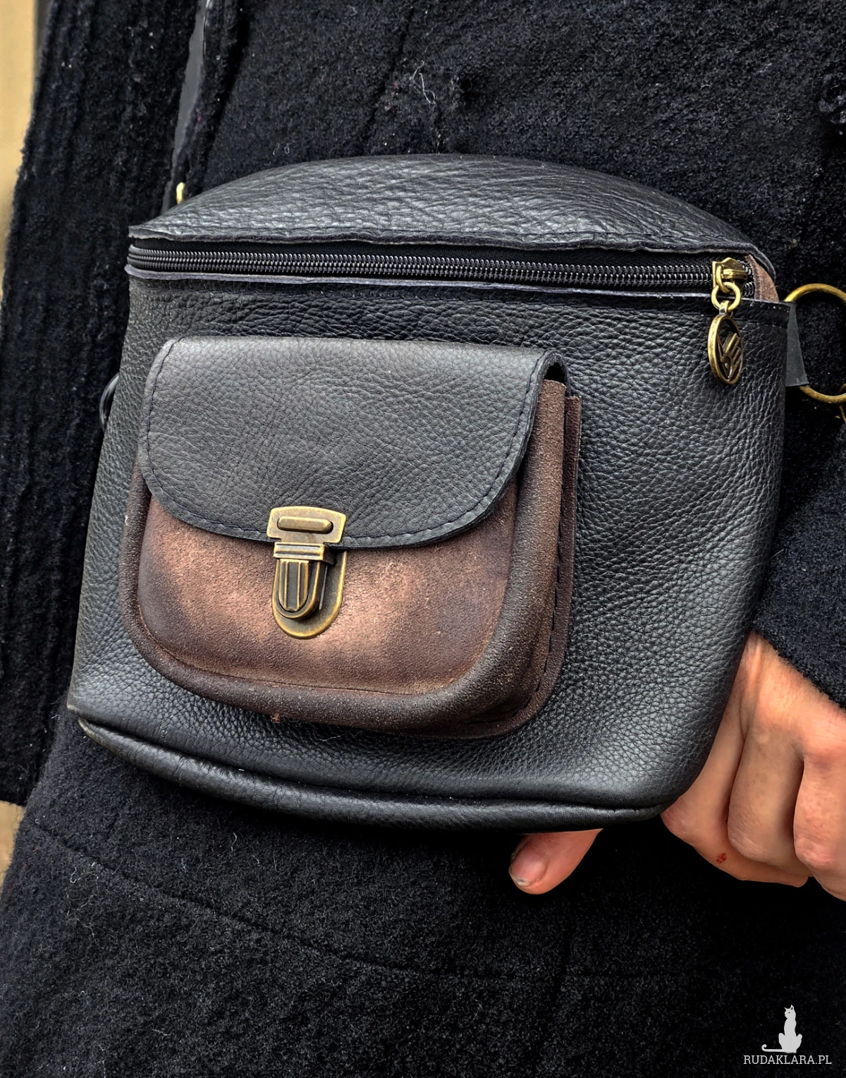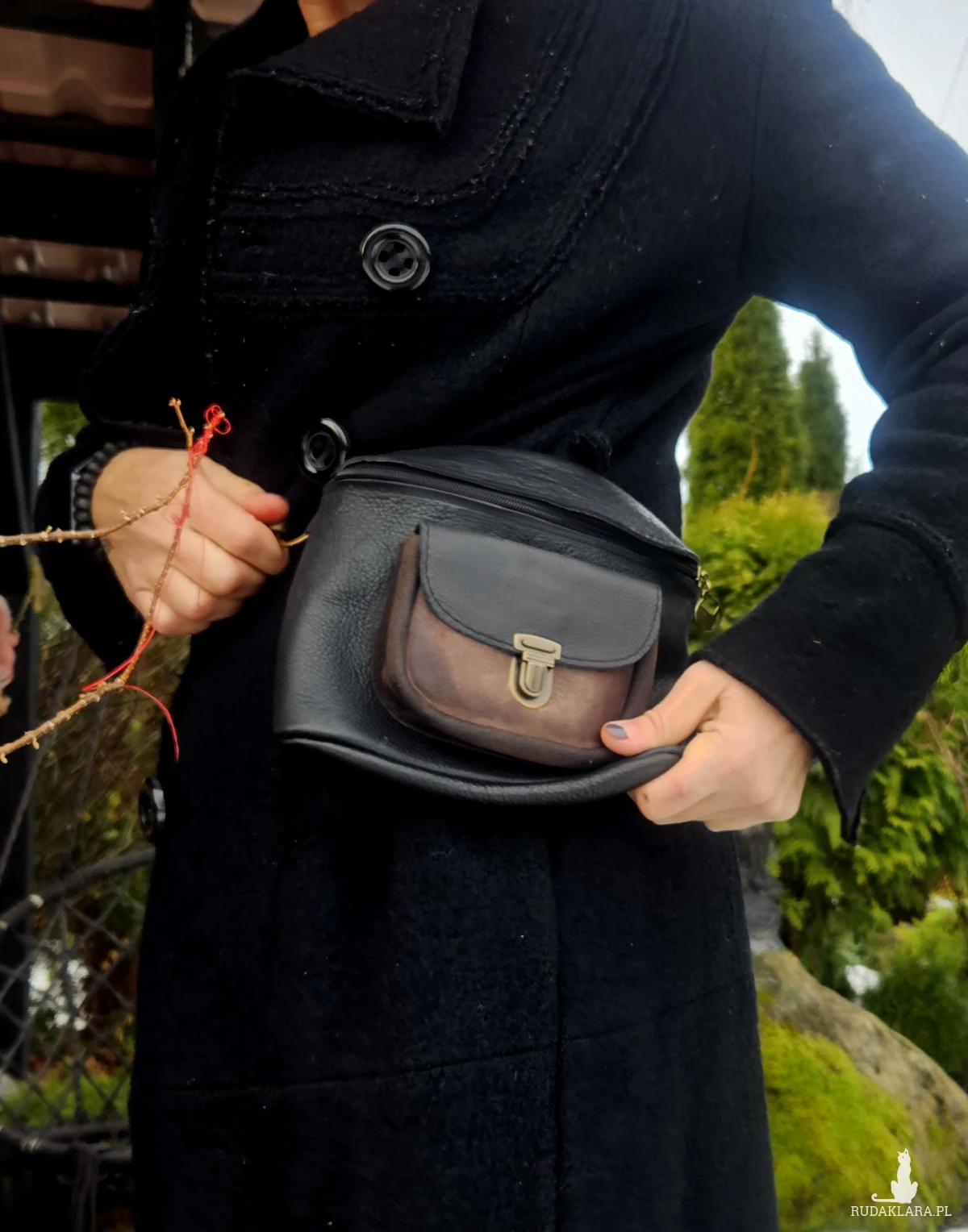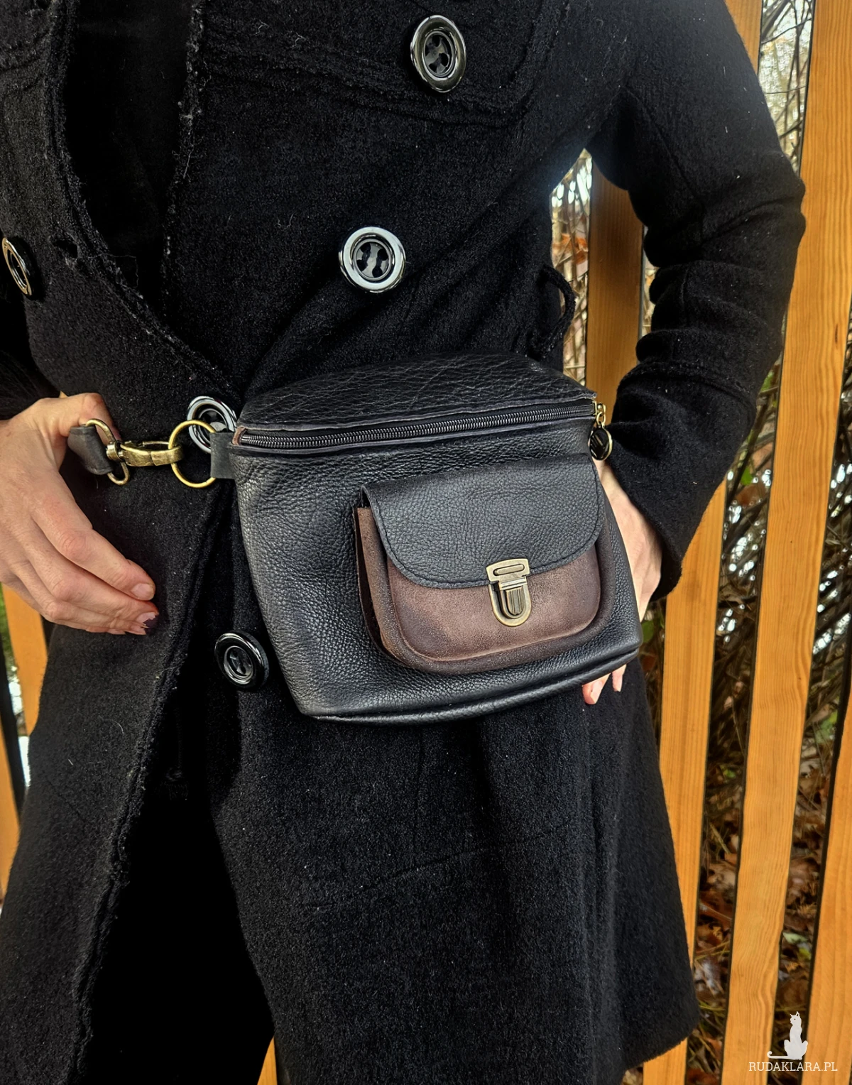 Fajna, miękka torebeczka na pas uszyta z czarnych i brązowych skór naturalnych o różnych odcieniach i fakturach. Brązowy zamsz, z którego uszyta jest przednia kieszeń jest postarzany na krawędziach. Niewielka ale pojemna, pomieści telefon, portfel, chusteczki i najpotrzebniejsze kosmetyki. Z tyłu kieszeń na zamek, wewnątrz przegródka. Sprzedawana w komplecie z regulowanym paskiem zapinanym na karabińczyki. Można ją nosić również na ramieniu. Wymiary: 21/17cm.