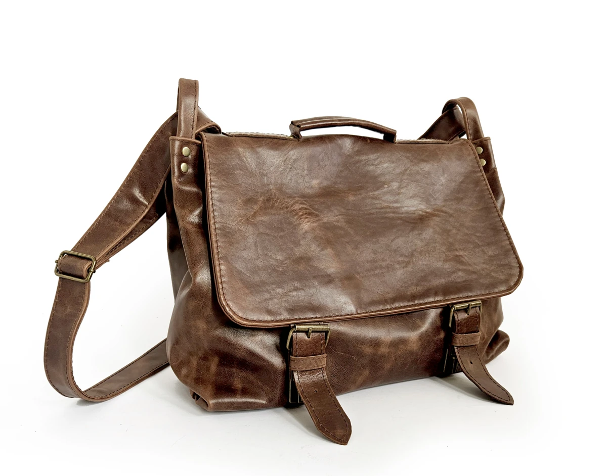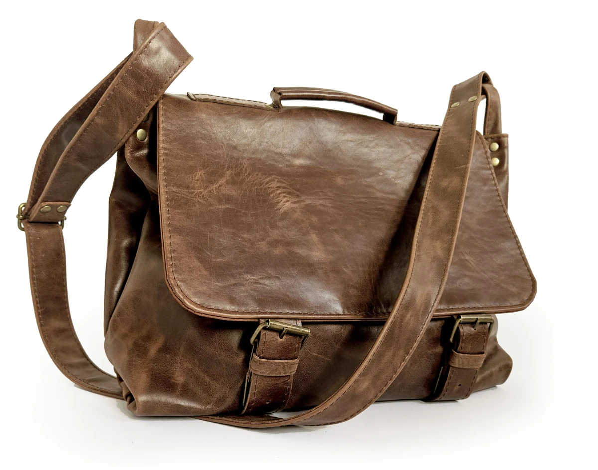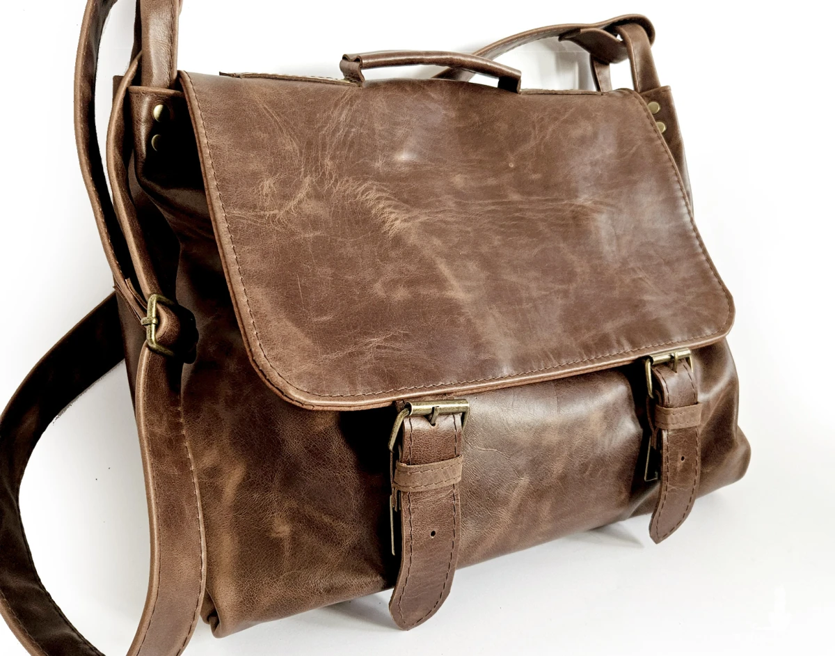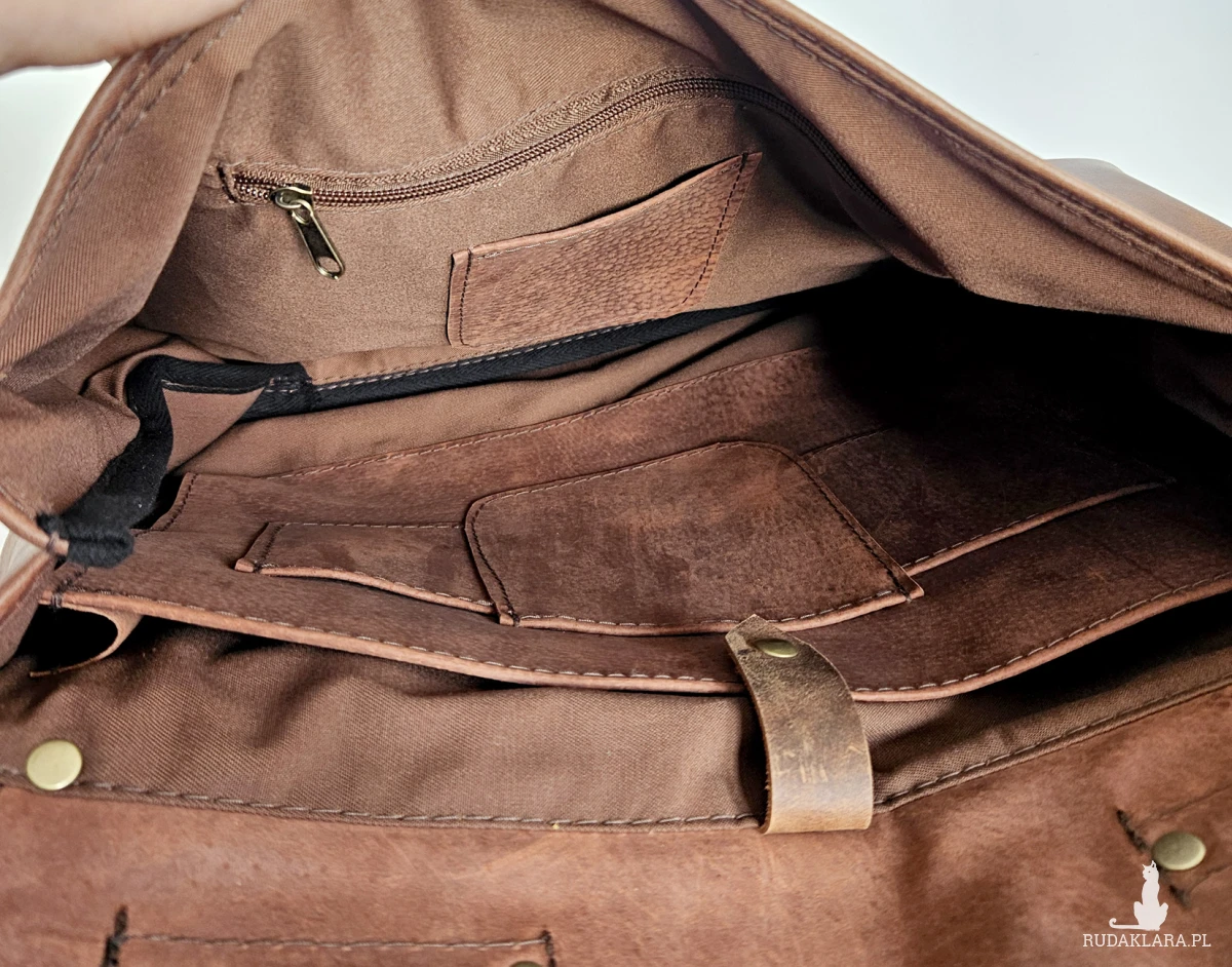 Duża, funkcjonalna i wygodna torba, uszyta ze świetnej jakości, pięknej skóry bydlęcej, licowej, olejowanej. Bardzo pojemna, mieści swobodnie format A4 i dużo więcej. Piękny, kasztanowo-brązowy, nieregularny kolor. Minimalistyczny, autorski krój. Zapinana na zatrzaski ukryte pod klamrami. Wewnątrz podszewka, duża kieszeń na laptopa (format A4, lub laptop 14”) kieszeń na zamek i cztery małe kieszenie otwarte. Z tyłu duża, zasuwana kieszeń. Wysokość – 34, szerokość – 42, szerokość – 14cm, regulowany pasek długi na max. 140 cm.