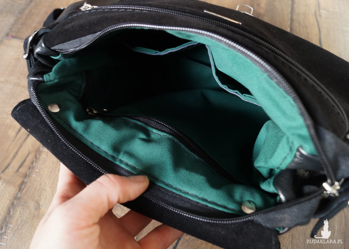 Dwie, duże kieszenie na zamek i dwie otwarte. Wysokość – 25cm, szerokość – 25/30cm, głębokość – 13cm, dł. odpinanego paska – max. 130cm, długość szelek – max. 80cm.