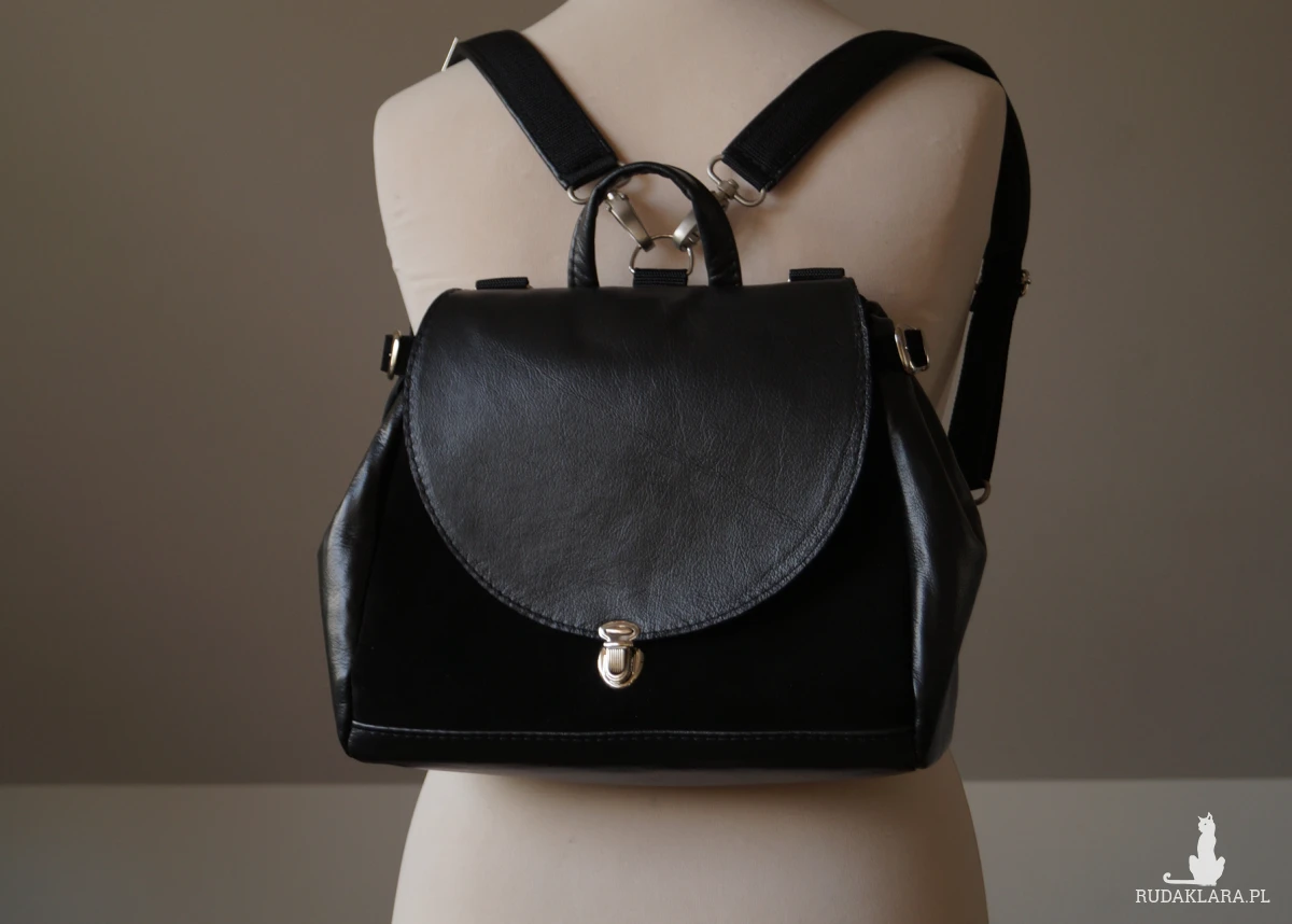 Teczka-kuferek z funkcją plecaka. Uszyta ze świetnej jakości skóry naturalnej, bydlęcej w kolorze czarnym (skóra licowa i zamsz).