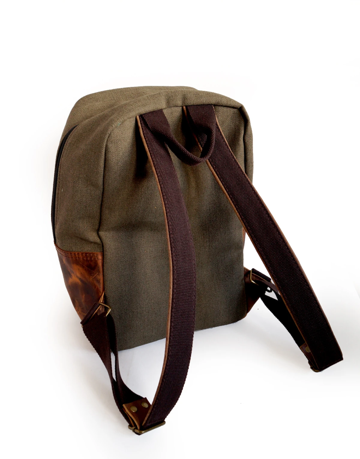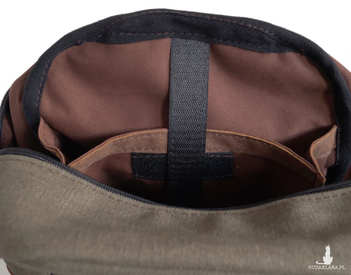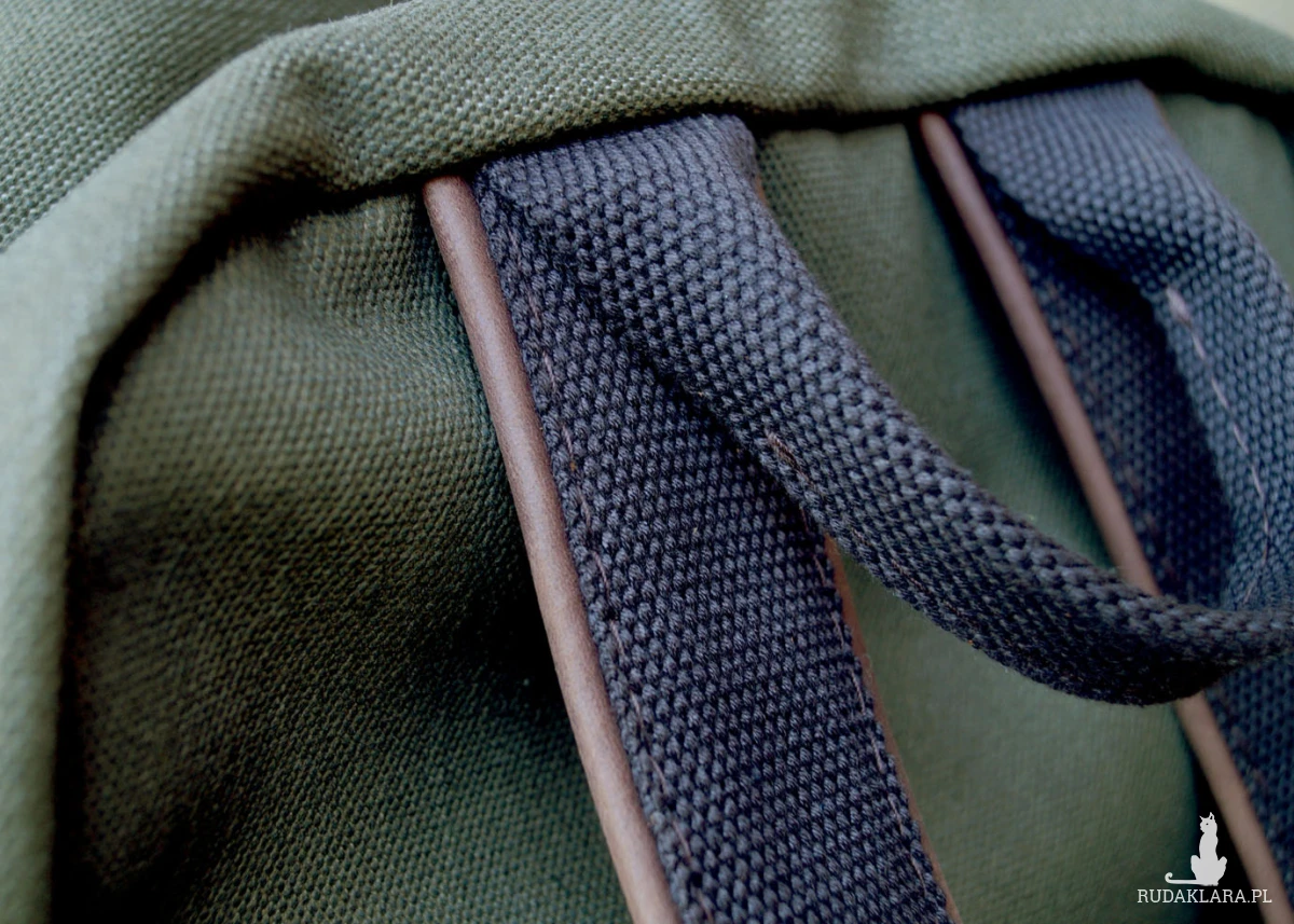 Uszyty z brezentu – wojskowej tkaniny wodoodpornej, oraz skóry naturalnej, woskowanej. Na zewnątrz dwie pojemne kieszenie, a wewnątrz brązowa podszewka, przegroda na laptop, spora kieszeń na zamek i dwie kieszenie otwarte.