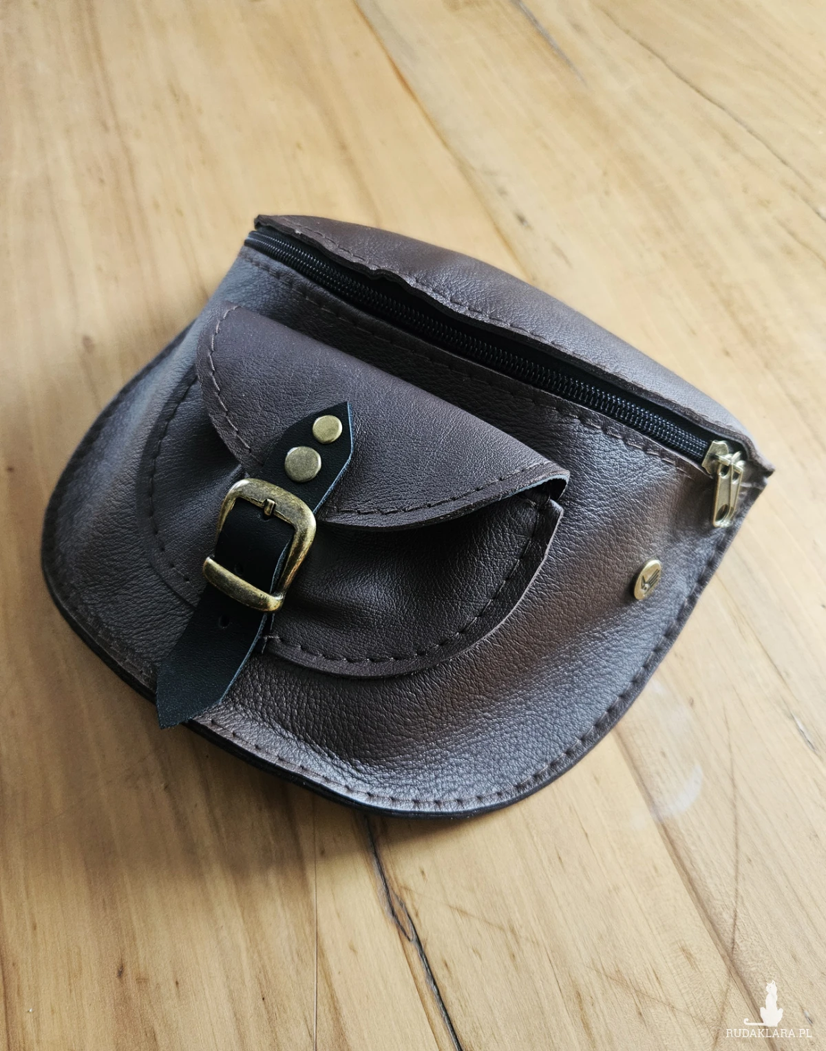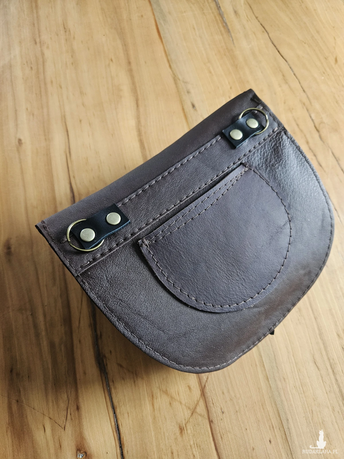 Praktyczna torebka na pas uszyta z brązowej skóry naturalnej, licowej w odcieniu ciemnej czekolady. Niewielka ale pojemna, pomieści telefon, portfel, chusteczki i najpotrzebniejsze kosmetyki. Z tyłu jedna, a z przodu dwie niewielkie kieszenie. Wewnątrz przegródka. Sprzedawana w komplecie z regulowanym paskiem zapinanym na karabińczyki. Można ją nosić również na ramieniu. Wymiary: 21/17cm.