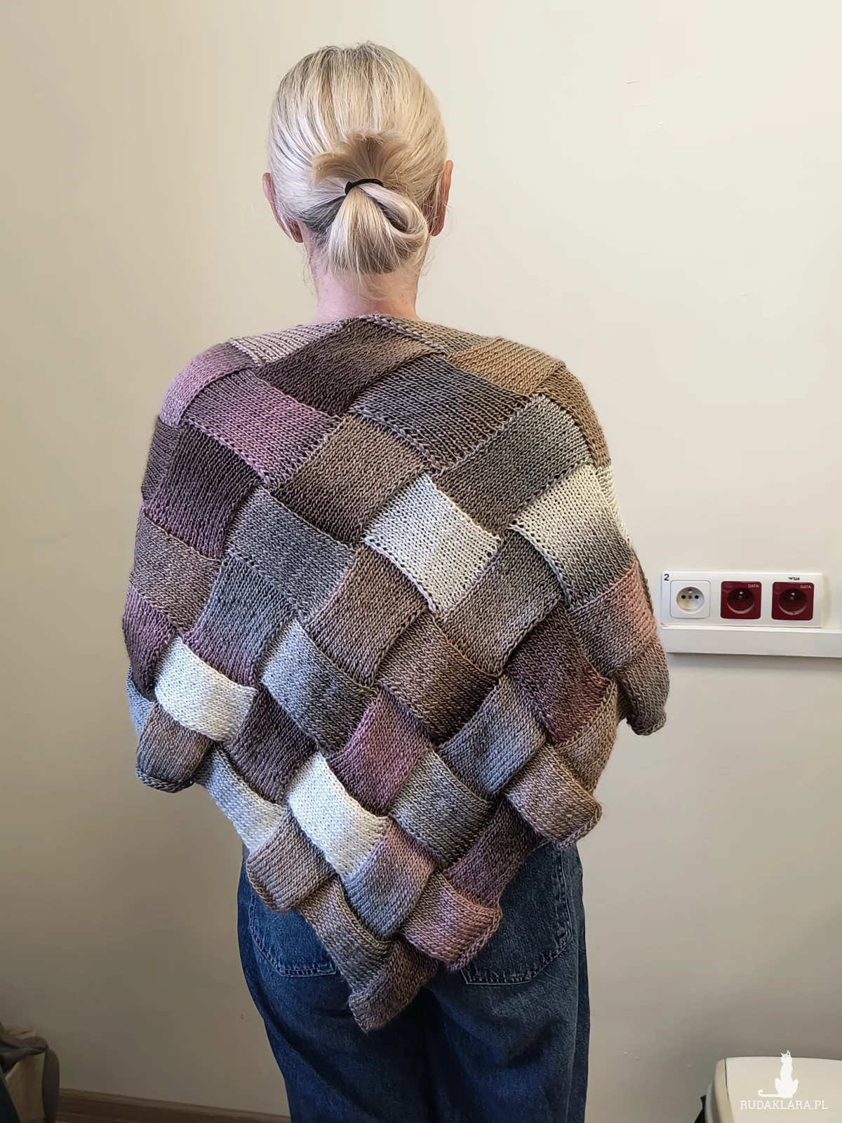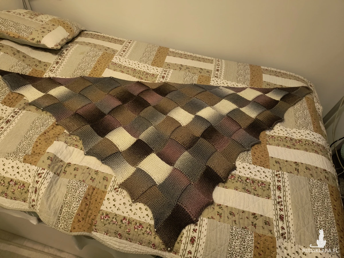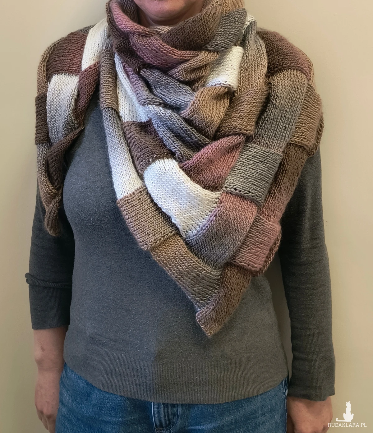Chusta robiona na drutach. Wełna z akrylem w kolorze ombre biel, szarość, brąz i róż.