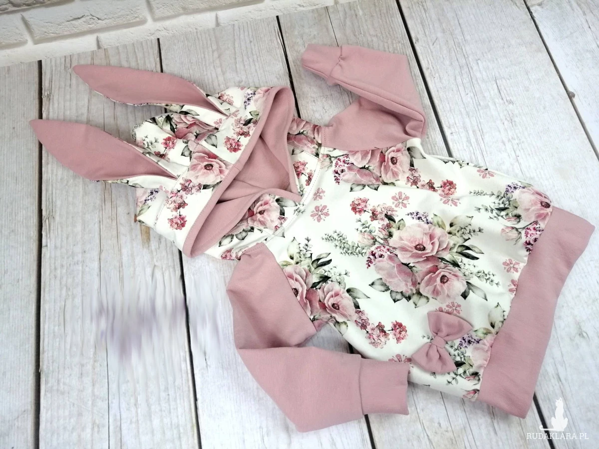 Bluza dziecięca z dresówki pętelki, z kapturem , wzór cyfrowy w kwiaty, połączony z dresówką jednolitą w kolorze brudnego różu.