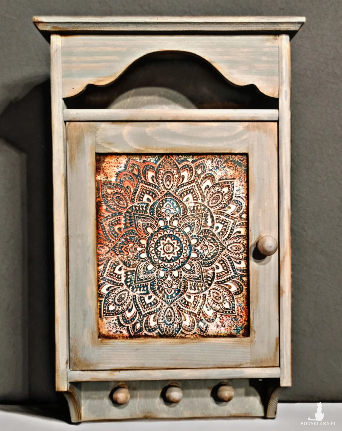 Drewniana skrzyneczka na klucze. Ozdobiona za pomocą techniki decoupage. Sześć haczyków na klucze wewnątrz skrzynki i trzy na zewnątrz.