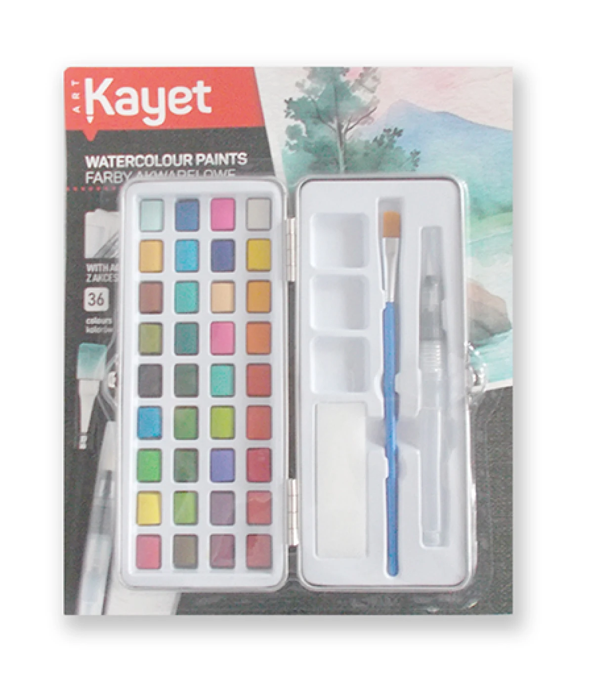 Oryginalny komplet farb akwarelowych w kasetce, 36 kolorów. Zestaw wraz z akcesoriami, marka "Kayet".