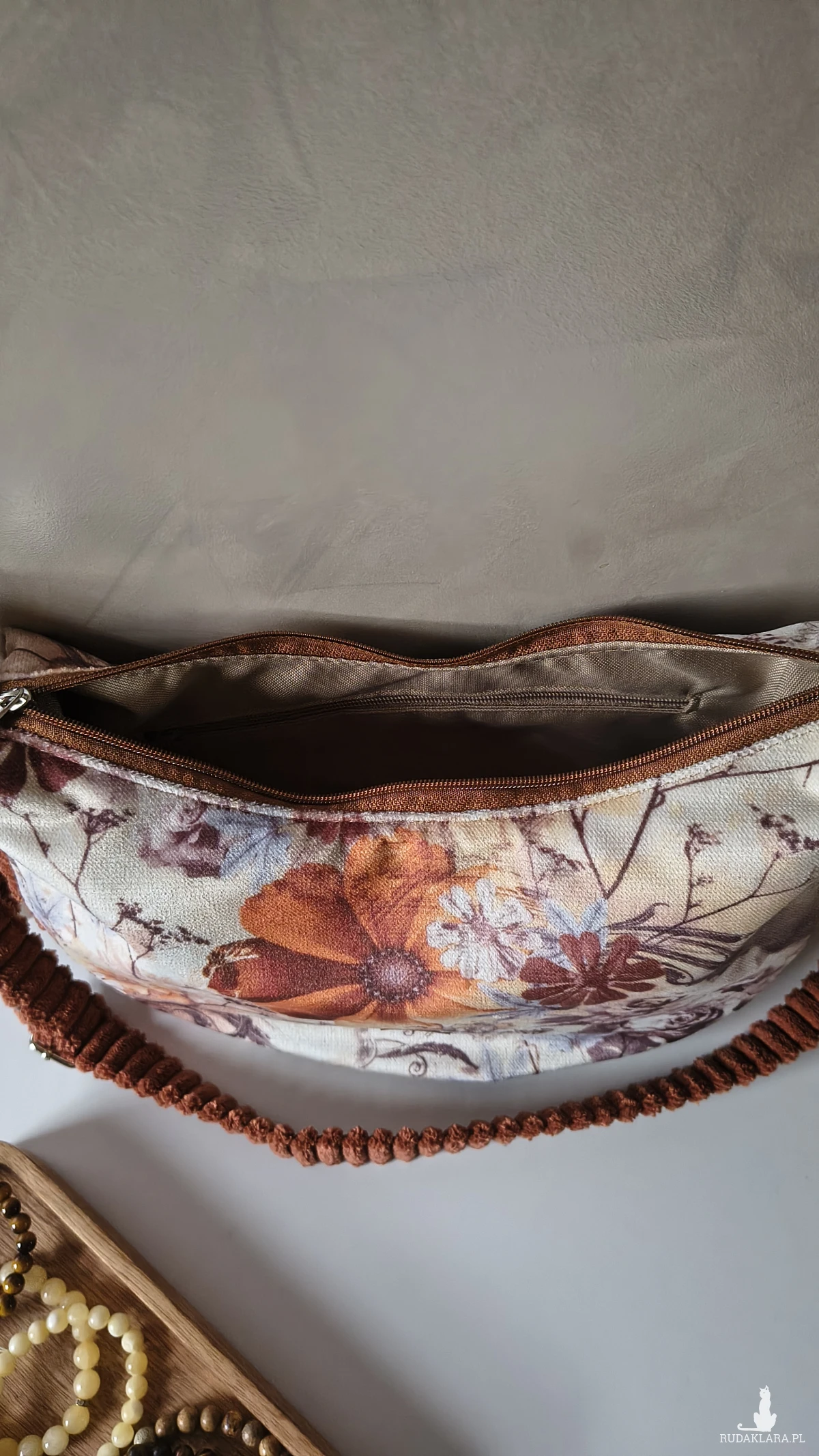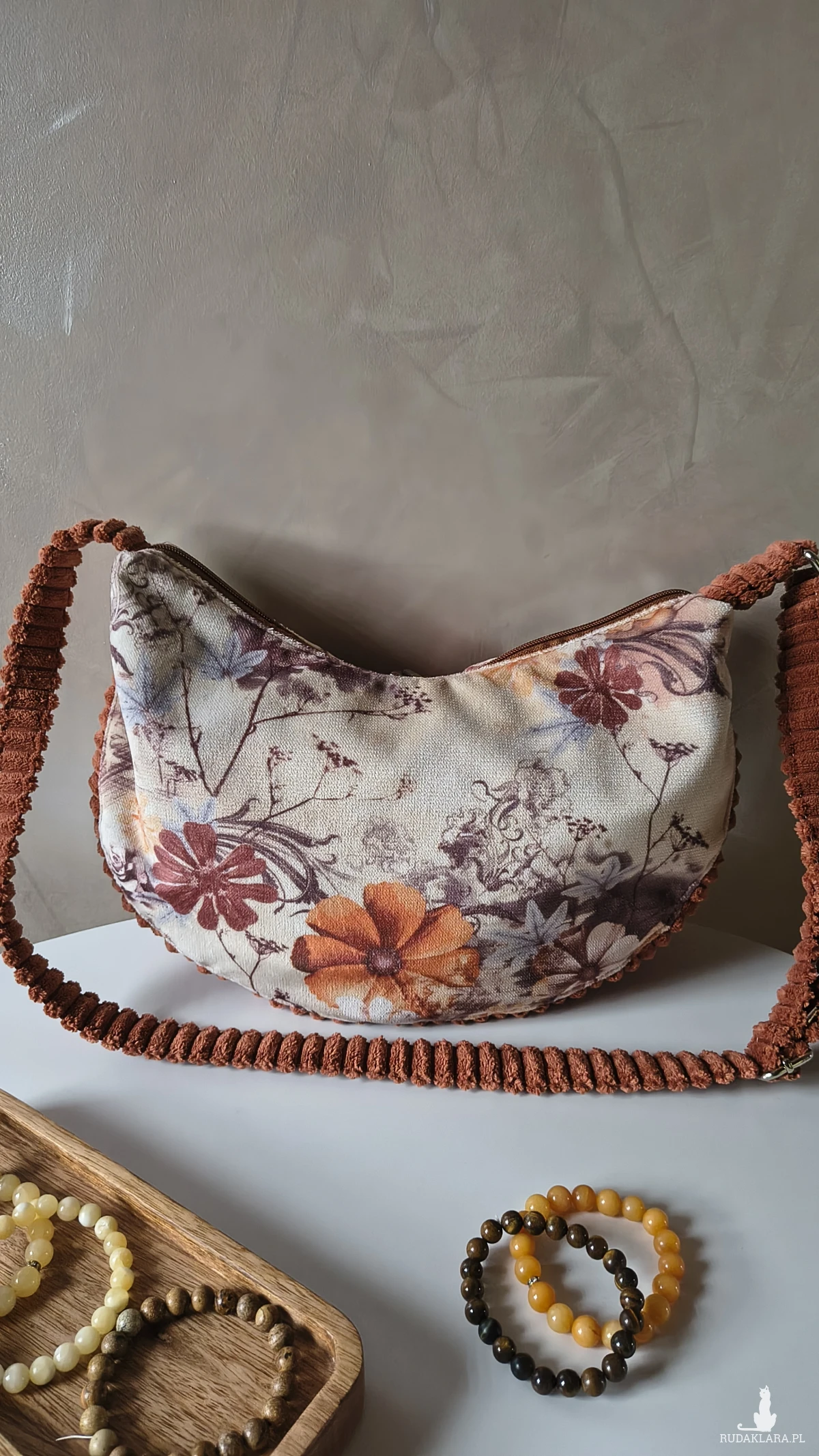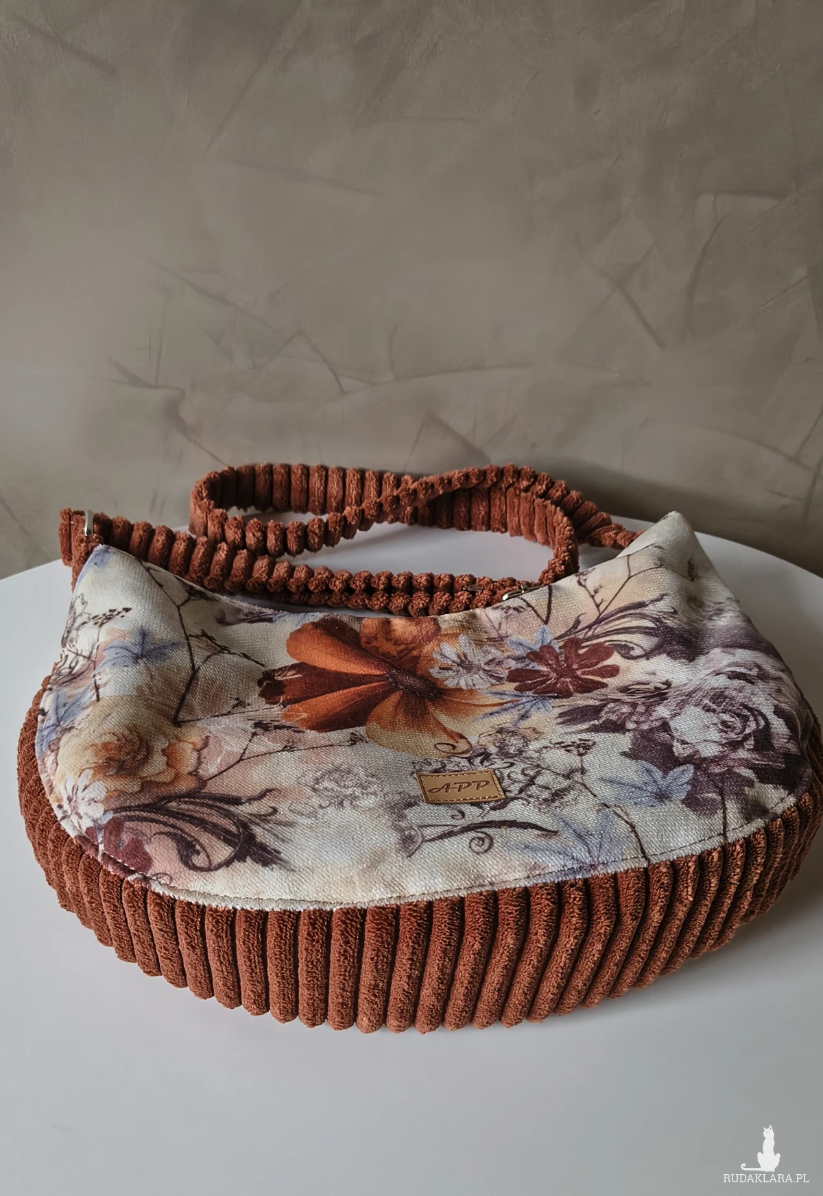 Powstała z materiałów tapicerskich, co gwarantuje jej wytrzymałość i długie użytkowanie. Tył i przód torby to welur , a dno i pasek wykonane są ze sztruksu. Wewnątrz znajduje się wodoodporna podszewka z kieszonką na zamek. Pasek regulowany, wykonany ze sztruksu, a więc delikatny dla naszego ciała. Torbę można nosić na ramieniu lub przez ramię. Okucia srebrne, niklowane.
