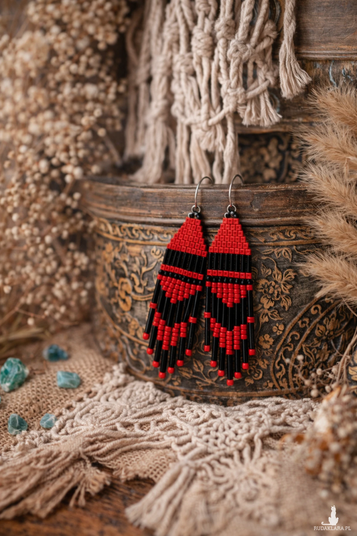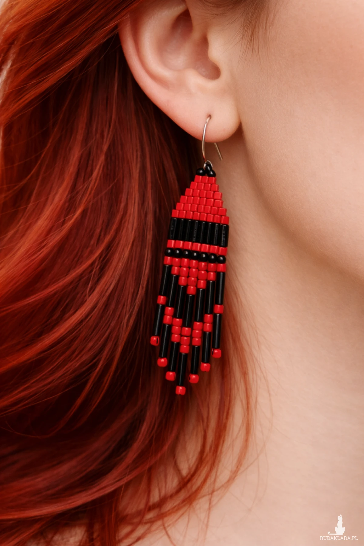 Oryginalne kolczyki etno stworzone z drobnych koralików w klasycznym zestawieniu czerwieni i czerni. Geometryczny wzór oraz efektowne frędzle sprawiają, że biżuteria przyciąga wzrok i podkreśla indywidualny styl.