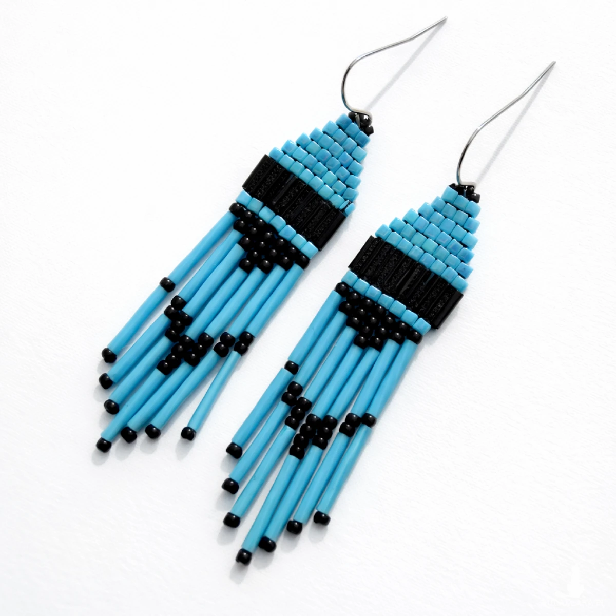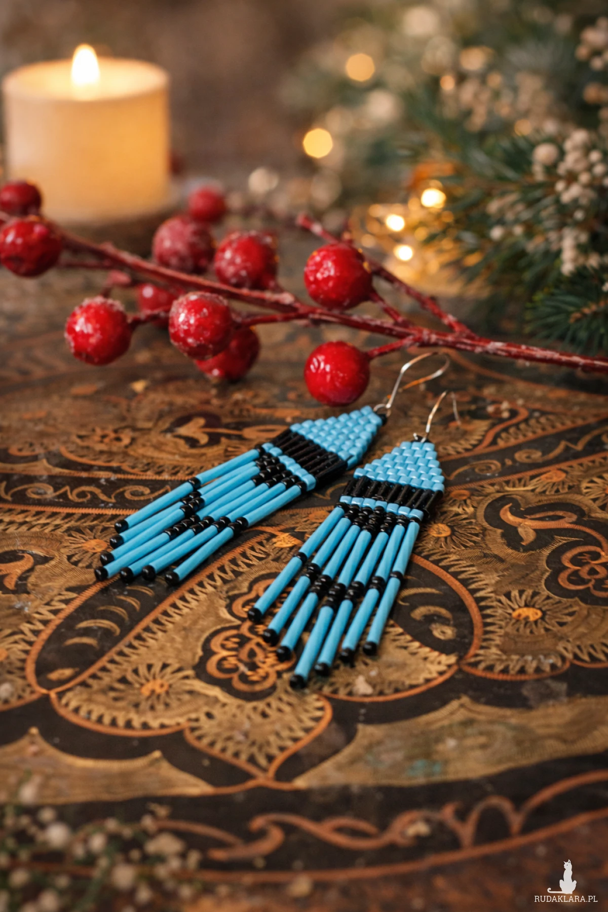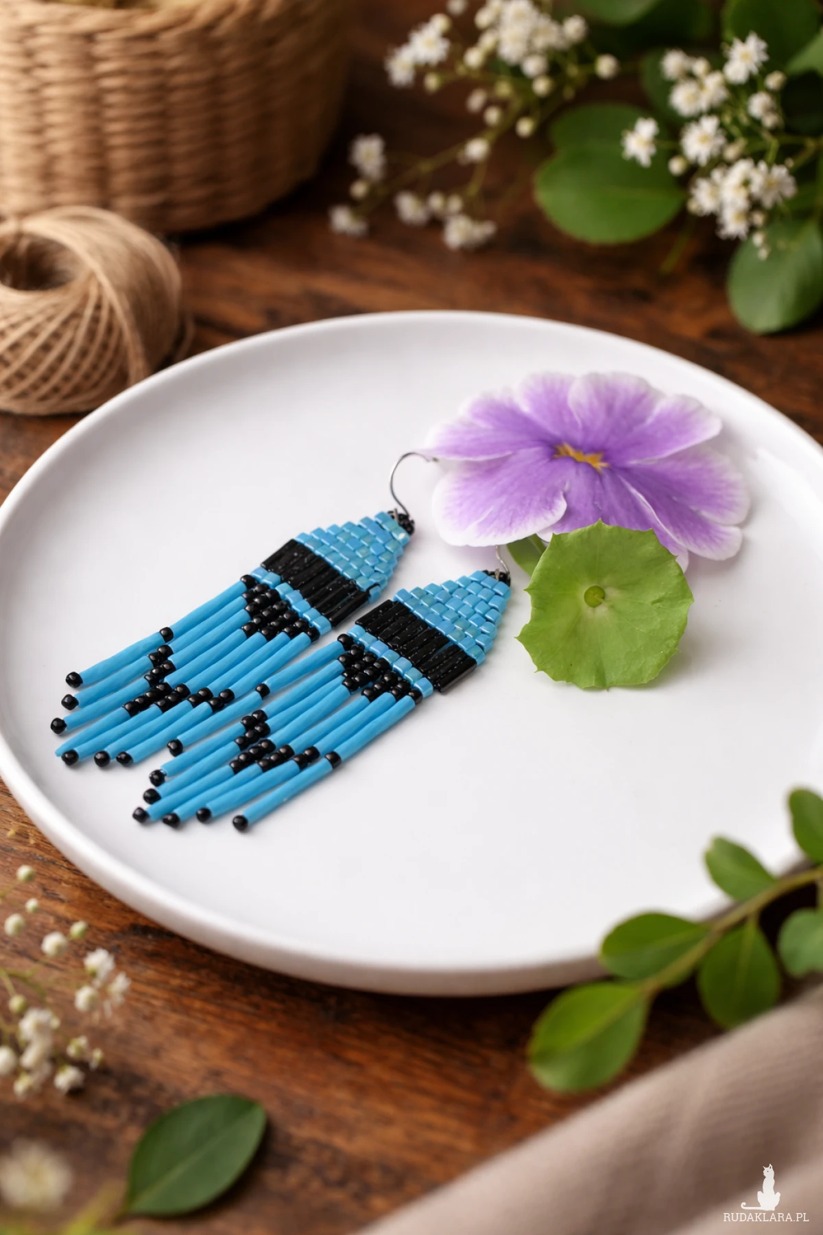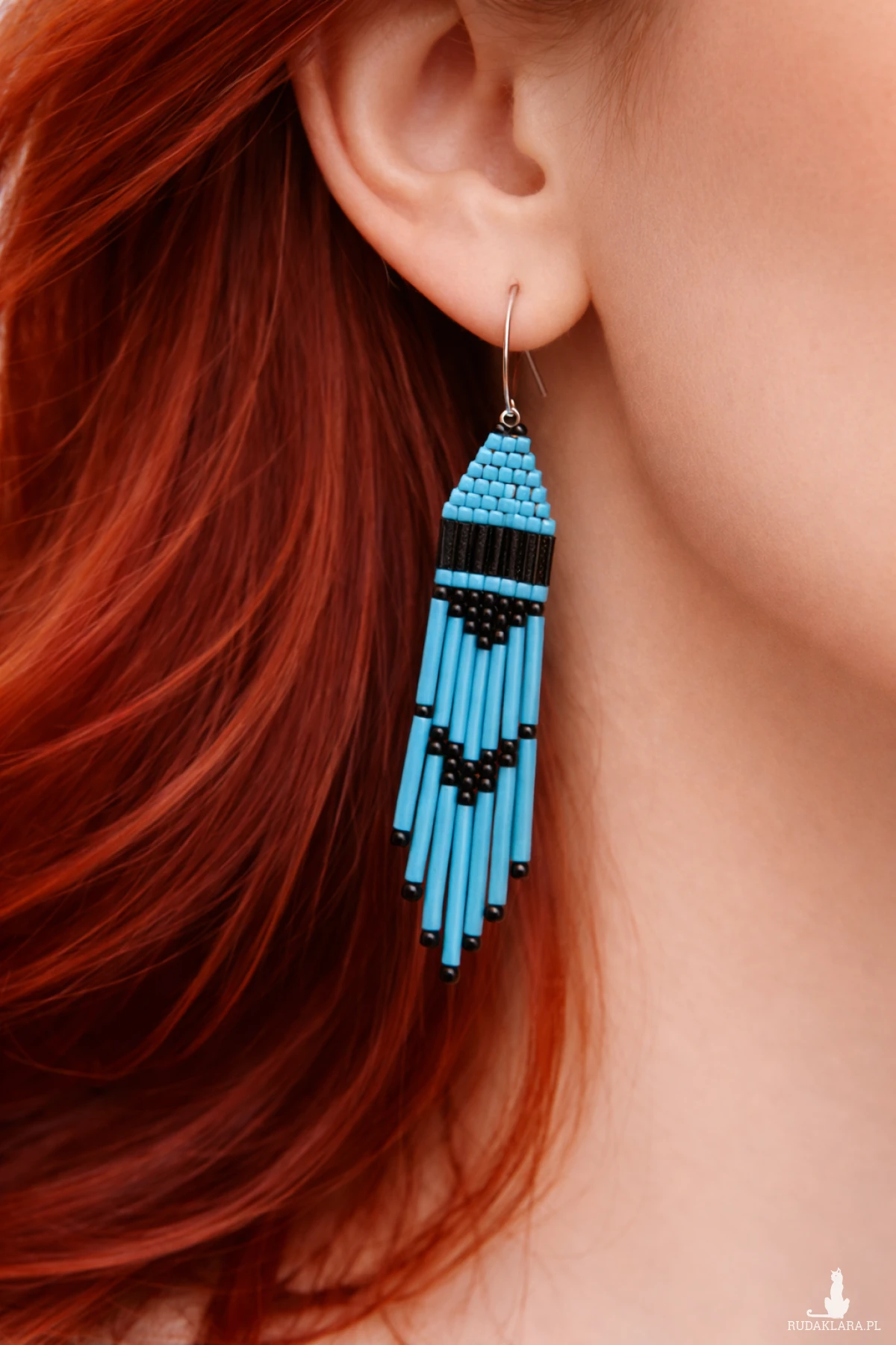 Ręcznie wykonane kolczyki etno z drobnych koralików w odcieniach turkusu i czerni to oryginalny dodatek dla kobiet ceniących biżuterię handmade. Geometryczny wzór oraz długie frędzle nadają im lekkości i wyjątkowego charakteru.